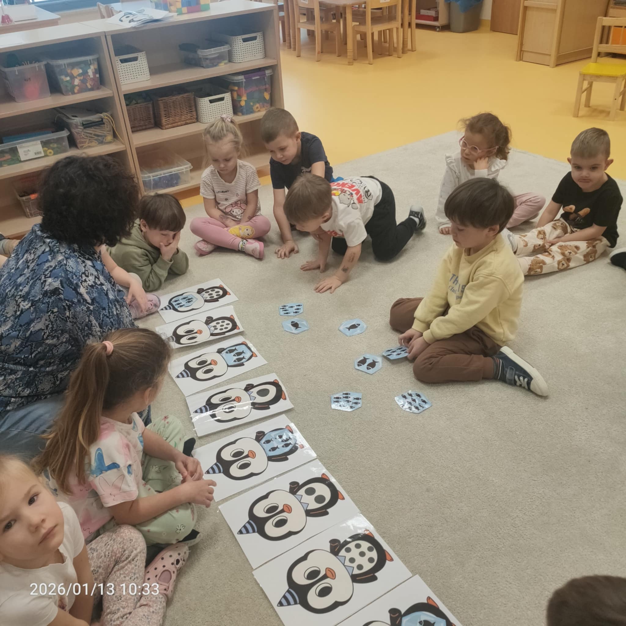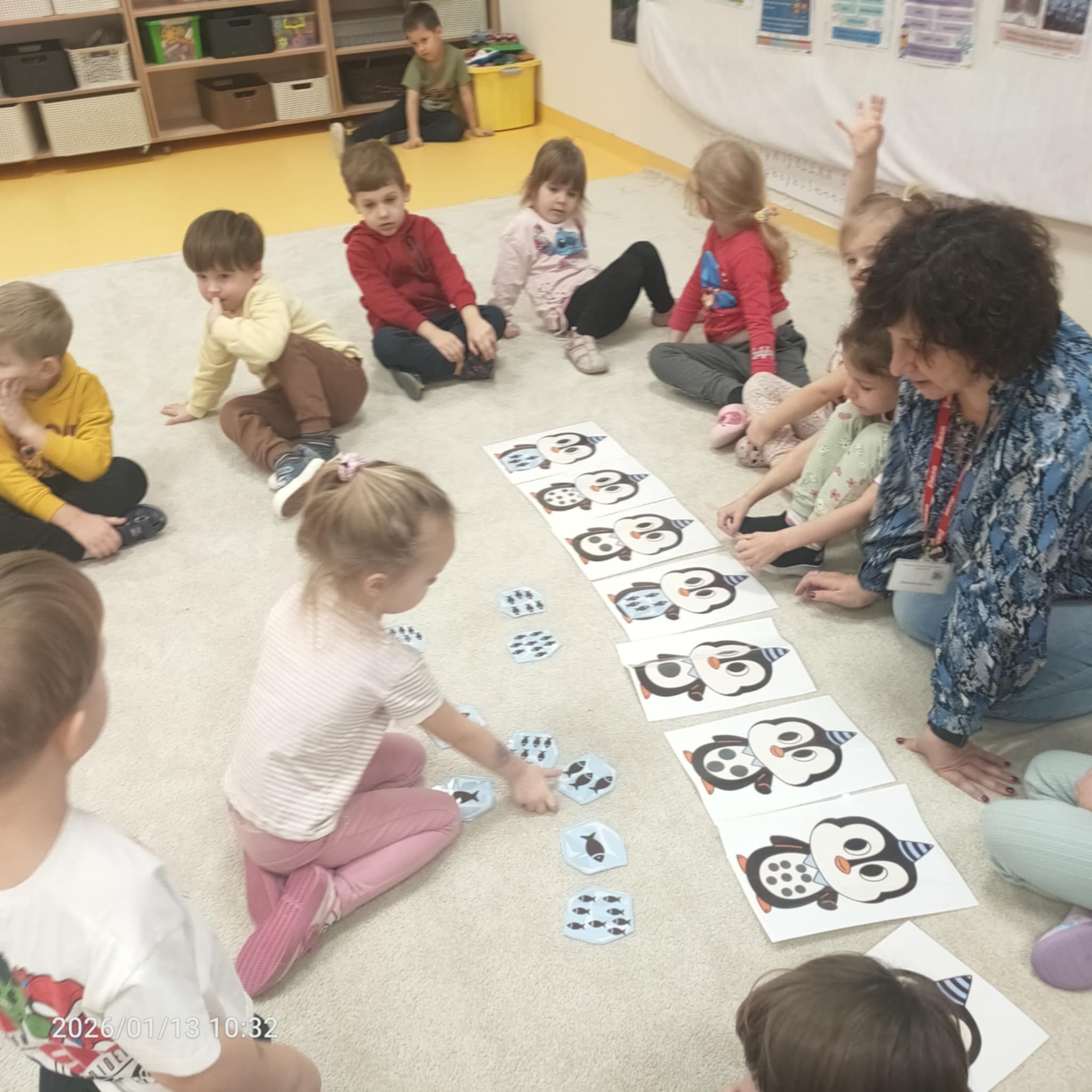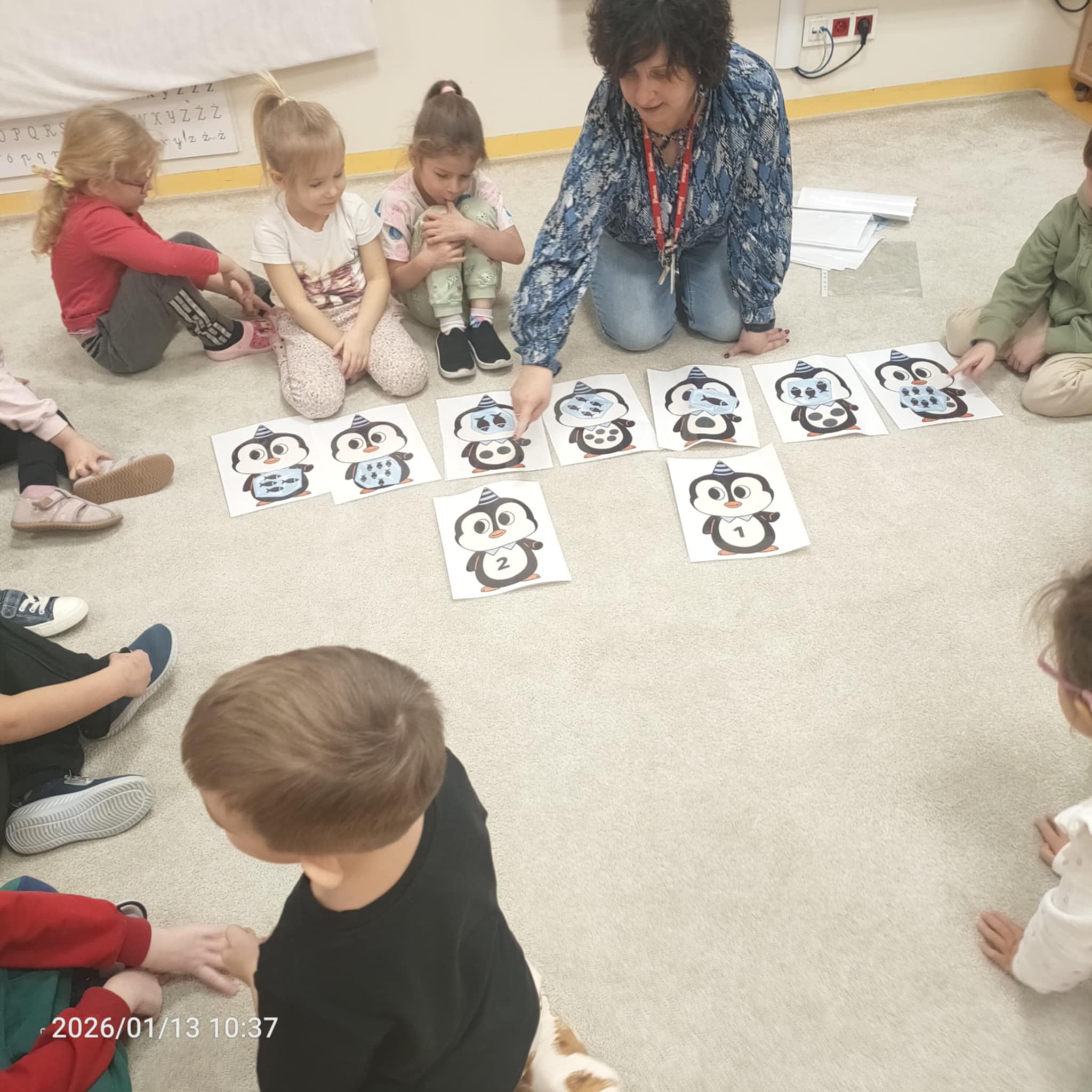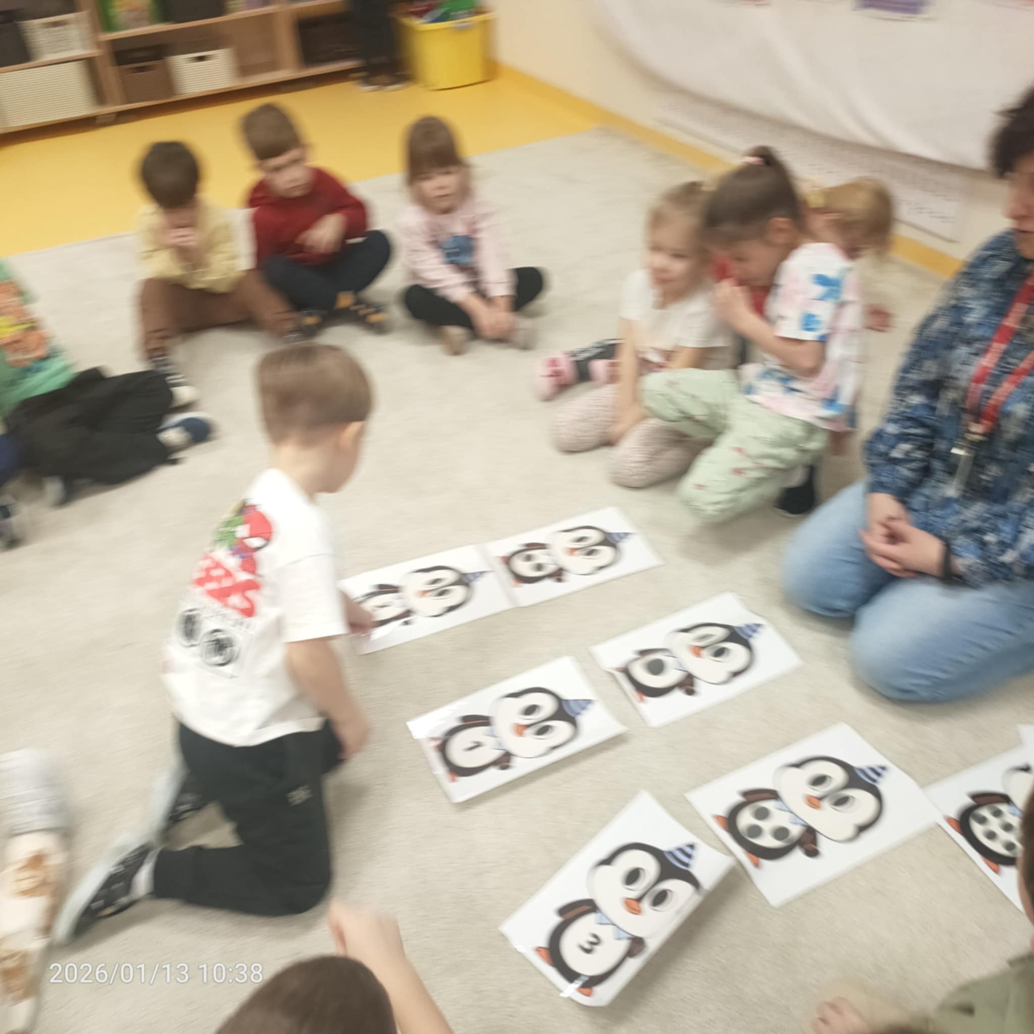 Dzieci w naszej grupie świetnie rozwijają swoje umiejętności liczenia poprzez ciekawe i angażujące zajęcia! Podczas zajęć dzieci liczyły kropki na pingwinkach, co pomogło im ćwiczyć rozpoznawanie i zapamiętywanie liczebników. Następnie miały za zadanie dopasować do nich odpowiednią liczbę rybek, aby ilości się zgadzały.Dzieci poznały figury geometryczne oraz różne kształty. Miały okazję dopasować kształt do pingwinka-balonika oraz znaleźć na sali trójkąt, kwadrat i koło. To wspaniała zabawa, która pomaga rozwijać spostrzegawczość i umiejętność rozpoznawania figur.