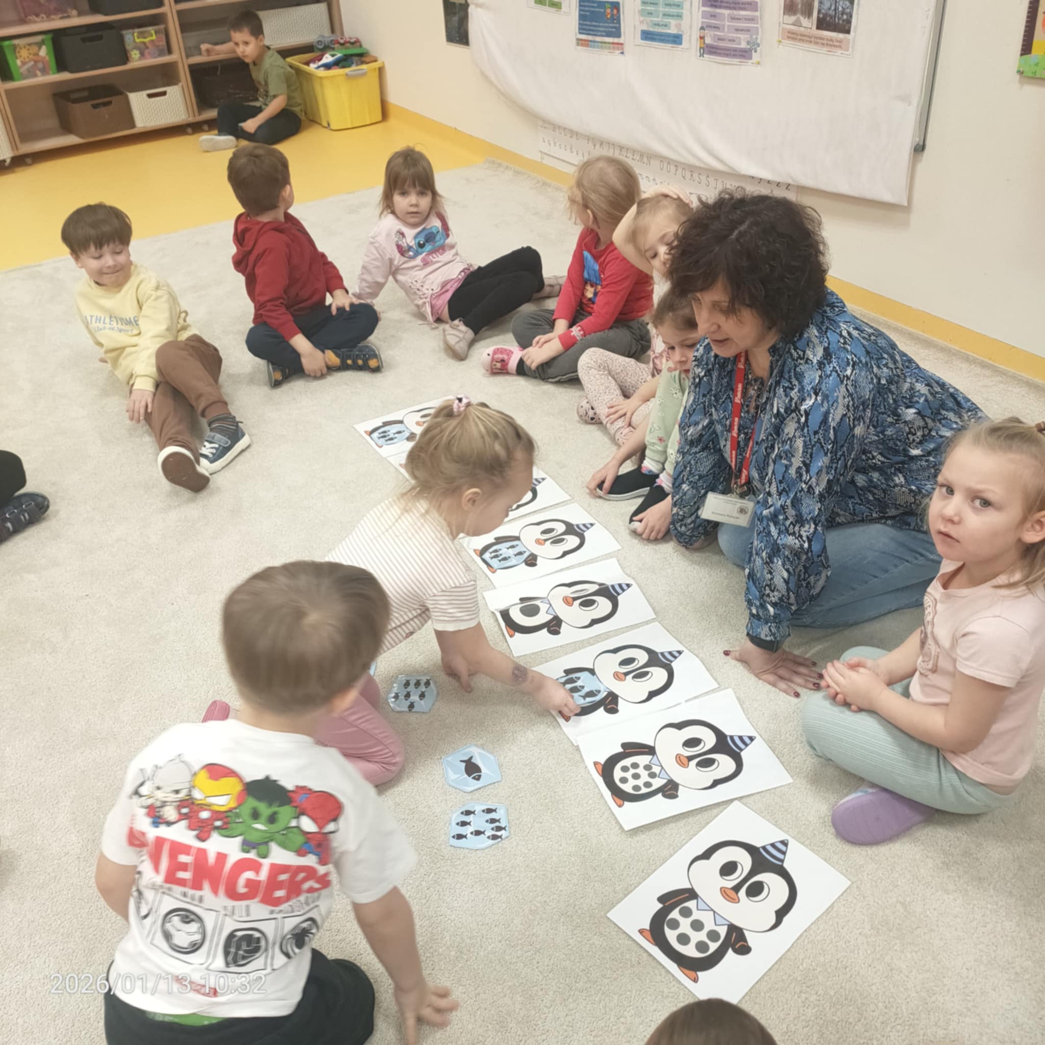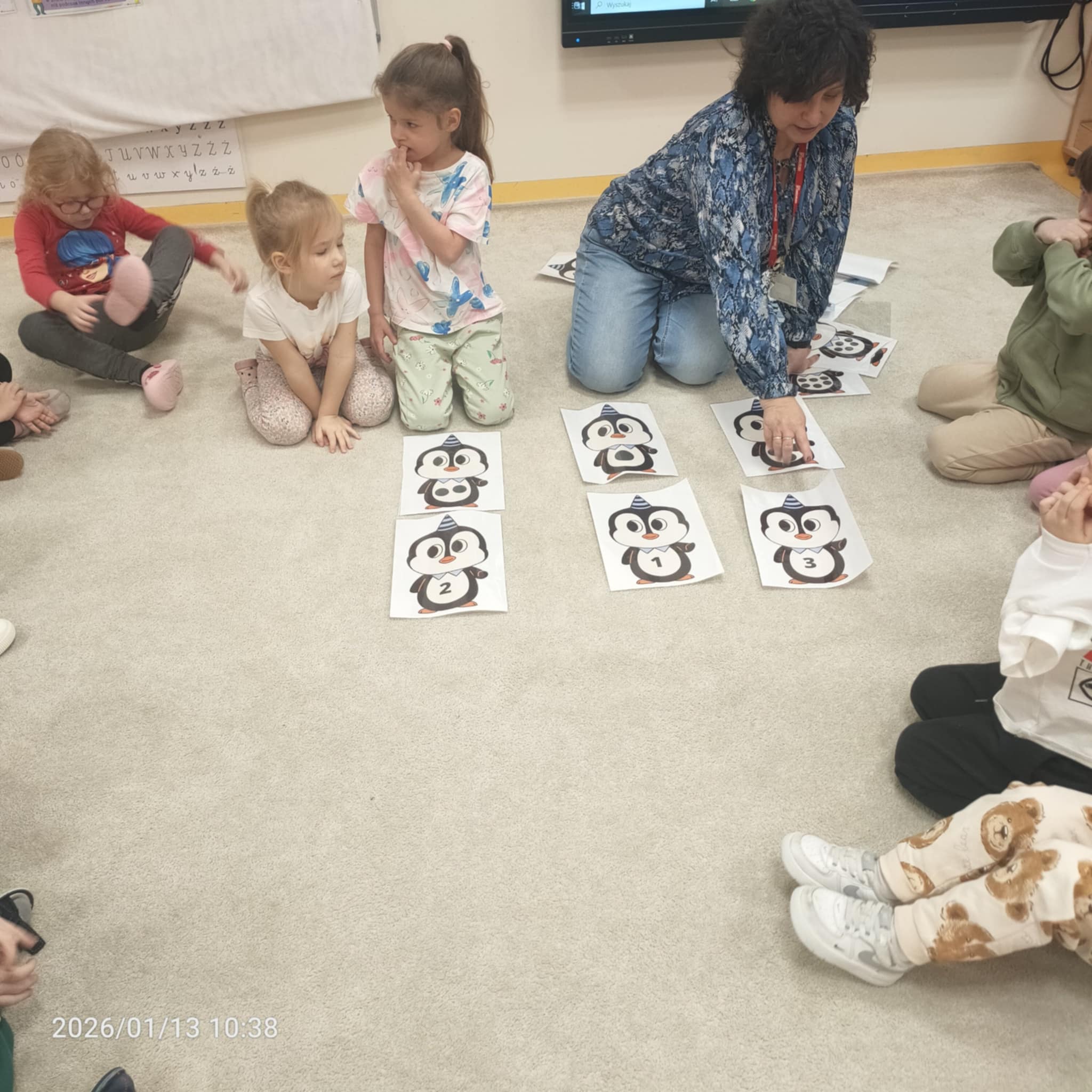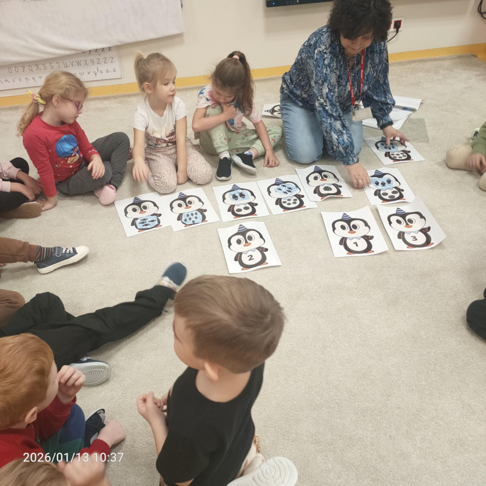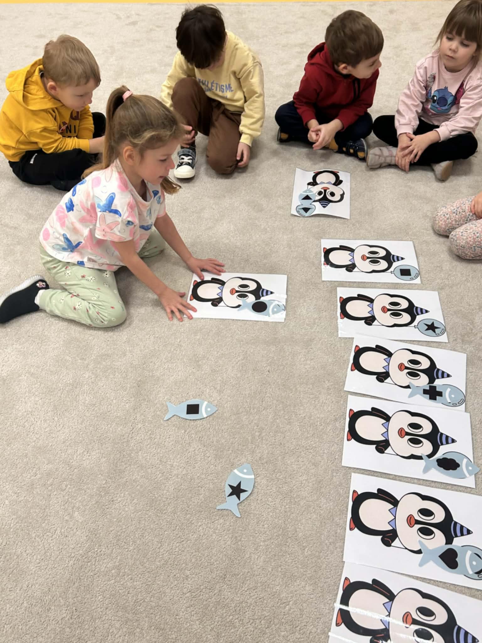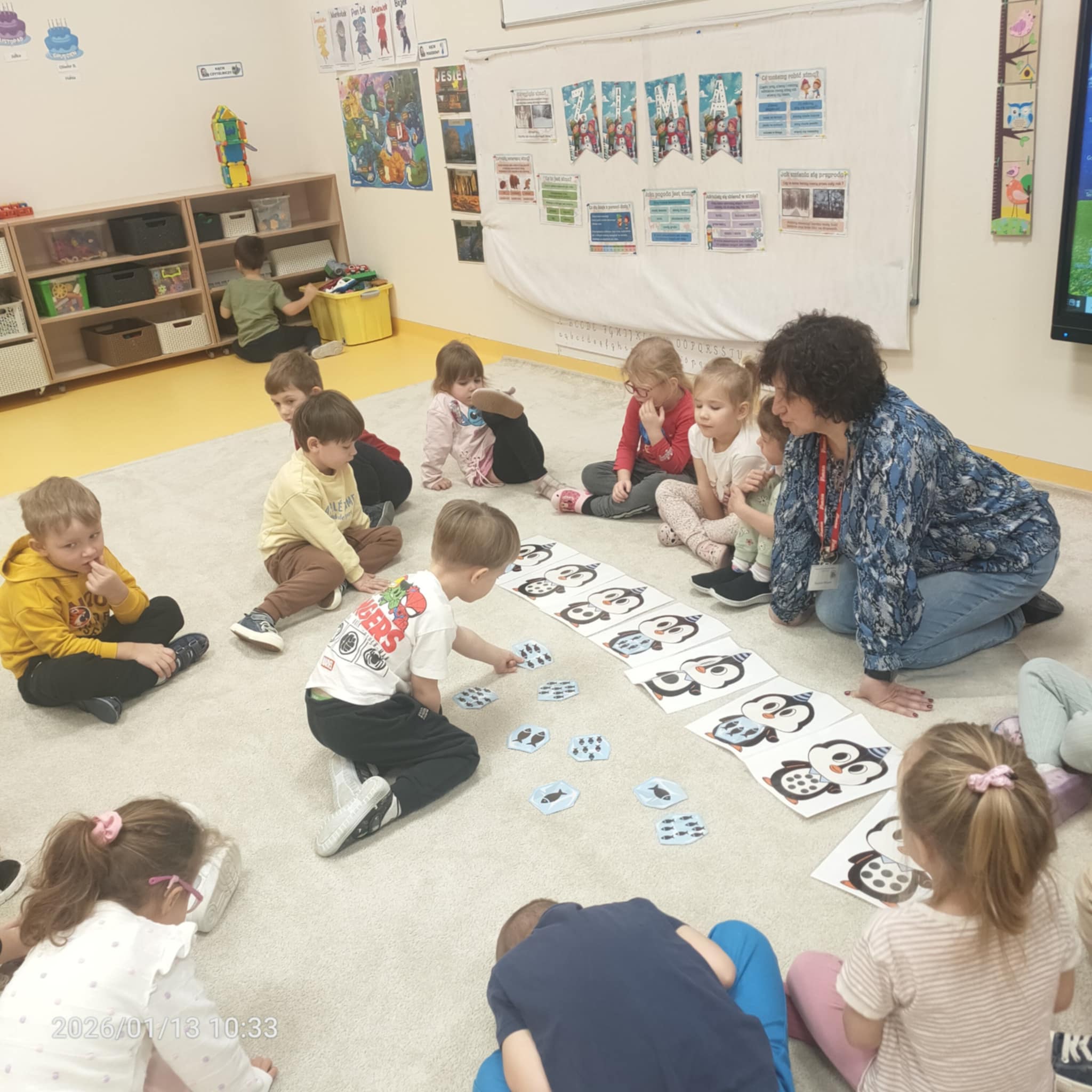 Dzieci w naszej grupie świetnie rozwijają swoje umiejętności liczenia poprzez ciekawe i angażujące zajęcia! Podczas zajęć dzieci liczyły kropki na pingwinkach, co pomogło im ćwiczyć rozpoznawanie i zapamiętywanie liczebników. Następnie miały za zadanie dopasować do nich odpowiednią liczbę rybek, aby ilości się zgadzały.Dzieci poznały figury geometryczne oraz różne kształty. Miały okazję dopasować kształt do pingwinka-balonika oraz znaleźć na sali trójkąt, kwadrat i koło. To wspaniała zabawa, która pomaga rozwijać spostrzegawczość i umiejętność rozpoznawania figur.