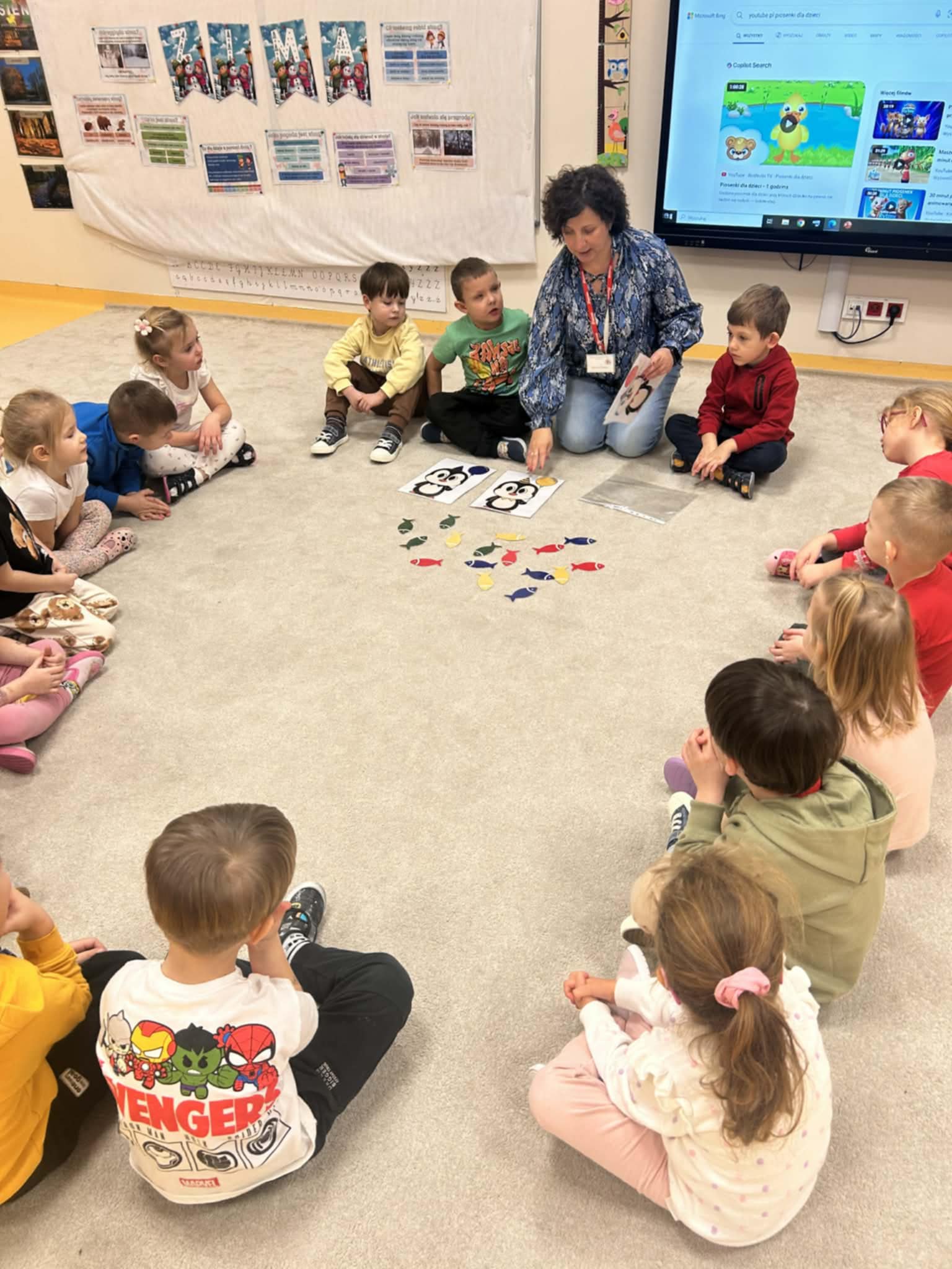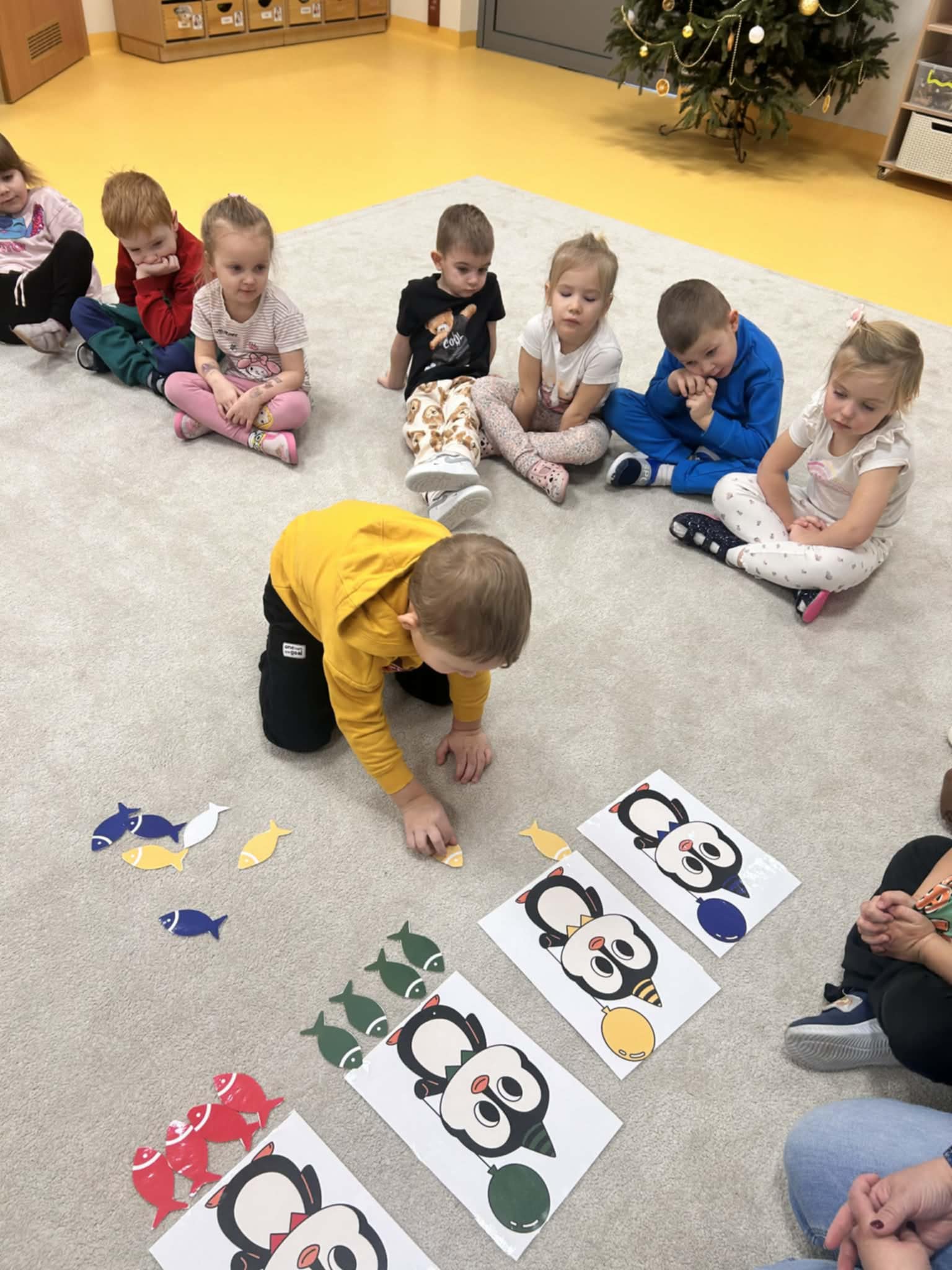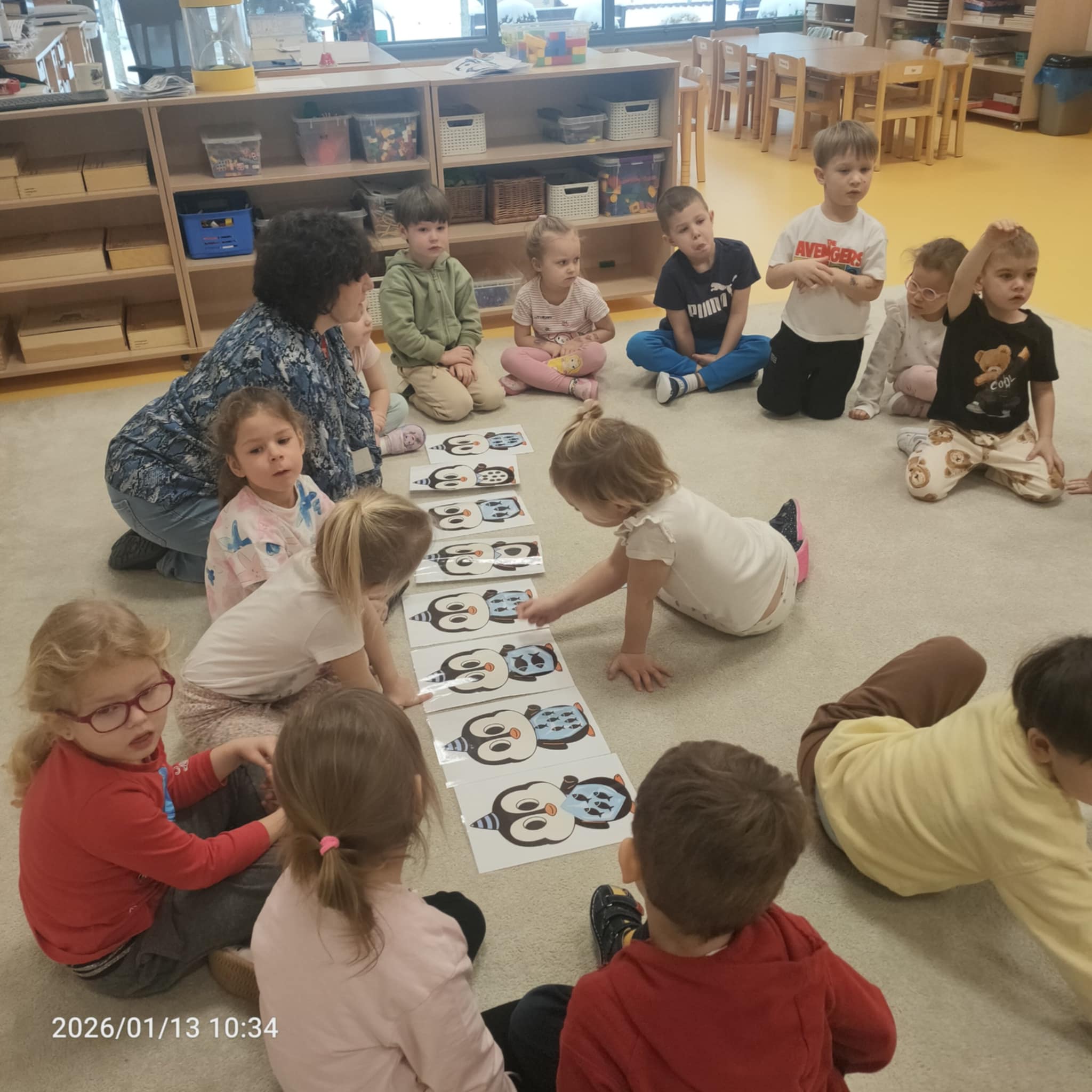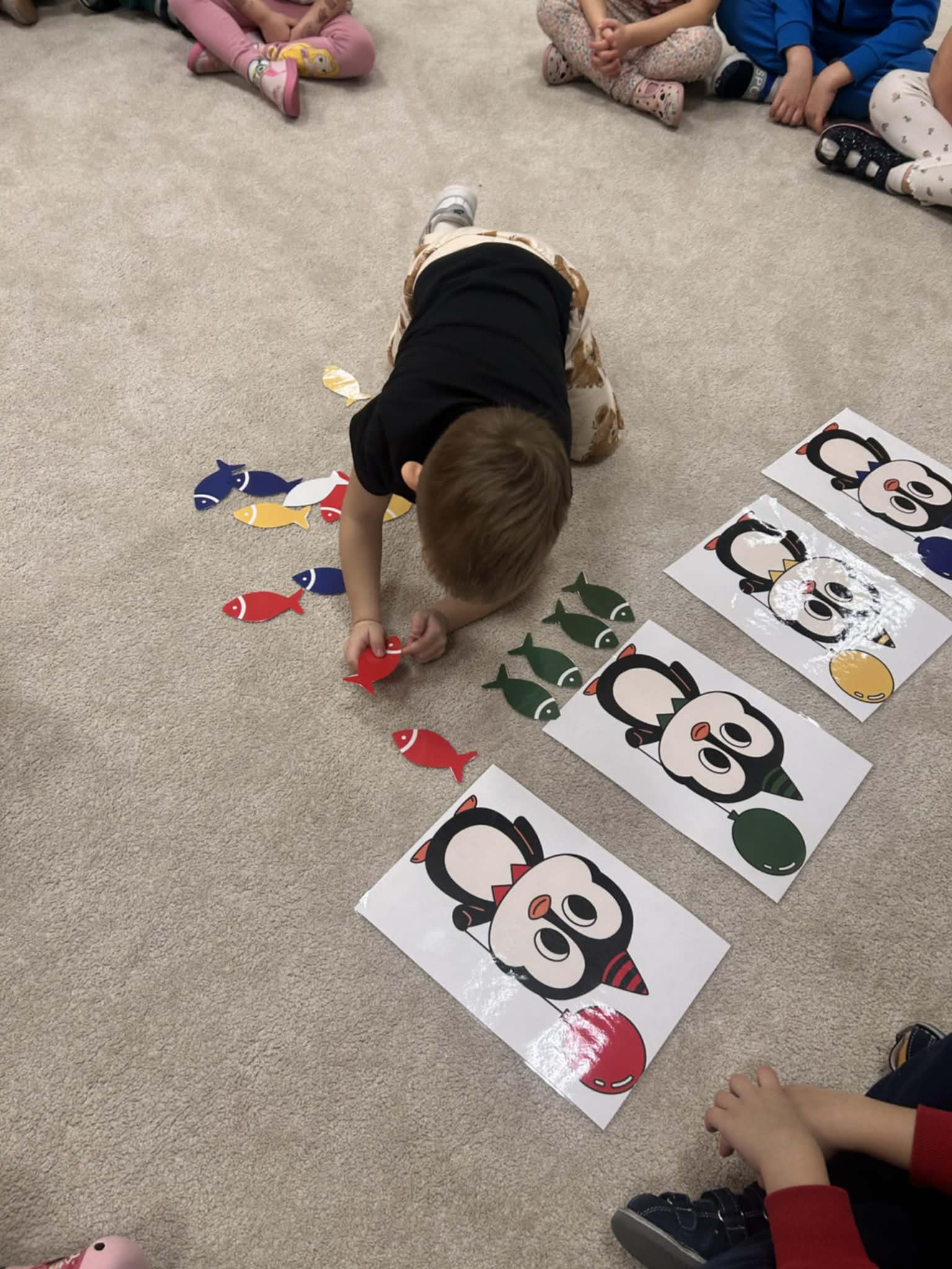 Dzieci w naszej grupie świetnie rozwijają swoje umiejętności liczenia poprzez ciekawe i angażujące zajęcia! Podczas zajęć dzieci liczyły kropki na pingwinkach, co pomogło im ćwiczyć rozpoznawanie i zapamiętywanie liczebników. Następnie miały za zadanie dopasować do nich odpowiednią liczbę rybek, aby ilości się zgadzały.Dzieci poznały figury geometryczne oraz różne kształty. Miały okazję dopasować kształt do pingwinka-balonika oraz znaleźć na sali trójkąt, kwadrat i koło. To wspaniała zabawa, która pomaga rozwijać spostrzegawczość i umiejętność rozpoznawania figur.