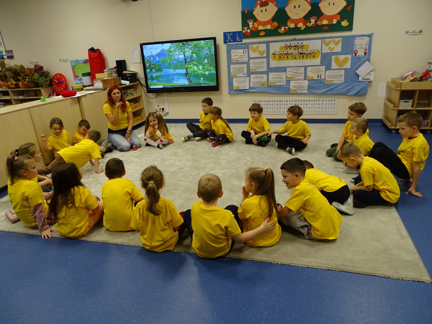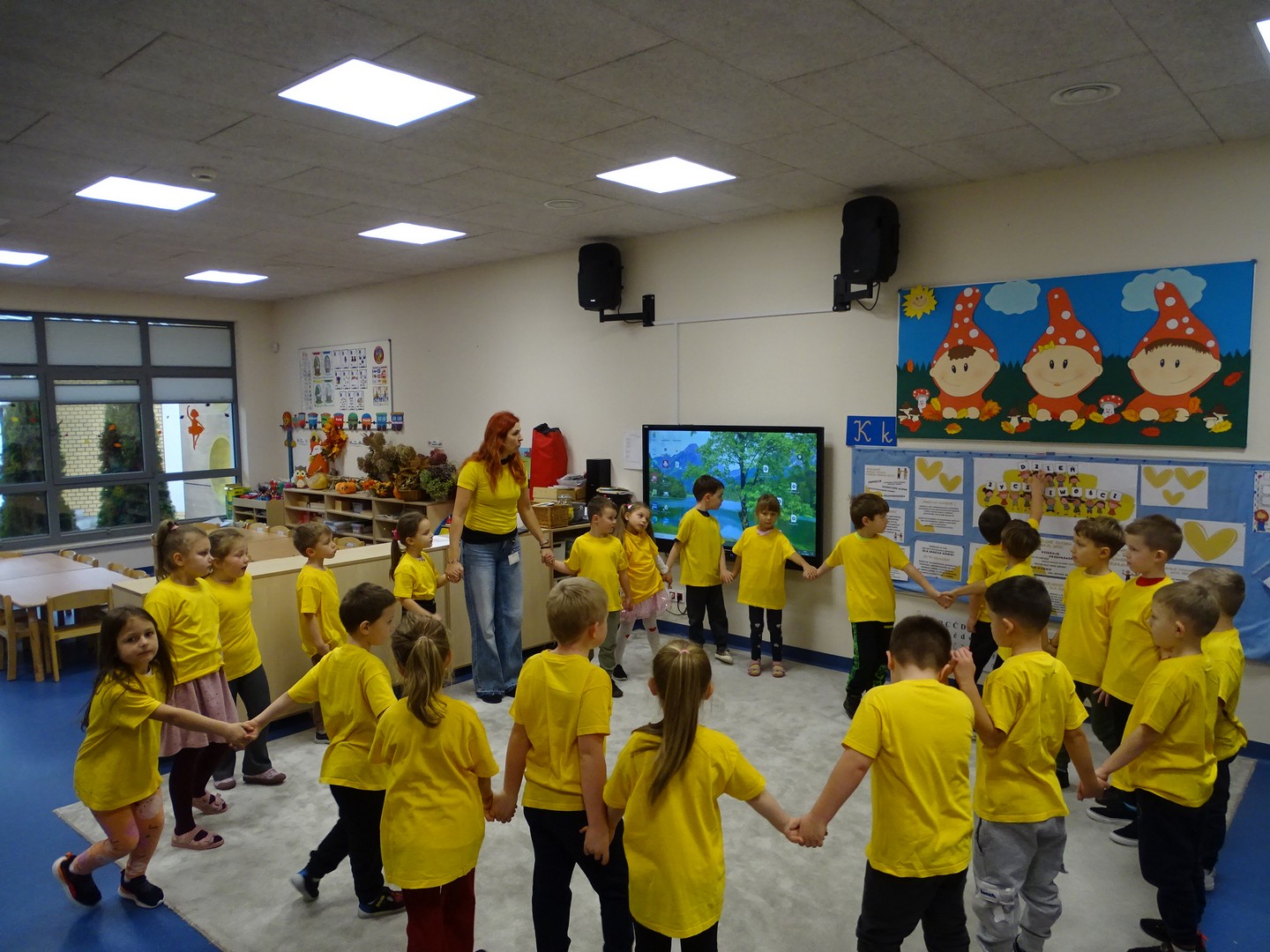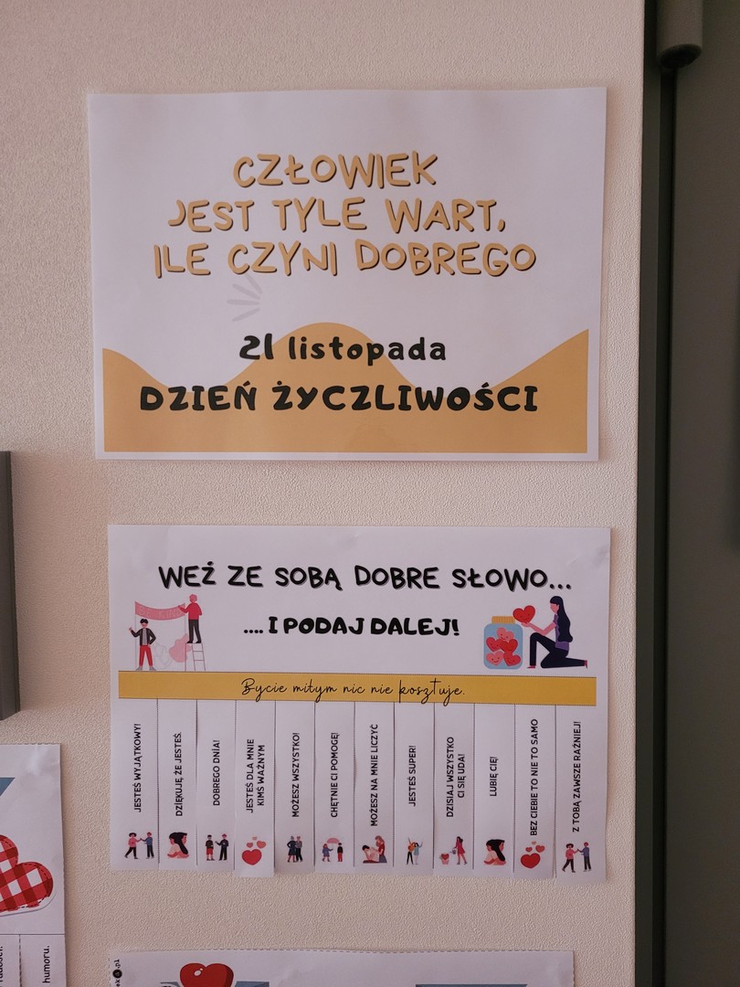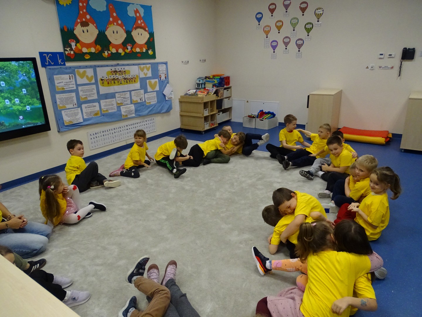21 listopada w naszej grupie obchodziliśmy Dzień Życzliwości i Pozdrowień. Był to wyjątkowy czas, pełen uśmiechów, dobrej energii i serdecznych gestów. Na początku dzieci usiadły w kręgu i przekazując sobie serduszko, mówiły kolegom i koleżankom miłe słowa. Wspólnie tańczyliśmy do „Piosenki bardzo kulturalnej”, a następnie przedszkolaki rozwiązywały zagadki i krzyżówki związane z tematem życzliwości. Nie zabrakło także uścisków i wzajemnych przytuleń. Dużo radości sprawiło dzieciom losowanie ze „Słoika Życzliwości”. W środku znajdowały się zadania do wykonania, np.: narysuj komuś laurkę, zaproś kolegę lub koleżankę do wspólnej zabawy, powiedz komuś coś miłego. Rozmawialiśmy także o tym, że życzliwość jest ważna każdego dnia, nie tylko podczas wyjątkowych okazji. Na zakończenie dzieci odrysowywały swoje dłonie, wycinały je i tworzyły z nich Girlandę Przyjaźni i Życzliwości. Przy wejściu do sali przygotowaliśmy również karteczki z dobrymi słowami do oderwania — każdy mógł zabrać ze sobą drobny, życzliwy gest i podzielić się nim z kimś bliskim. To był naprawdę miły, radosny dzień, pełen ciepła, dobroci i wzajemnej życzliwości.