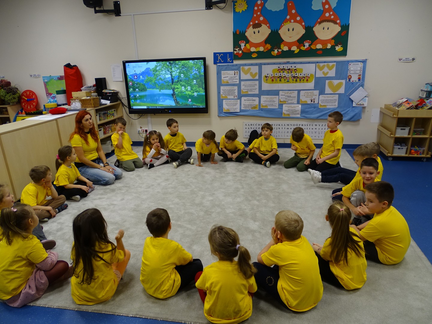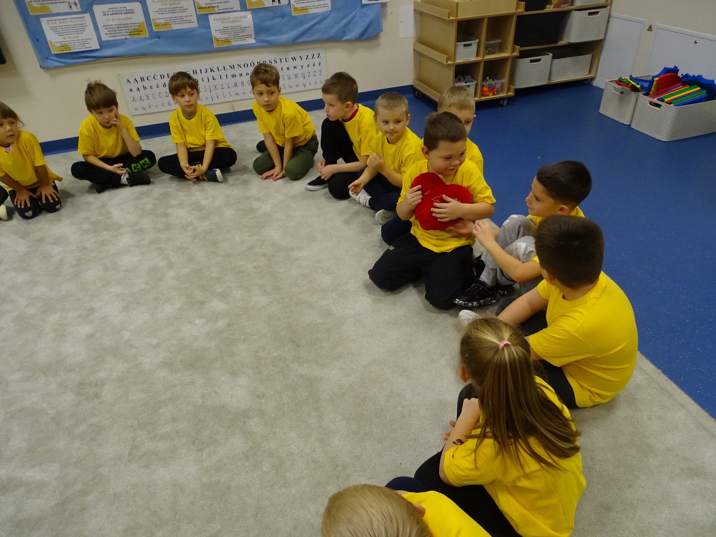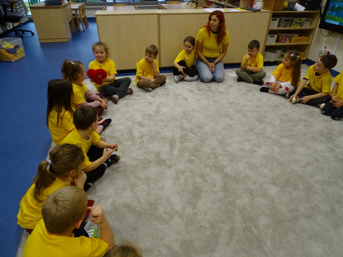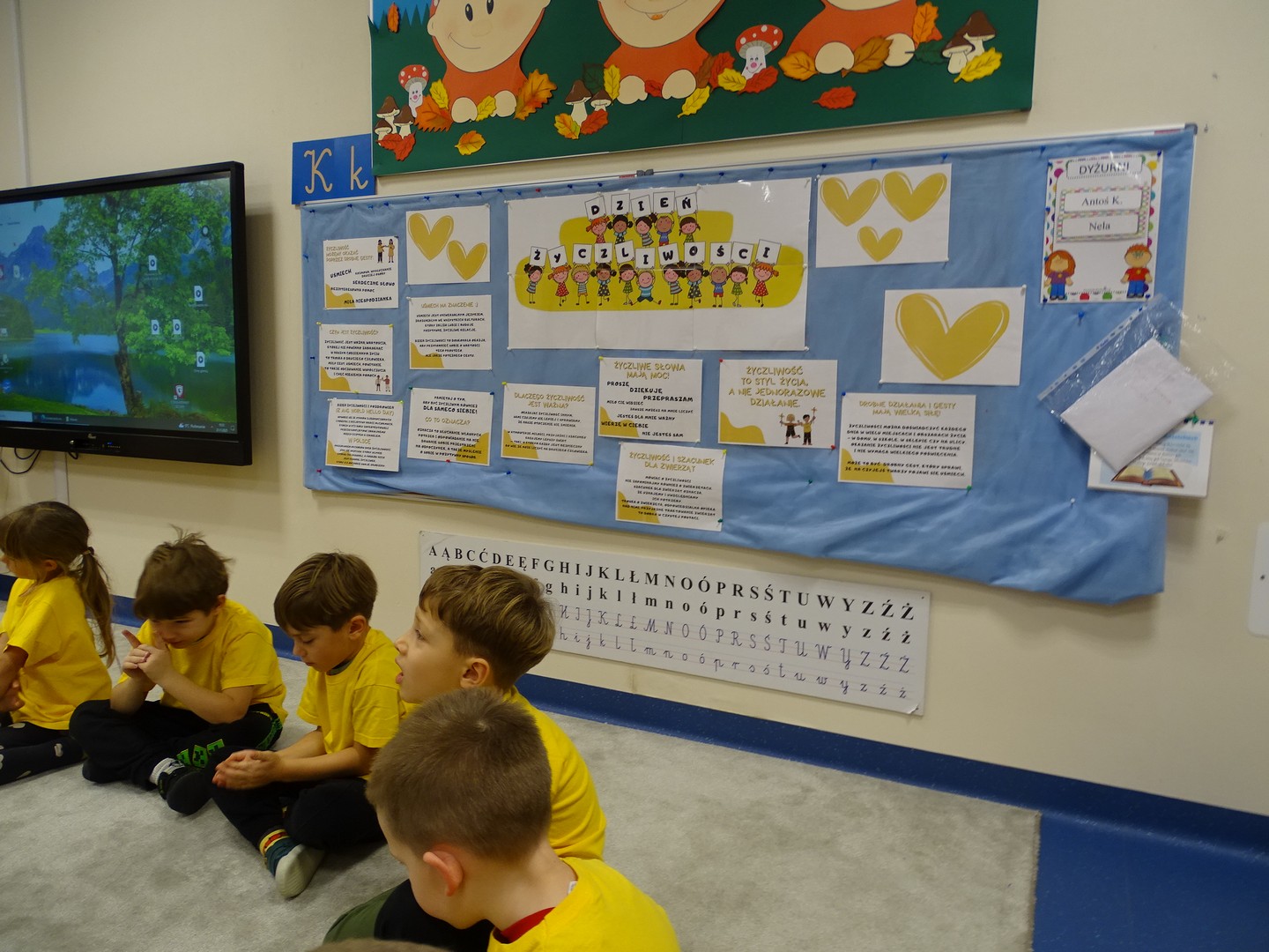 21 listopada w naszej grupie obchodziliśmy Dzień Życzliwości i Pozdrowień. Był to wyjątkowy czas, pełen uśmiechów, dobrej energii i serdecznych gestów. Na początku dzieci usiadły w kręgu i przekazując sobie serduszko, mówiły kolegom i koleżankom miłe słowa. Wspólnie tańczyliśmy do „Piosenki bardzo kulturalnej”, a następnie przedszkolaki rozwiązywały zagadki i krzyżówki związane z tematem życzliwości. Nie zabrakło także uścisków i wzajemnych przytuleń. Dużo radości sprawiło dzieciom losowanie ze „Słoika Życzliwości”. W środku znajdowały się zadania do wykonania, np.: narysuj komuś laurkę, zaproś kolegę lub koleżankę do wspólnej zabawy, powiedz komuś coś miłego. Rozmawialiśmy także o tym, że życzliwość jest ważna każdego dnia, nie tylko podczas wyjątkowych okazji. Na zakończenie dzieci odrysowywały swoje dłonie, wycinały je i tworzyły z nich Girlandę Przyjaźni i Życzliwości. Przy wejściu do sali przygotowaliśmy również karteczki z dobrymi słowami do oderwania — każdy mógł zabrać ze sobą drobny, życzliwy gest i podzielić się nim z kimś bliskim. To był naprawdę miły, radosny dzień, pełen ciepła, dobroci i wzajemnej życzliwości.