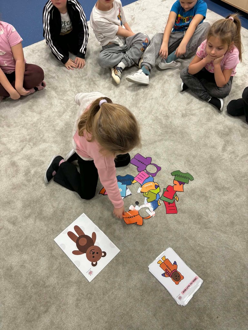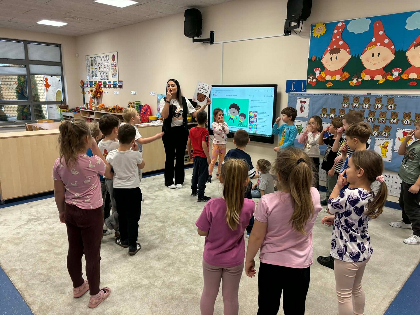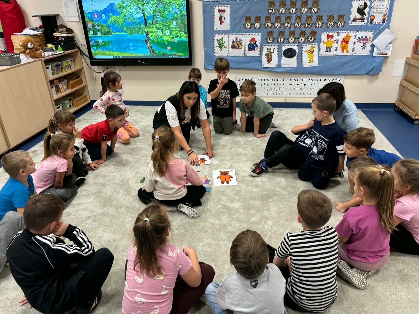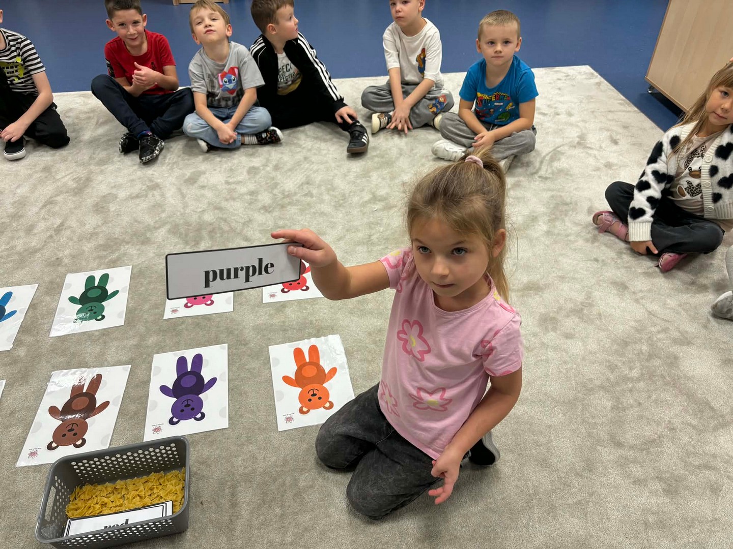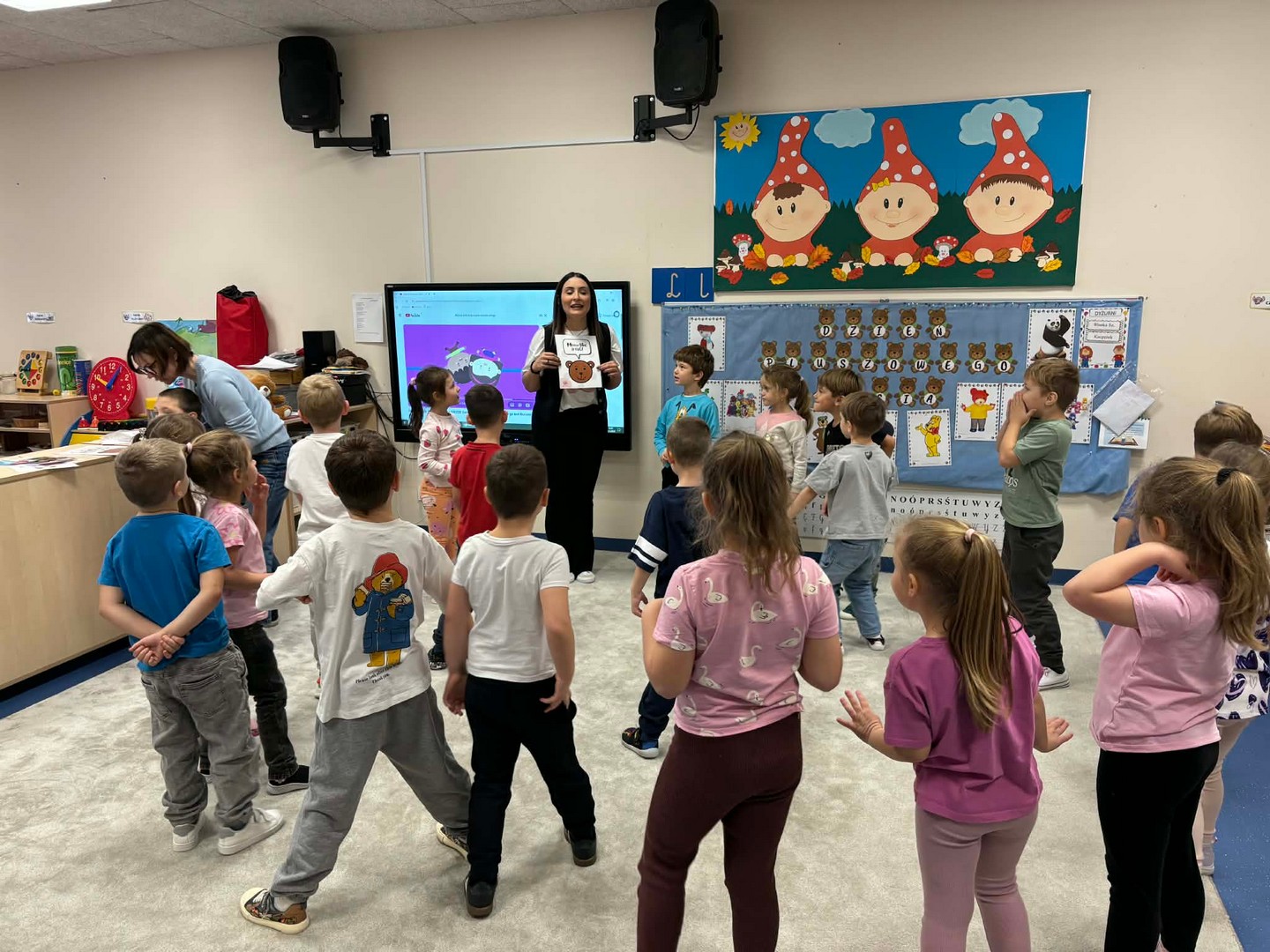 Wraz z przedszkolakami obchodziliśmy Dzień Pluszowego Misia. Dzieci utrwaliły nazwy kolorów oraz dopasowały je do obrazków z misiami. Następna zabawą było dopasowywanie kolorowych mat do misiów. Kolejnym zadaniem dzieci było wybranie odpowiednich ubrań dla pluszowego misia, według wzoru. Dzieci określały również na jaka pogodę pasuje wybrany komplet ubrań. Zadaniem ruchowym, które sprawiło dzieciom wiele radości była zabawa Teddy bear says..... gdzie dzieci miały wykonać określone zadanie. Liczenie baloników w ręku misia uprawniło umiejętności przeliczania w języku angielskim. Na koniec dzieci pokolorowały obrazek z pluszowym misiem według własnego pomysłu.
