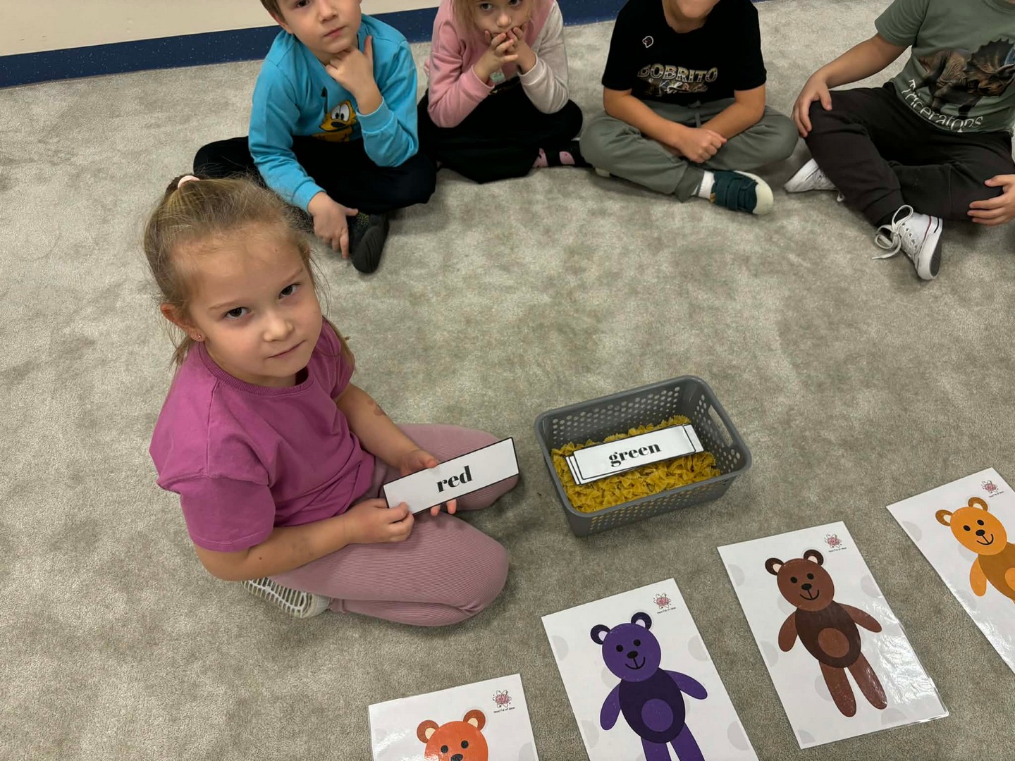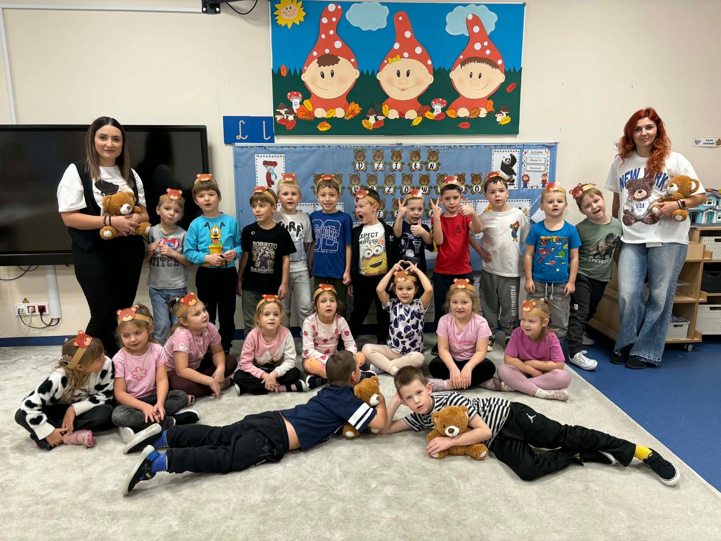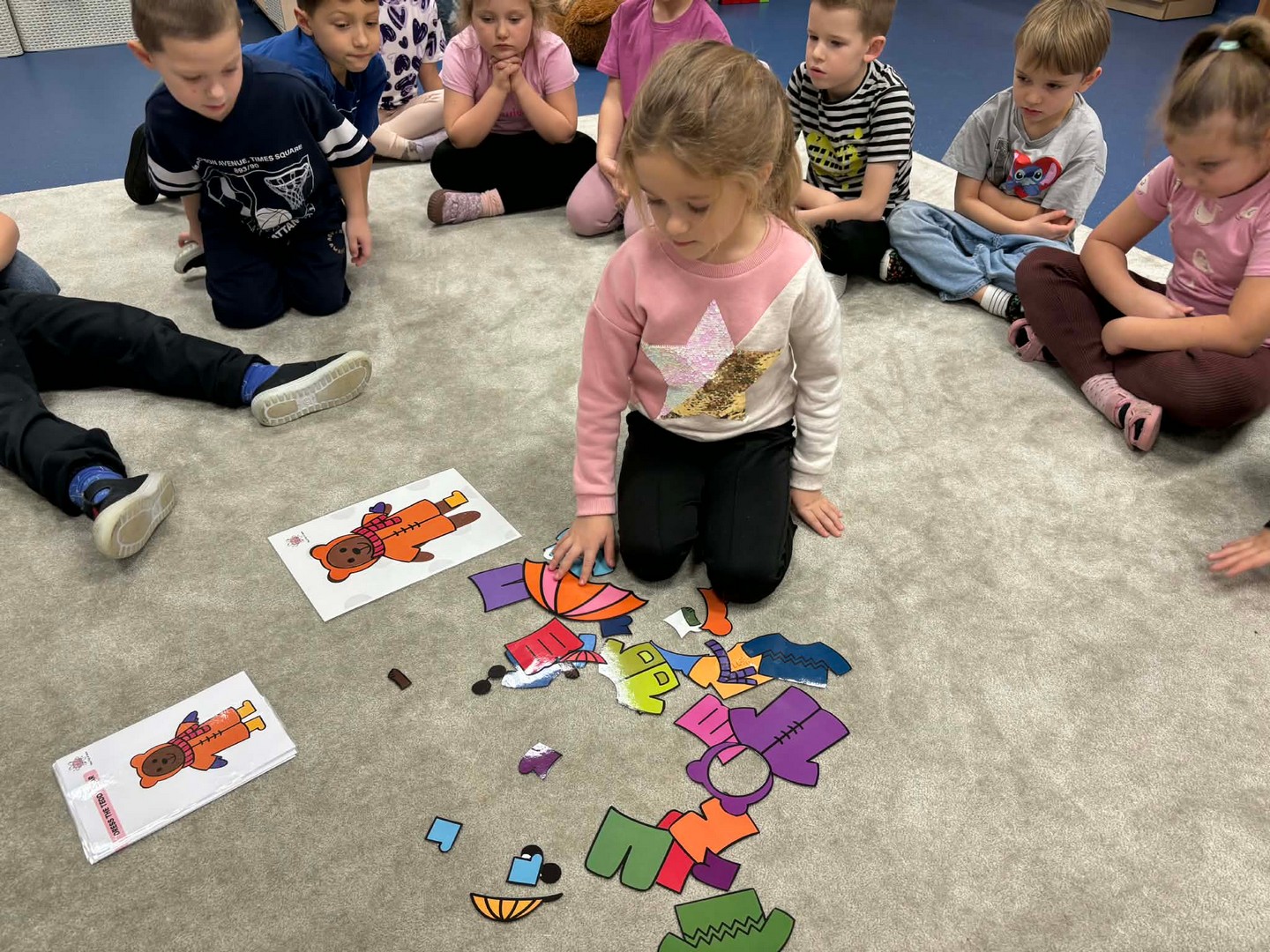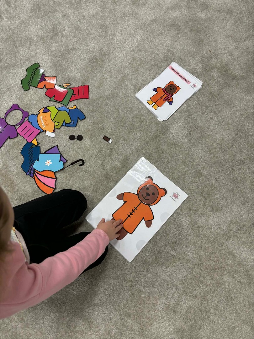Wraz z przedszkolakami obchodziliśmy Dzień Pluszowego Misia. Dzieci utrwaliły nazwy kolorów oraz dopasowały je do obrazków z misiami. Następna zabawą było dopasowywanie kolorowych mat do misiów. Kolejnym zadaniem dzieci było wybranie odpowiednich ubrań dla pluszowego misia, według wzoru. Dzieci określały również na jaka pogodę pasuje wybrany komplet ubrań. Zadaniem ruchowym, które sprawiło dzieciom wiele radości była zabawa Teddy bear says..... gdzie dzieci miały wykonać określone zadanie. Liczenie baloników w ręku misia uprawniło umiejętności przeliczania w języku angielskim. Na koniec dzieci pokolorowały obrazek z pluszowym misiem według własnego pomysłu.