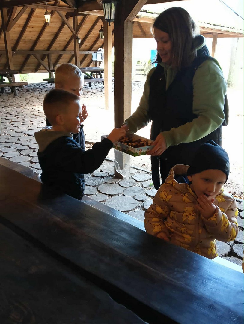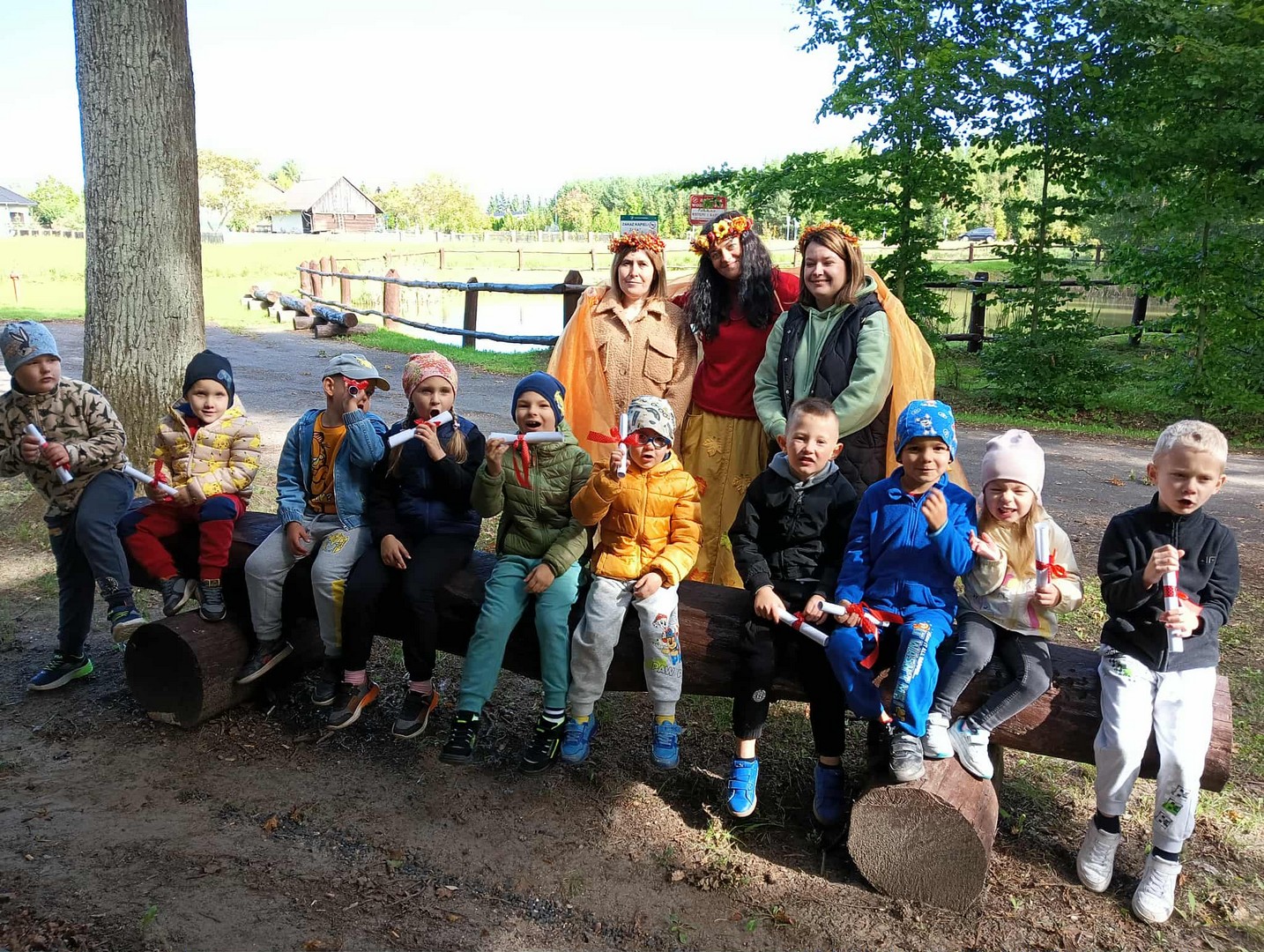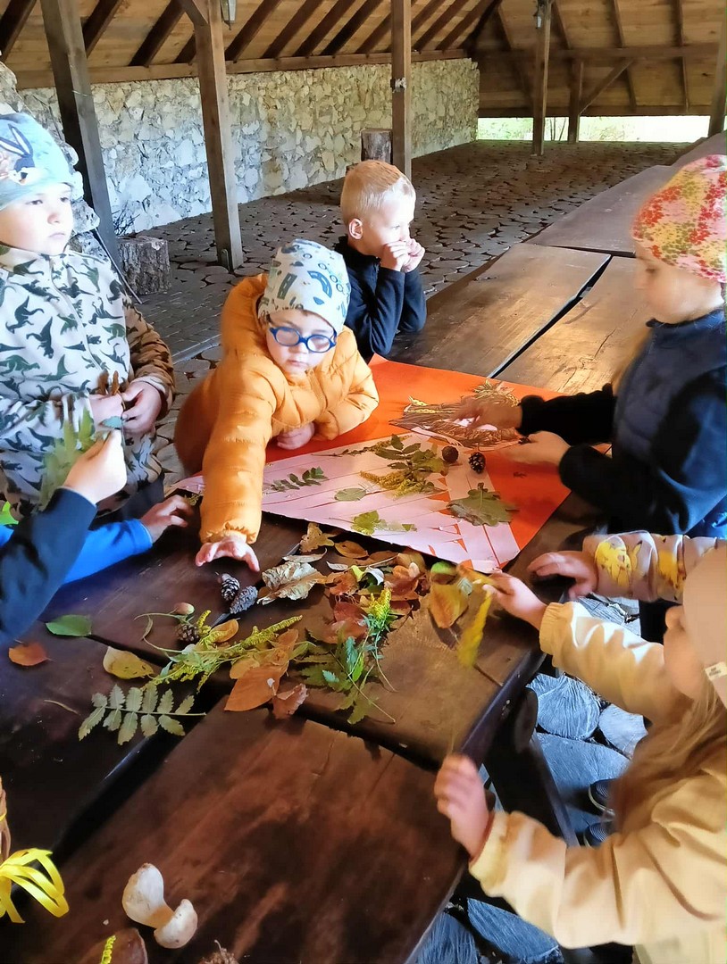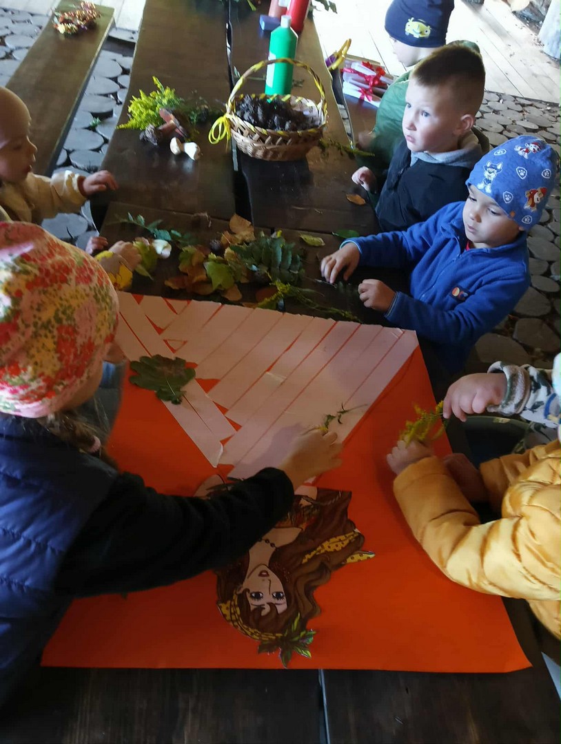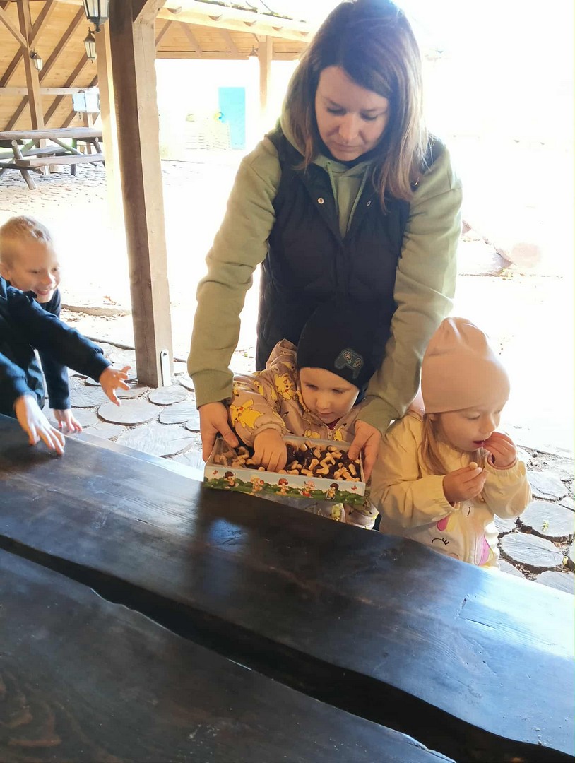 Po dotarciu do rezerwatu przyrody dzieci od razu poczuły magiczną atmosferę jesiennego lasu. Wspólnie poszukiwaliśmy skarbów jesieni, które później miały posłużyć do stworzenia sukni dla Pani Jesieni. Pod dużym „grzybkiem”, pośród drzew, Smerfy tańczyły i śpiewały przy muzyce, wsłuchując się w leśne odgłosy. Wąchały grzyby, żeby sprawdzić jak pachnie jesień, oraz smakowały jesienne owoce – śliwki i jabłka.