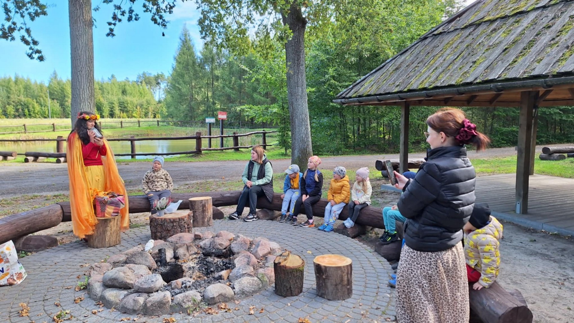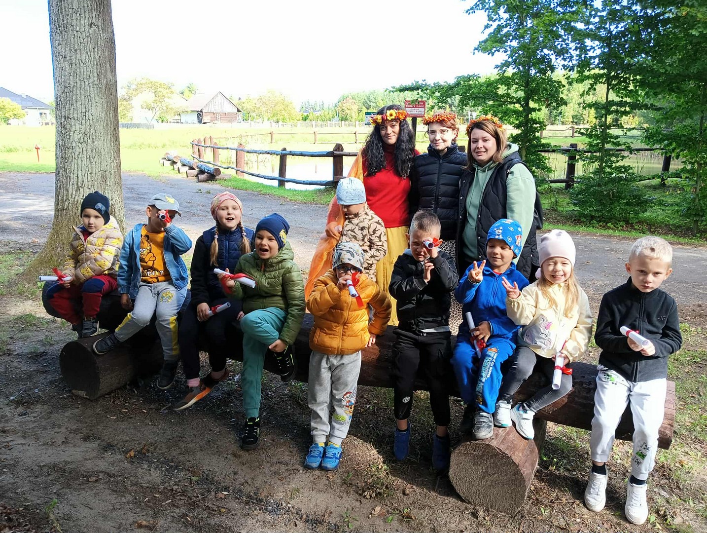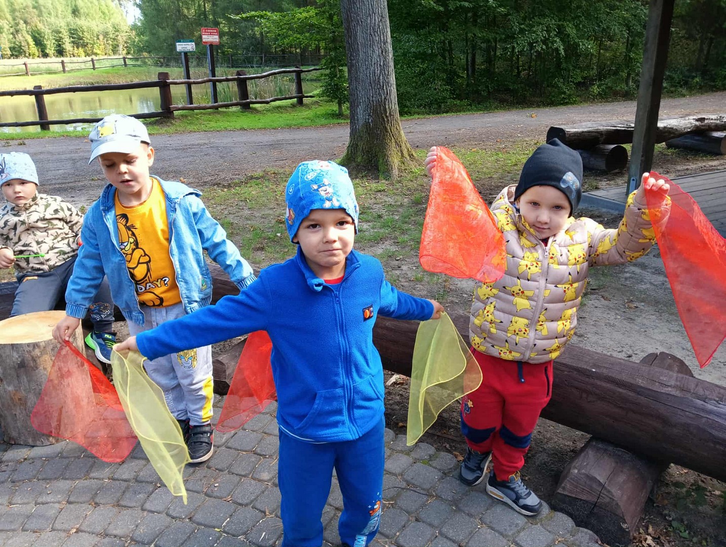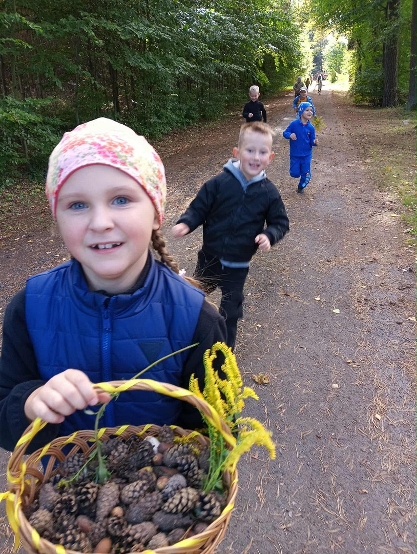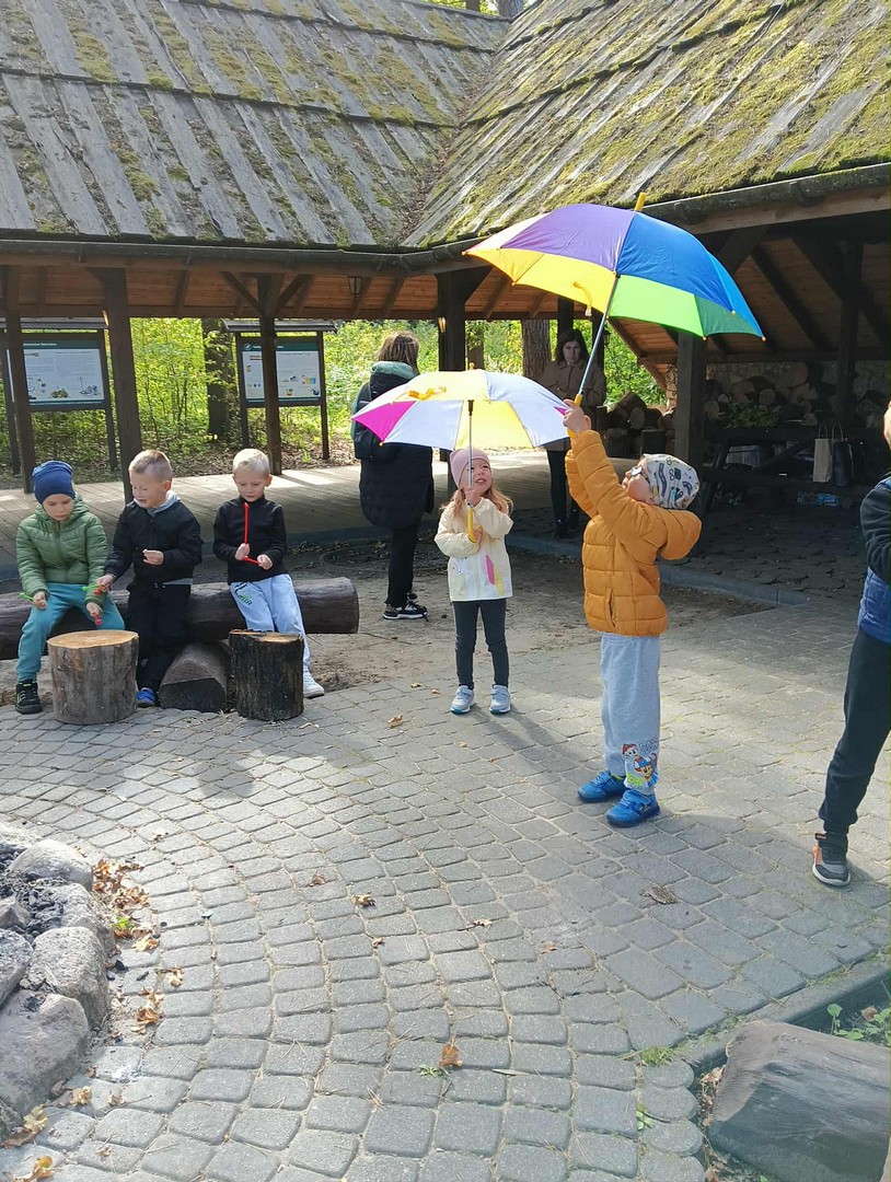 Po dotarciu do rezerwatu przyrody dzieci od razu poczuły magiczną atmosferę jesiennego lasu. Wspólnie poszukiwaliśmy skarbów jesieni, które później miały posłużyć do stworzenia sukni dla Pani Jesieni. Pod dużym „grzybkiem”, pośród drzew, Smerfy tańczyły i śpiewały przy muzyce, wsłuchując się w leśne odgłosy. Wąchały grzyby, żeby sprawdzić jak pachnie jesień, oraz smakowały jesienne owoce – śliwki i jabłka.