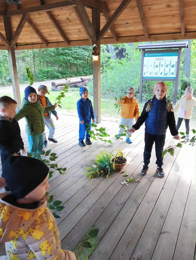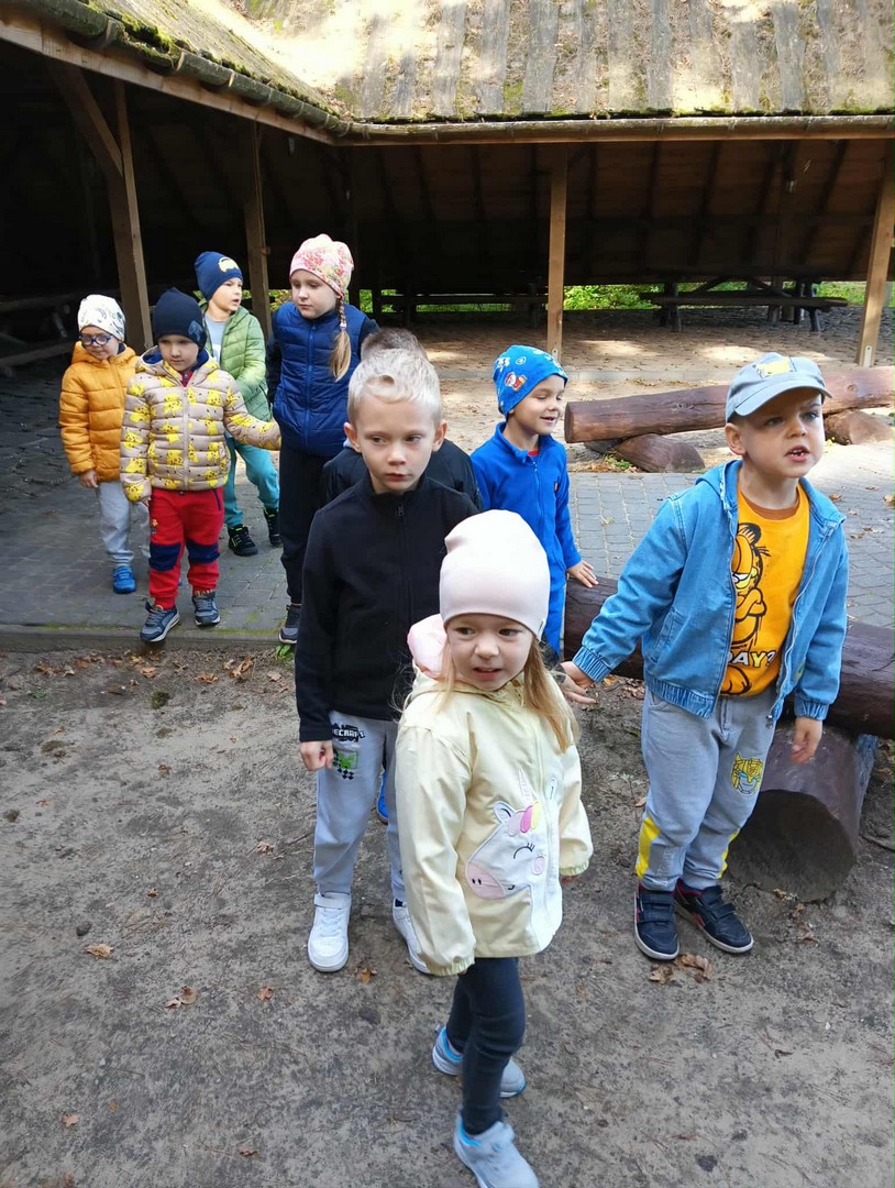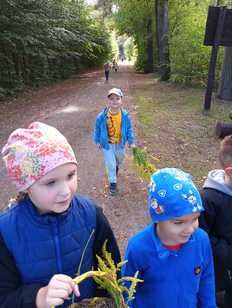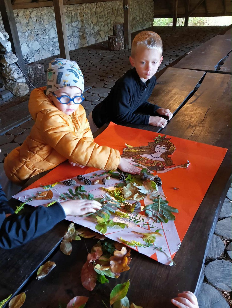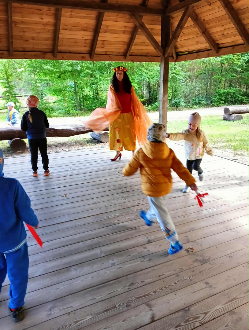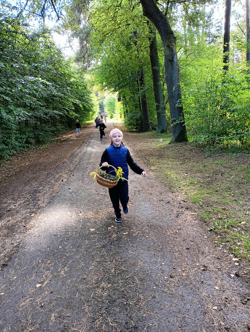Po dotarciu do rezerwatu przyrody dzieci od razu poczuły magiczną atmosferę jesiennego lasu. Wspólnie poszukiwaliśmy skarbów jesieni, które później miały posłużyć do stworzenia sukni dla Pani Jesieni. Pod dużym „grzybkiem”, pośród drzew, Smerfy tańczyły i śpiewały przy muzyce, wsłuchując się w leśne odgłosy. Wąchały grzyby, żeby sprawdzić jak pachnie jesień, oraz smakowały jesienne owoce – śliwki i jabłka.