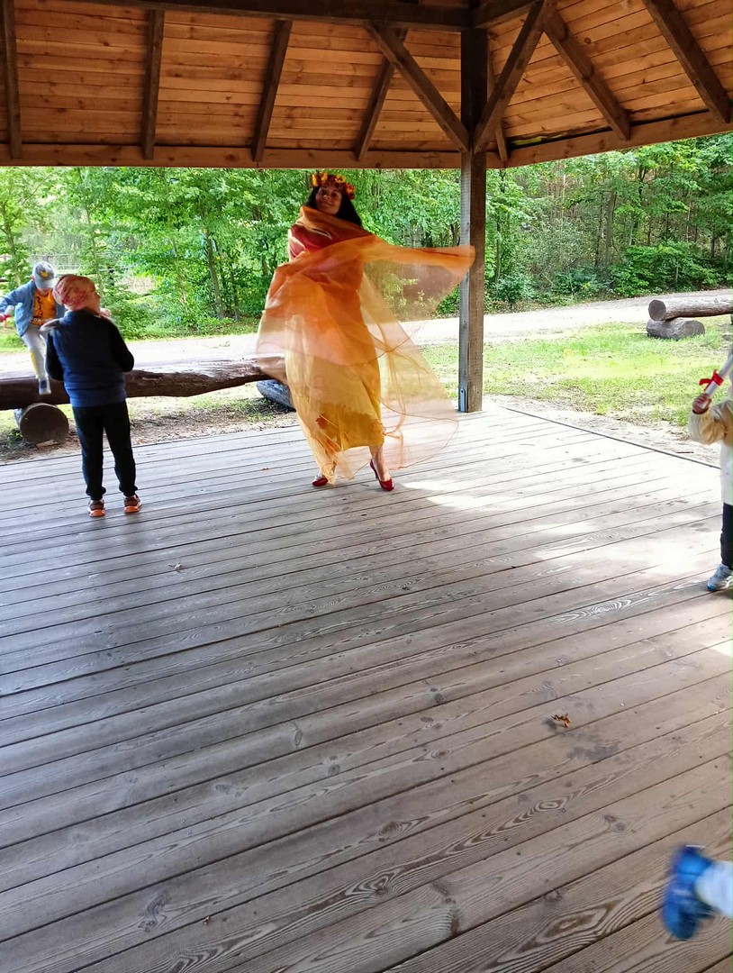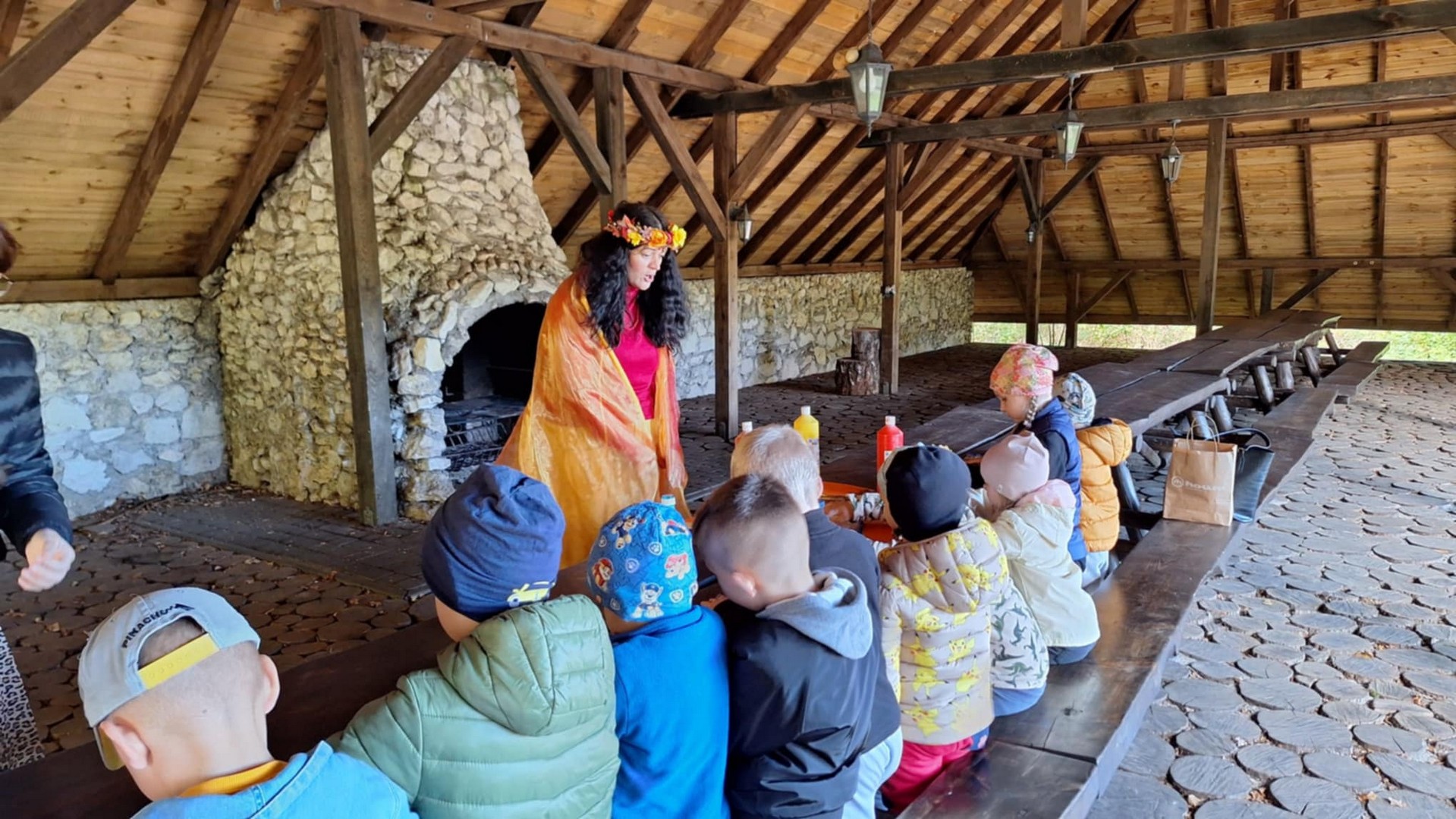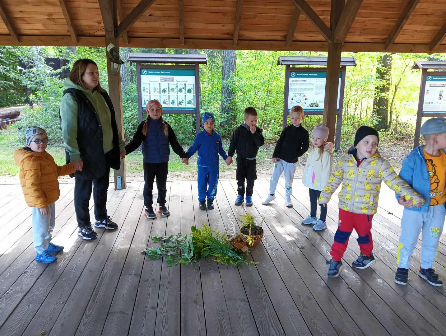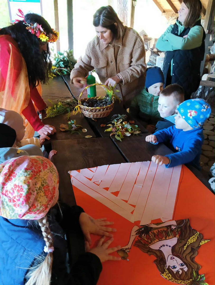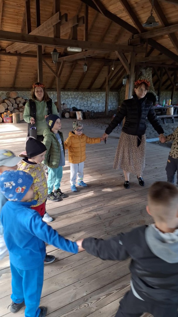 Po dotarciu do rezerwatu przyrody dzieci od razu poczuły magiczną atmosferę jesiennego lasu. Wspólnie poszukiwaliśmy skarbów jesieni, które później miały posłużyć do stworzenia sukni dla Pani Jesieni. Pod dużym „grzybkiem”, pośród drzew, Smerfy tańczyły i śpiewały przy muzyce, wsłuchując się w leśne odgłosy. Wąchały grzyby, żeby sprawdzić jak pachnie jesień, oraz smakowały jesienne owoce – śliwki i jabłka.