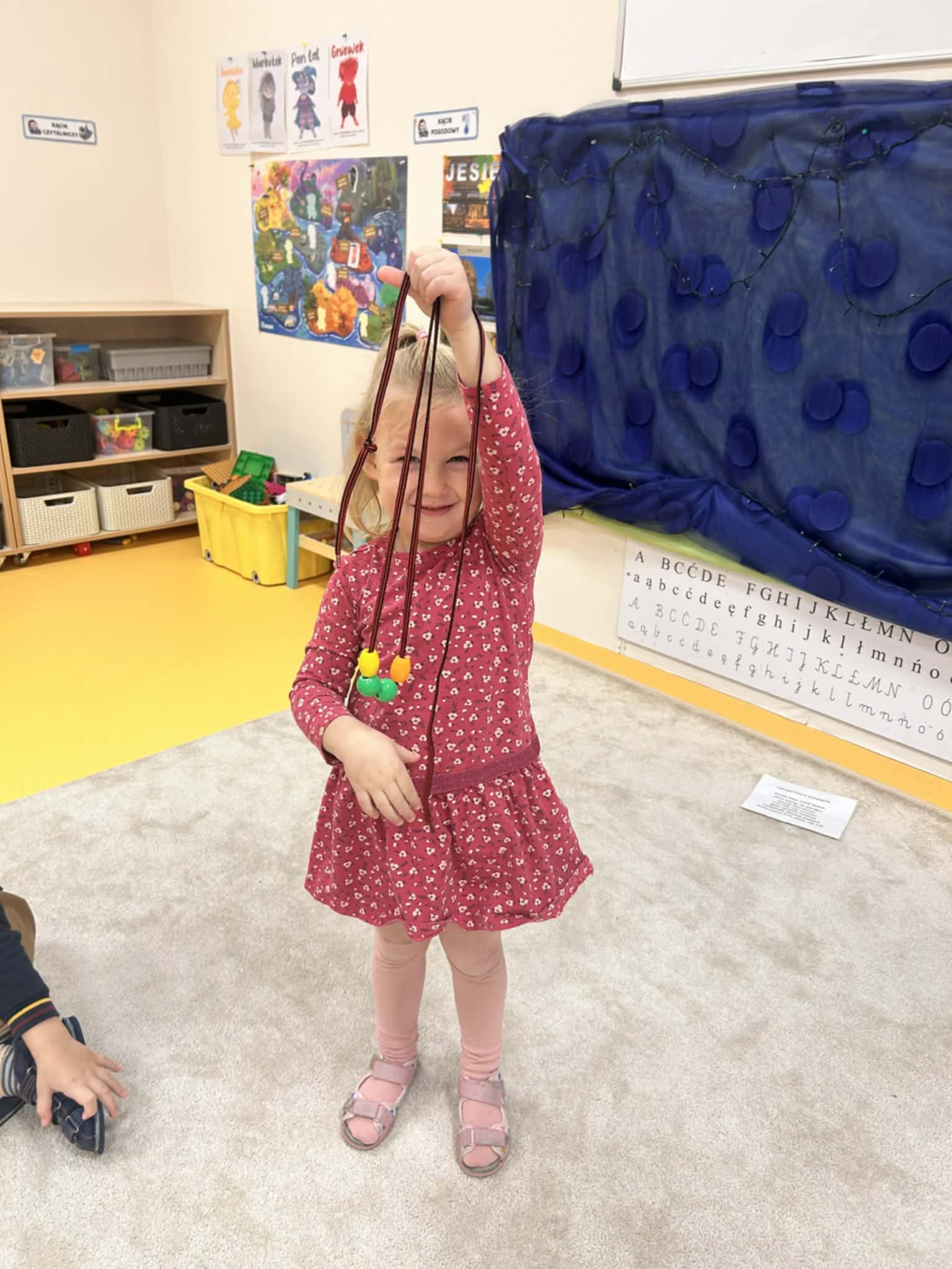 Gdy Hania nawlekała koraliki rozwijała jednocześnie swoje zdolności manualne, uczyła się koncentracji oraz doskonaliła koordynację wzrokowo-ruchową.