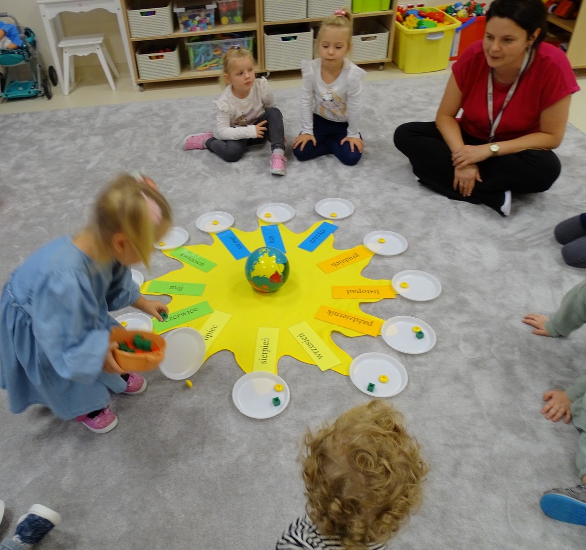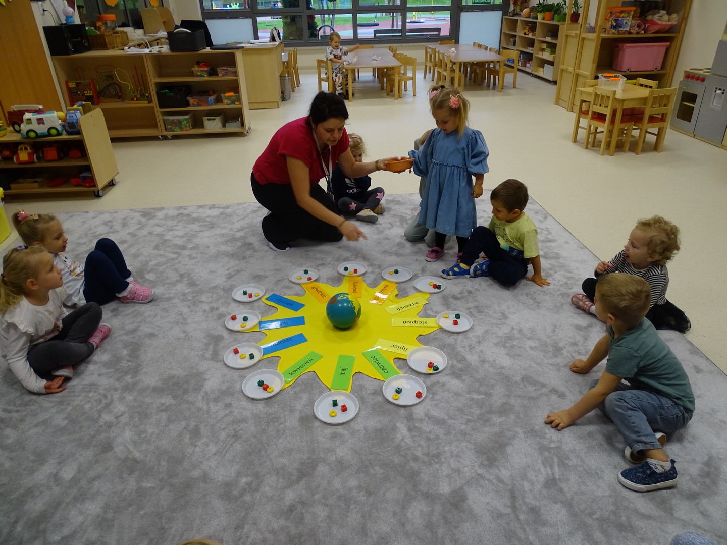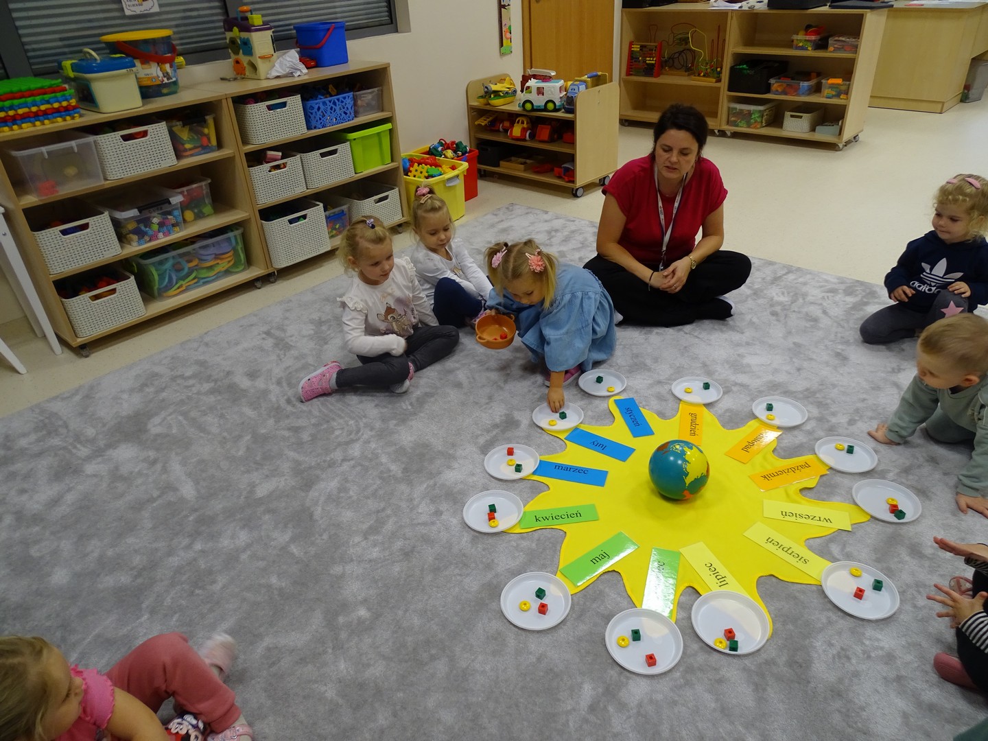 Urodziny w przedszkolu to rytuał "Urodzinowe Słoneczko"(wg koncepcji M. Montessori), który pomaga dzieciom zrozumieć koncepcję czasu i cykliczności. Solenizant, trzymając globus, okrąża symboliczne "słoneczko" na środku sali tyle razy, ile kończy lat, a przy każdym okrążeniu Pani opowiada o ważnych wydarzeniach ze życia dziecka. Przedszkolaka w tym czasie wrzuca koralik do odpowiedniej miseczki symbolizującej jeden rok. Rytuał kończy się śpiewaniem piosenki, tańcem, życzeniami i poczęstunkiem. W miesiącu październik swojej urodziny obchodziła Laura F.