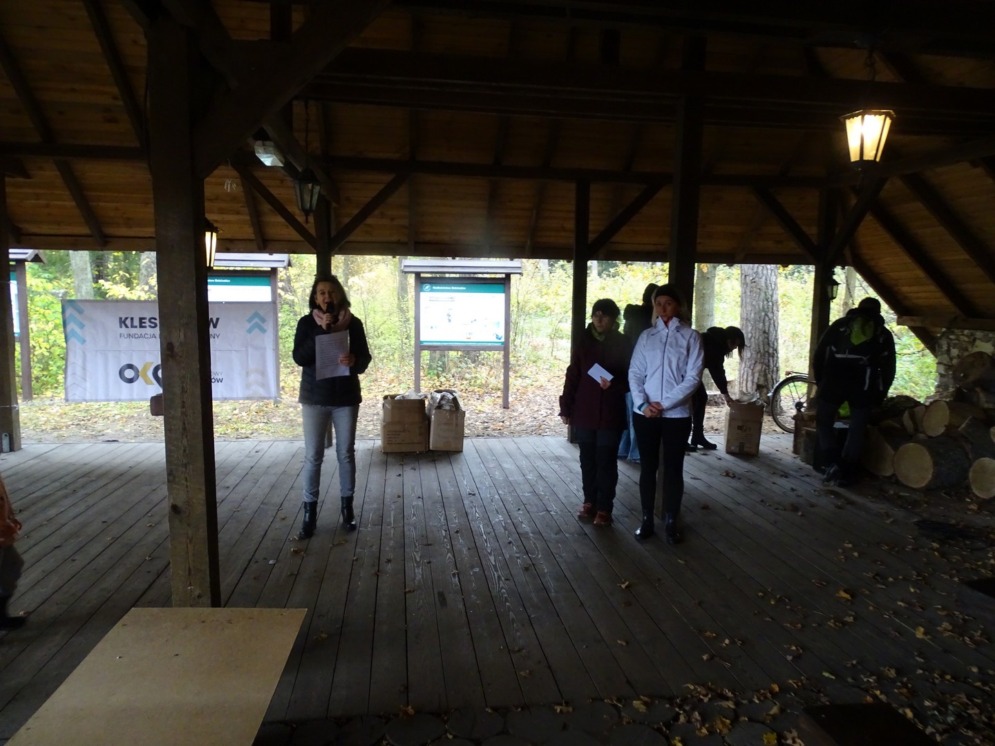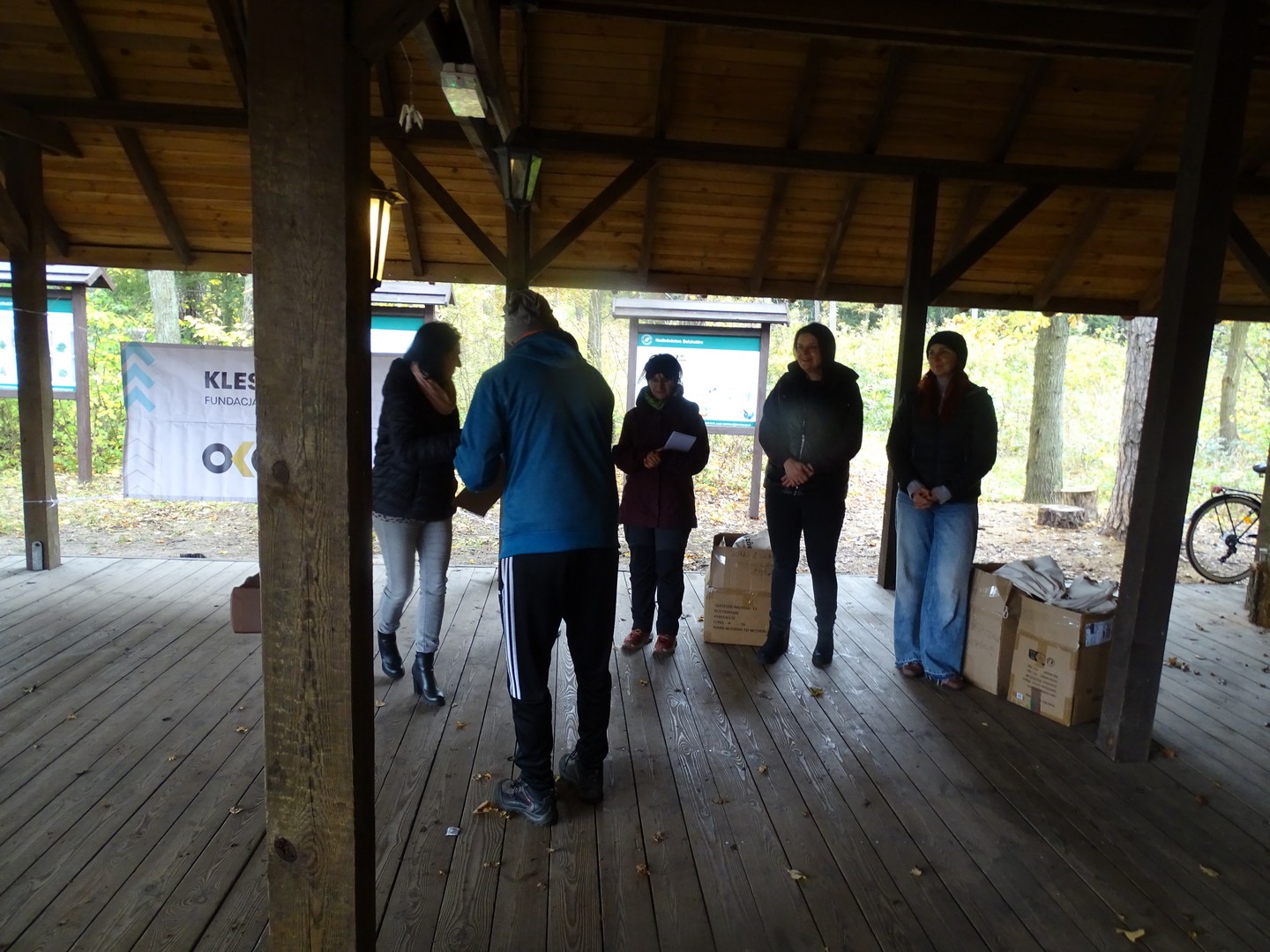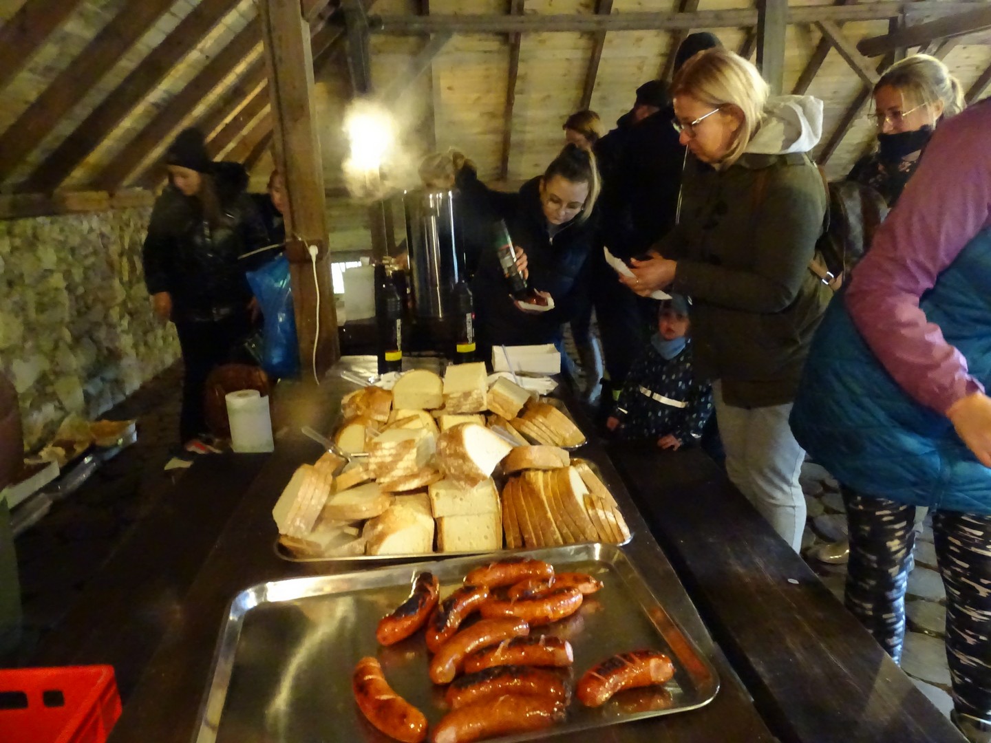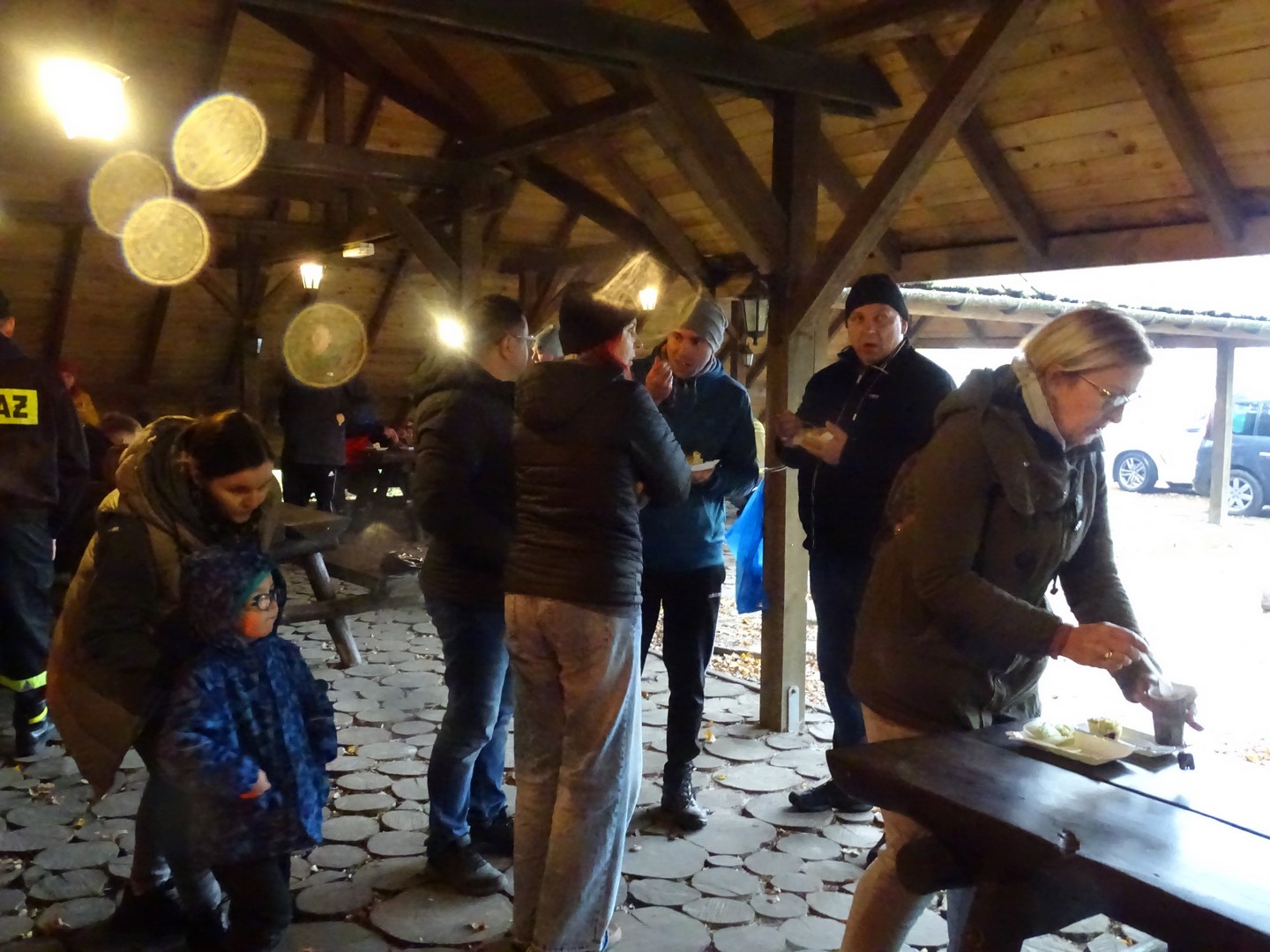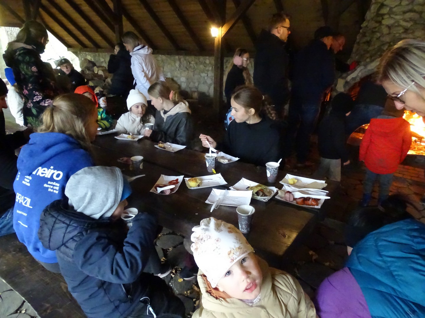Po akcji sprzątania lasu zaproszono wszystkich gości do altany ekologicznej, gdzie można było posilić się kiełbaskami, kaszanką, wypić gorącą kawę, herbatą i zjeść ciasto.