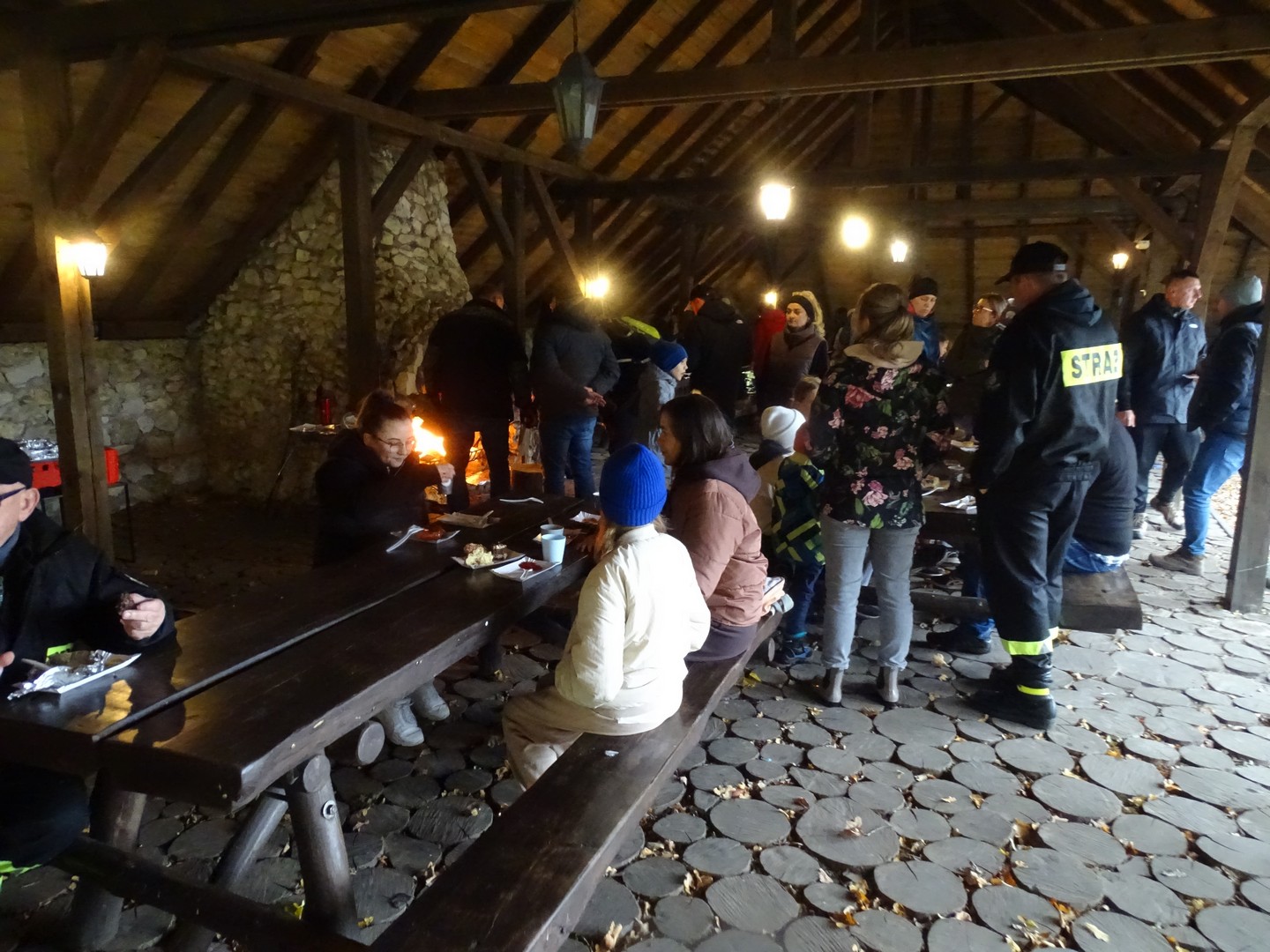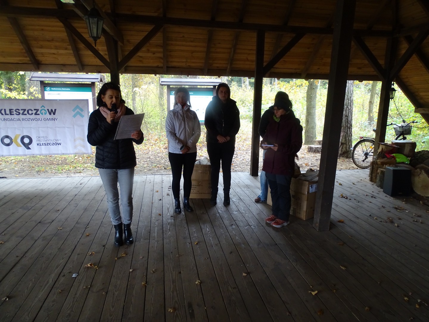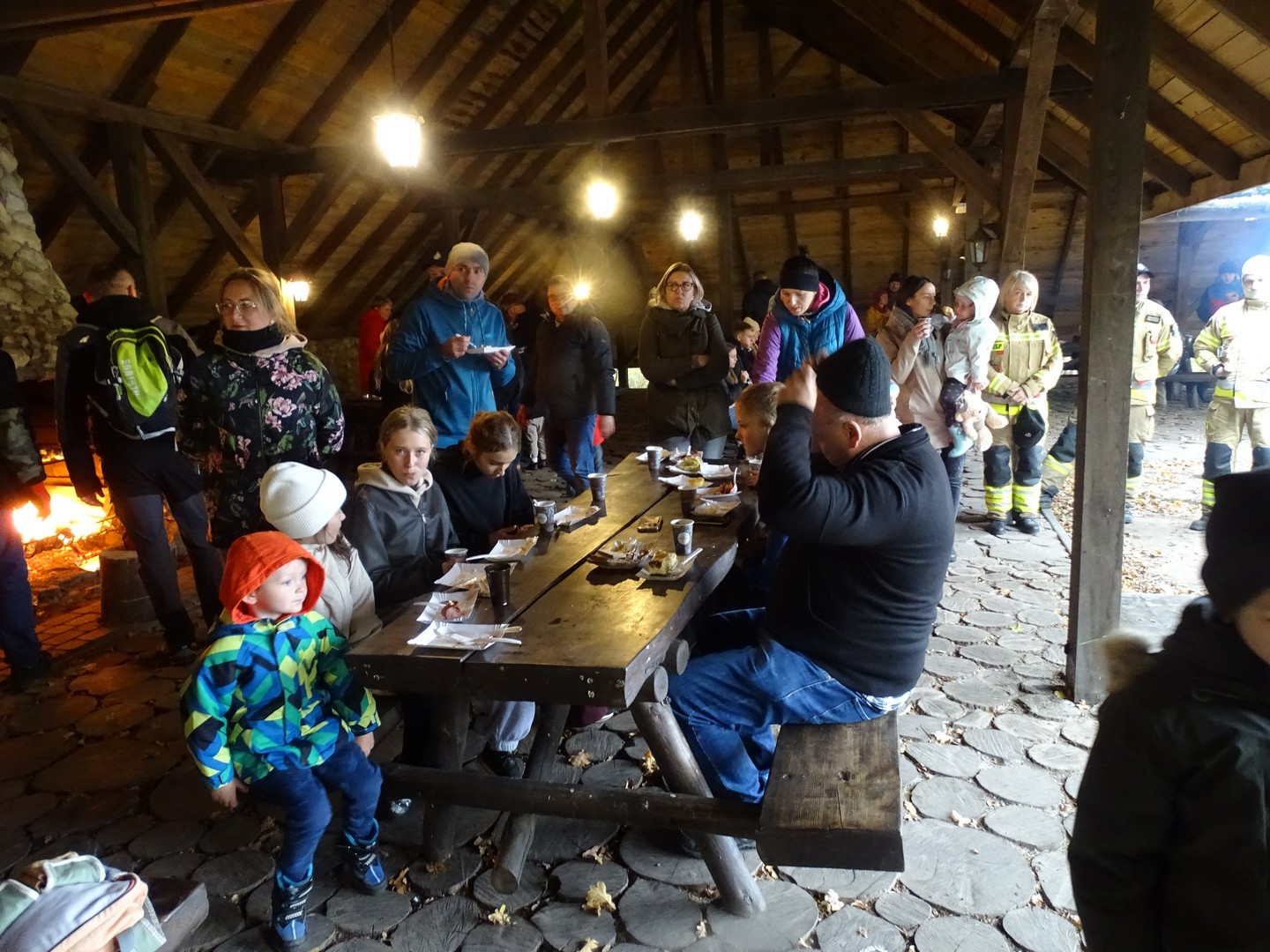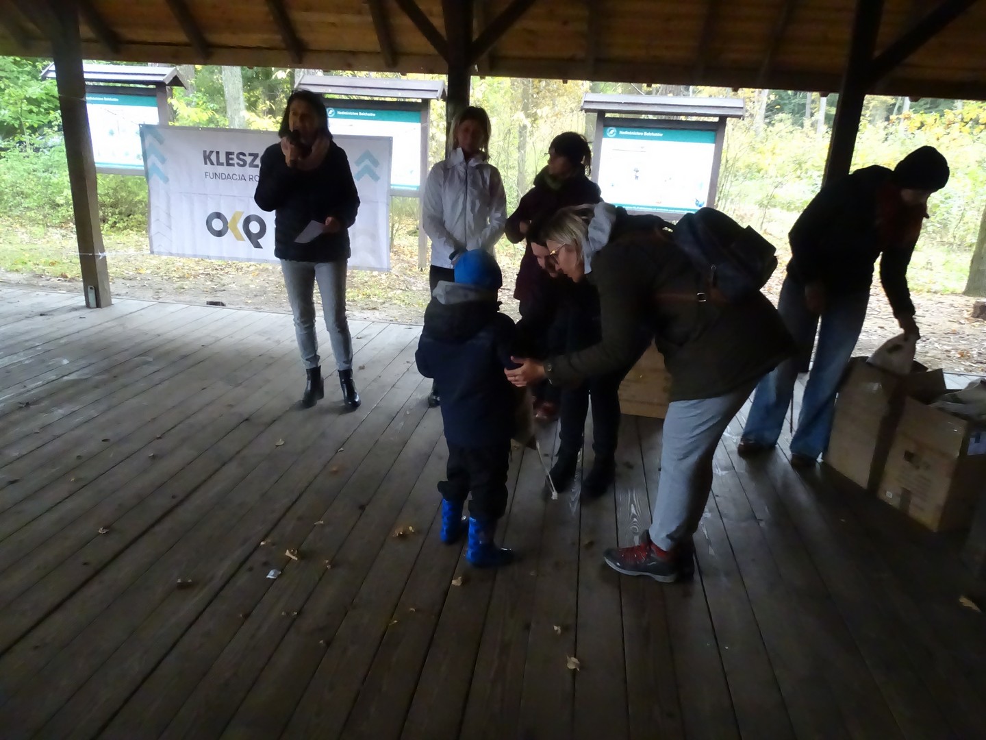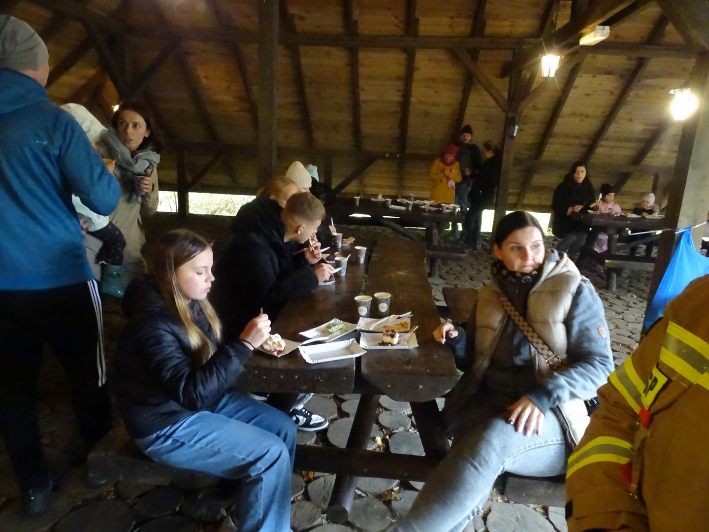 Po akcji sprzątania lasu zaproszono wszystkich gości do altany ekologicznej, gdzie można było posilić się kiełbaskami, kaszanką, wypić gorącą kawę, herbatą i zjeść ciasto.