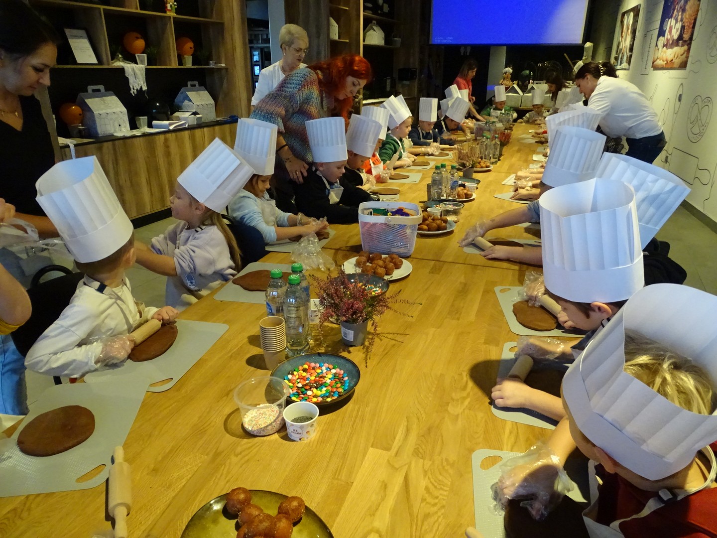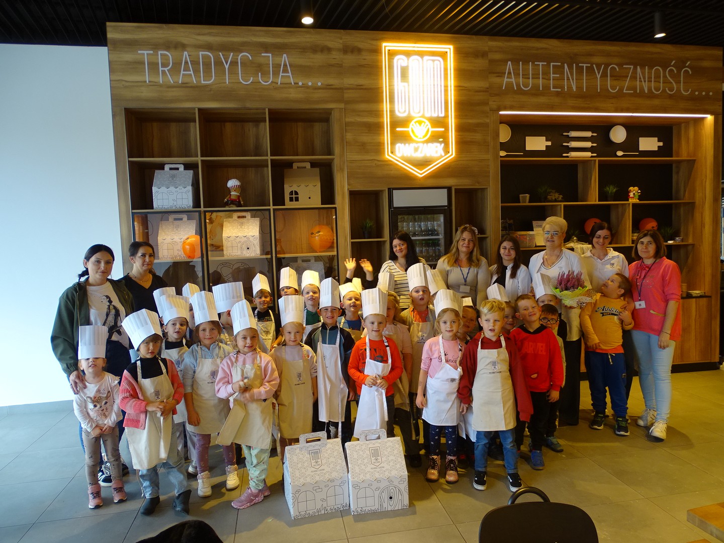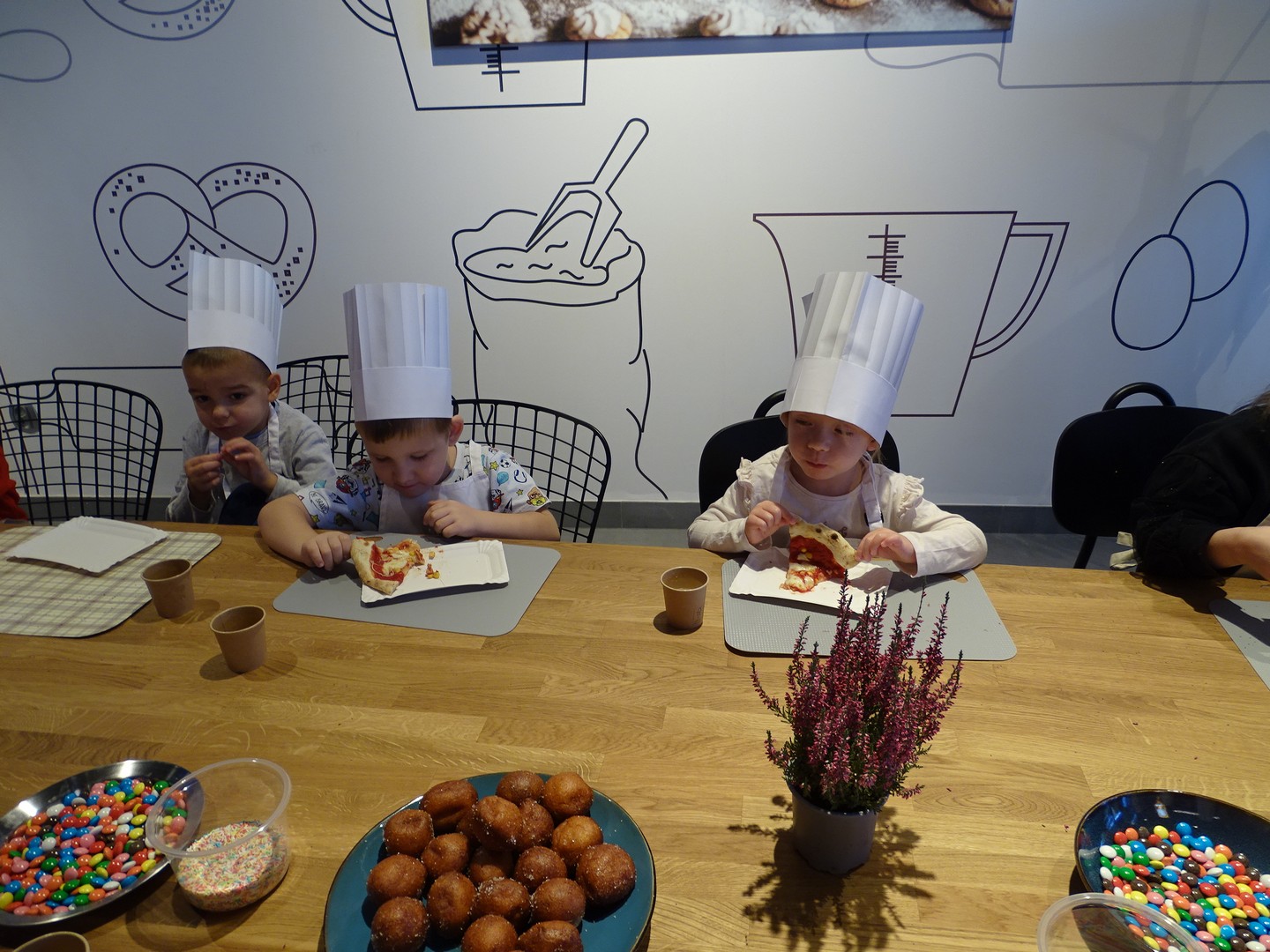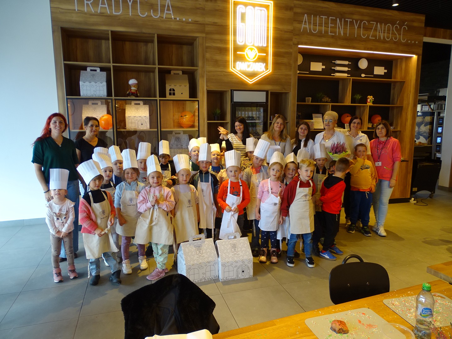 Z okazji Dnia Chleba dzieci z grup „Sówki” i „Smerfy” wybrały się na wyjątkową wycieczkę do Piekarni GOM w Kamieńsku. Zostaliśmy tam bardzo serdecznie przyjęci, a na naszych małych podróżników czekały liczne niespodzianki. Na początek dzieci spróbowały pysznego poczęstunku – świeżutkich pączuszków oraz włoskiej pizzy wypiekanej na miejscu. Następnie przedszkolaki przystąpiły do kulinarnych warsztatów. Dzieci wałkowały ciasto, wykrawały pierniczki i przygotowywały je do pieczenia. Panie z piekarni pokazały im piec oraz opowiedziały o całym procesie wypieku. Podczas gdy pierniczki rumieniły się w piecu, dzieci obejrzały krótką bajeczkę o tym, jak powstaje chleb. Później każde dziecko ozdobiło swoją własną bułeczkę, delikatnie posypując ją makiem. Na zakończenie, już po wyjęciu pierniczków z pieca, przedszkolaki fantastycznie udekorowały je lukrem i kolorowymi posypkami. Na koniec dzieci pięknie podziękowały za wspaniałą atmosferę i cudownie spędzony czas. Każdy uczestnik zabrał ze sobą do specjalnego papierowego domku własnoręcznie przygotowaną bułeczkę, pierniczki, pączka, a także kredki i kolorowankę. To był naprawdę wyjątkowy, pełen wrażeń dzień.