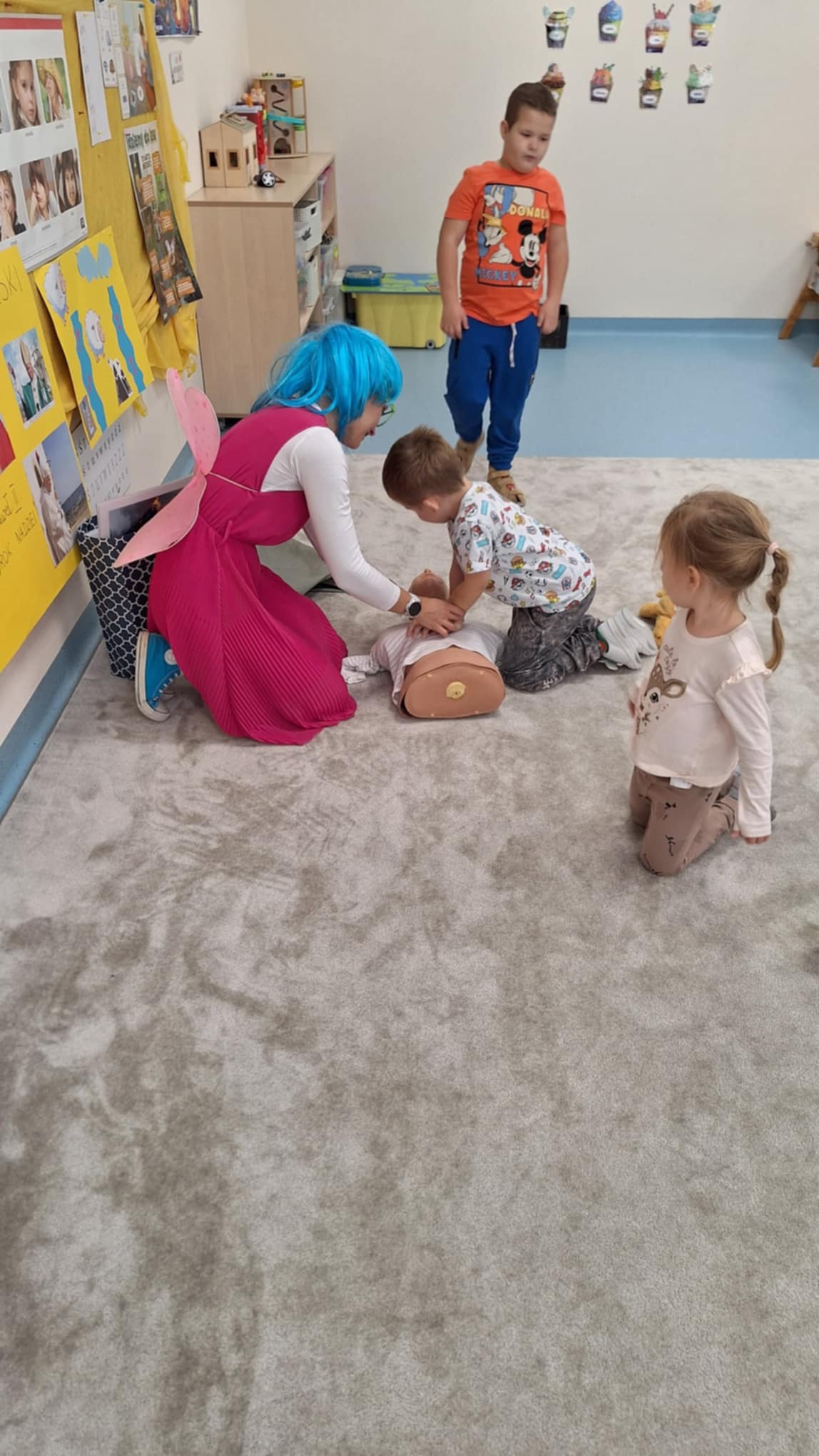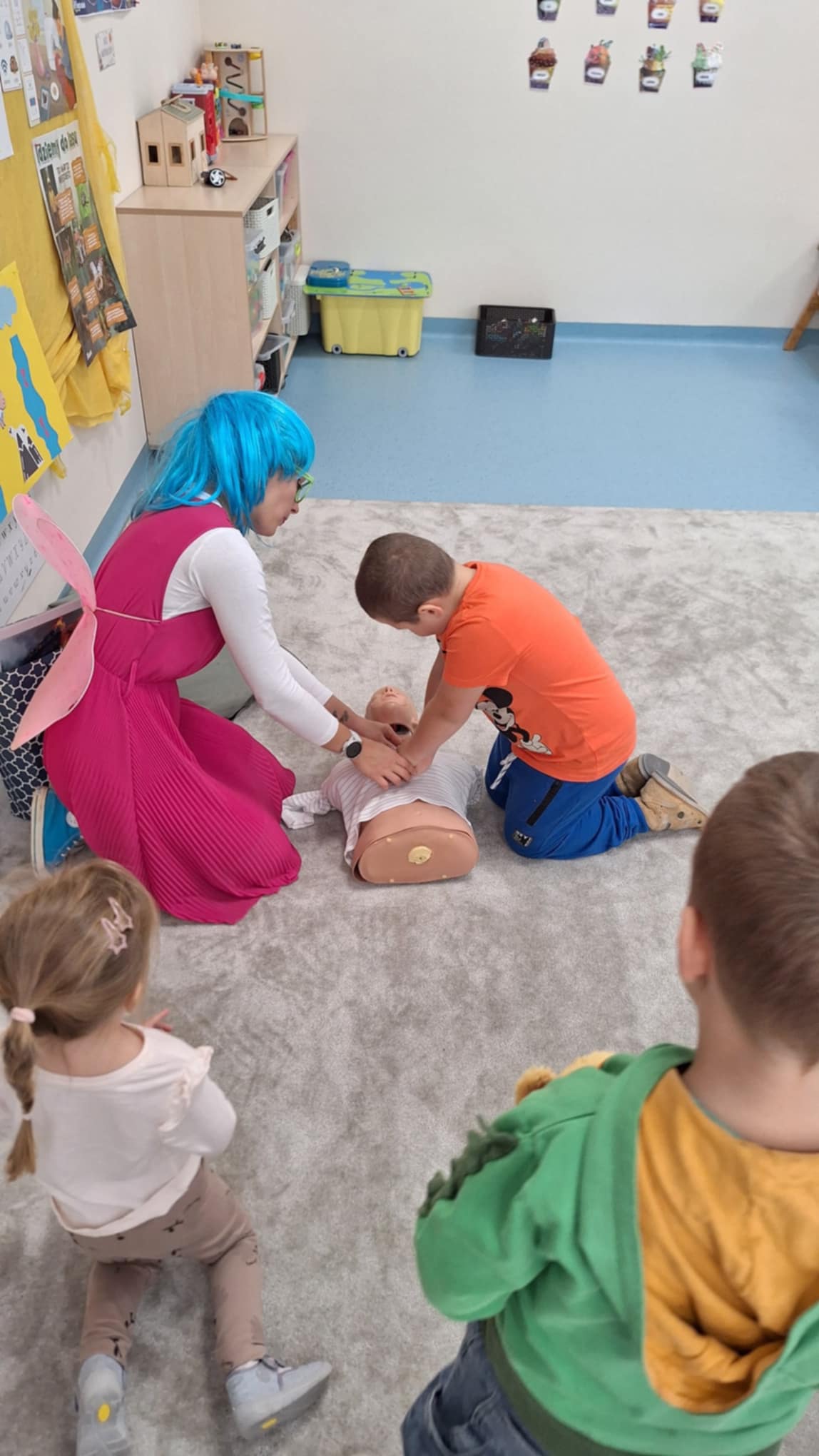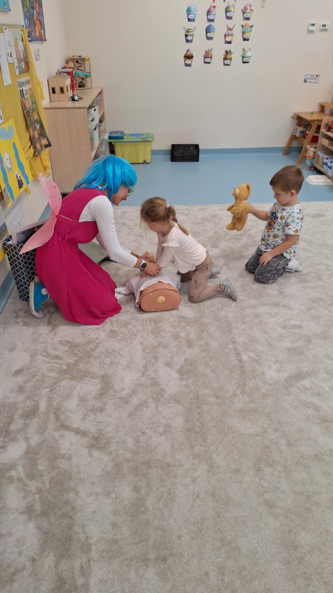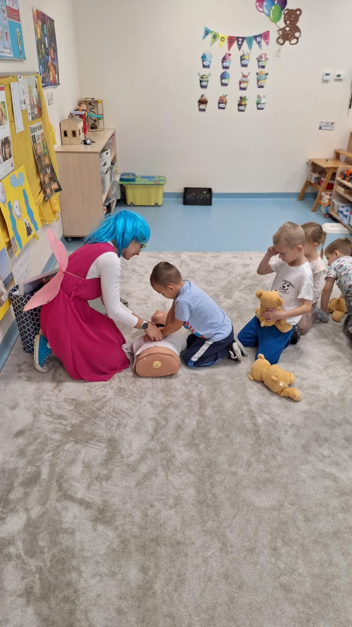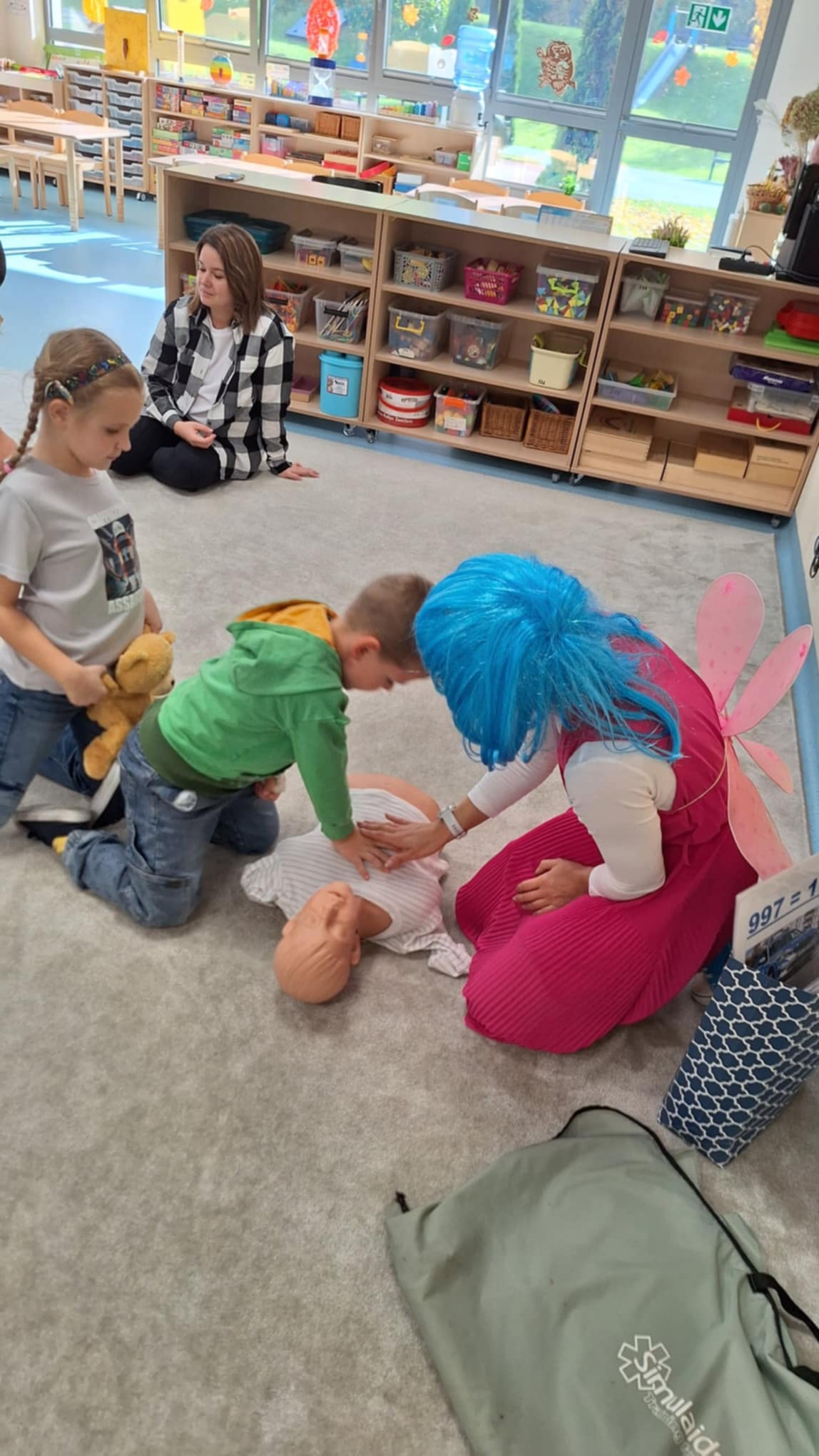 Dzieci z grupy „Smerfy” wzięły udział w warsztatach z pierwszej pomocy, które poprowadził ratownik medyczny. Przedszkolaki uczyły się, jak wezwać pomoc, rozmawiać z dyspozytorem i udzielić pierwszej pomocy w nagłych sytuacjach. „Smerfy” z dużym zaangażowaniem ćwiczyły ułożenie poszkodowanego , pokazując, że nawet najmłodsi potrafią pomagać!