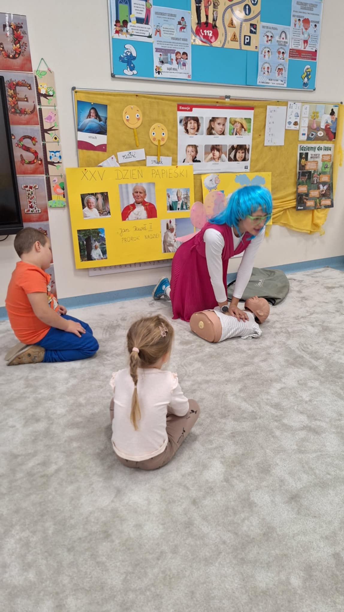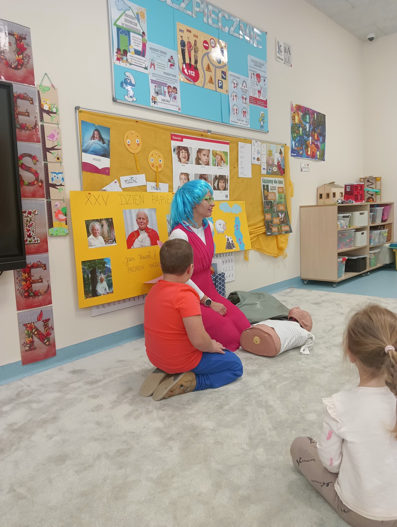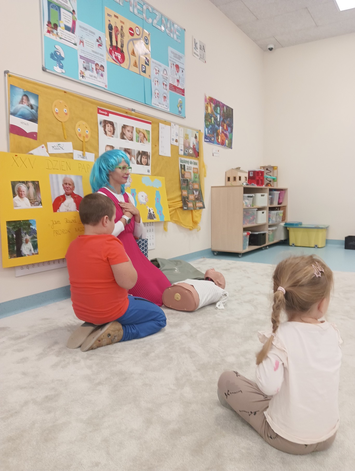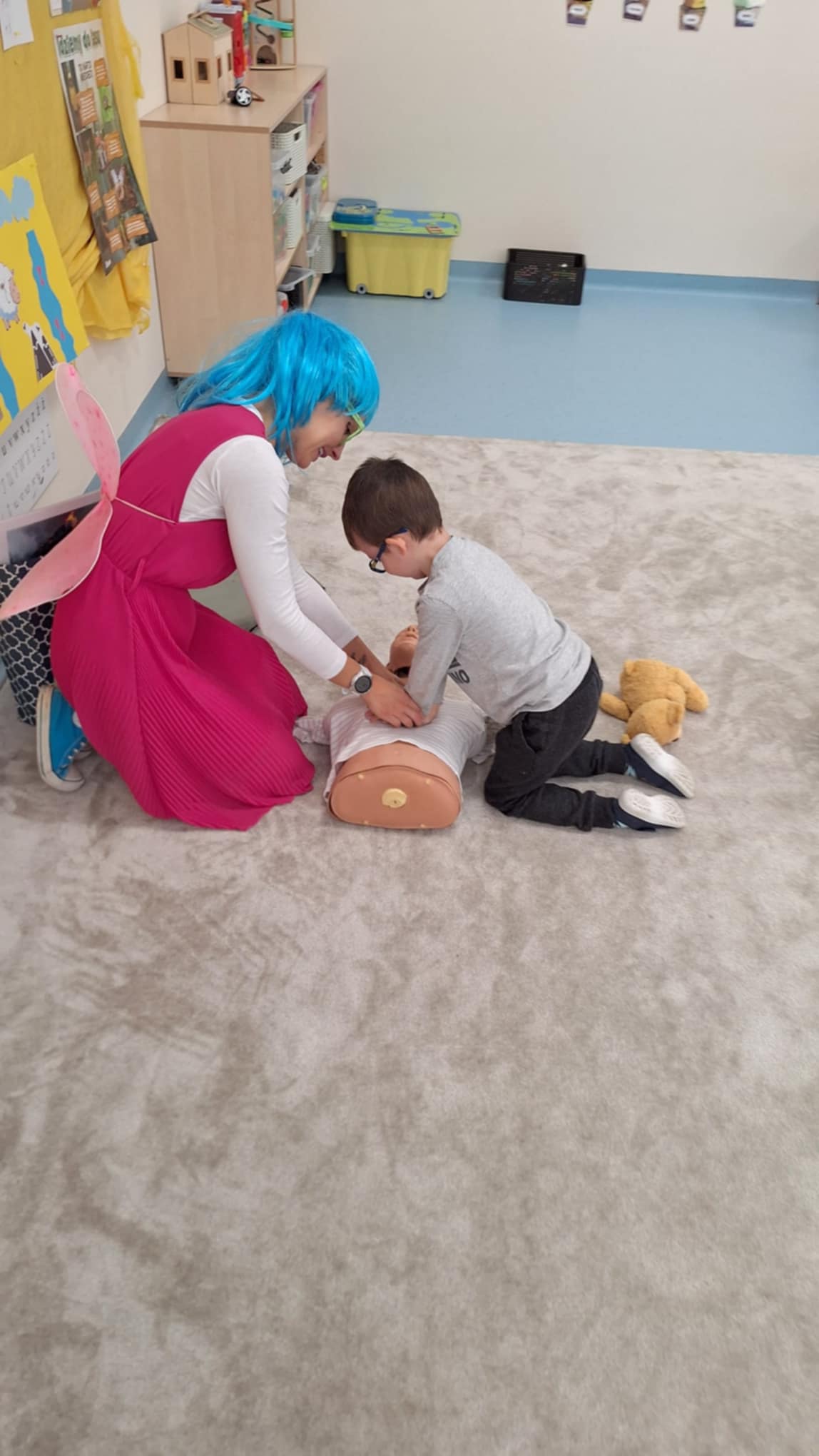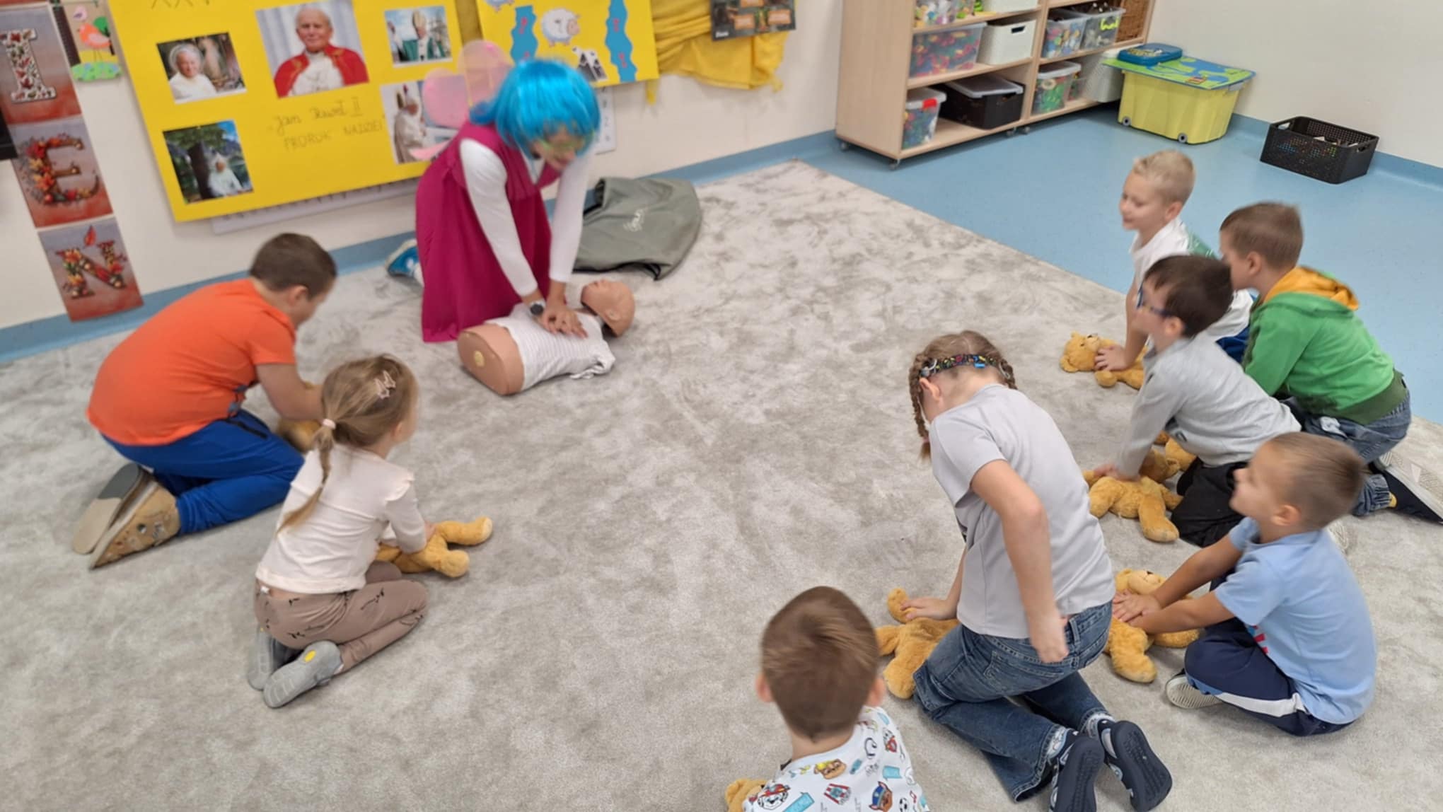 Dzieci z grupy „Smerfy” wzięły udział w warsztatach z pierwszej pomocy, które poprowadził ratownik medyczny. Przedszkolaki uczyły się, jak wezwać pomoc, rozmawiać z dyspozytorem i udzielić pierwszej pomocy w nagłych sytuacjach. „Smerfy” z dużym zaangażowaniem ćwiczyły ułożenie poszkodowanego , pokazując, że nawet najmłodsi potrafią pomagać!