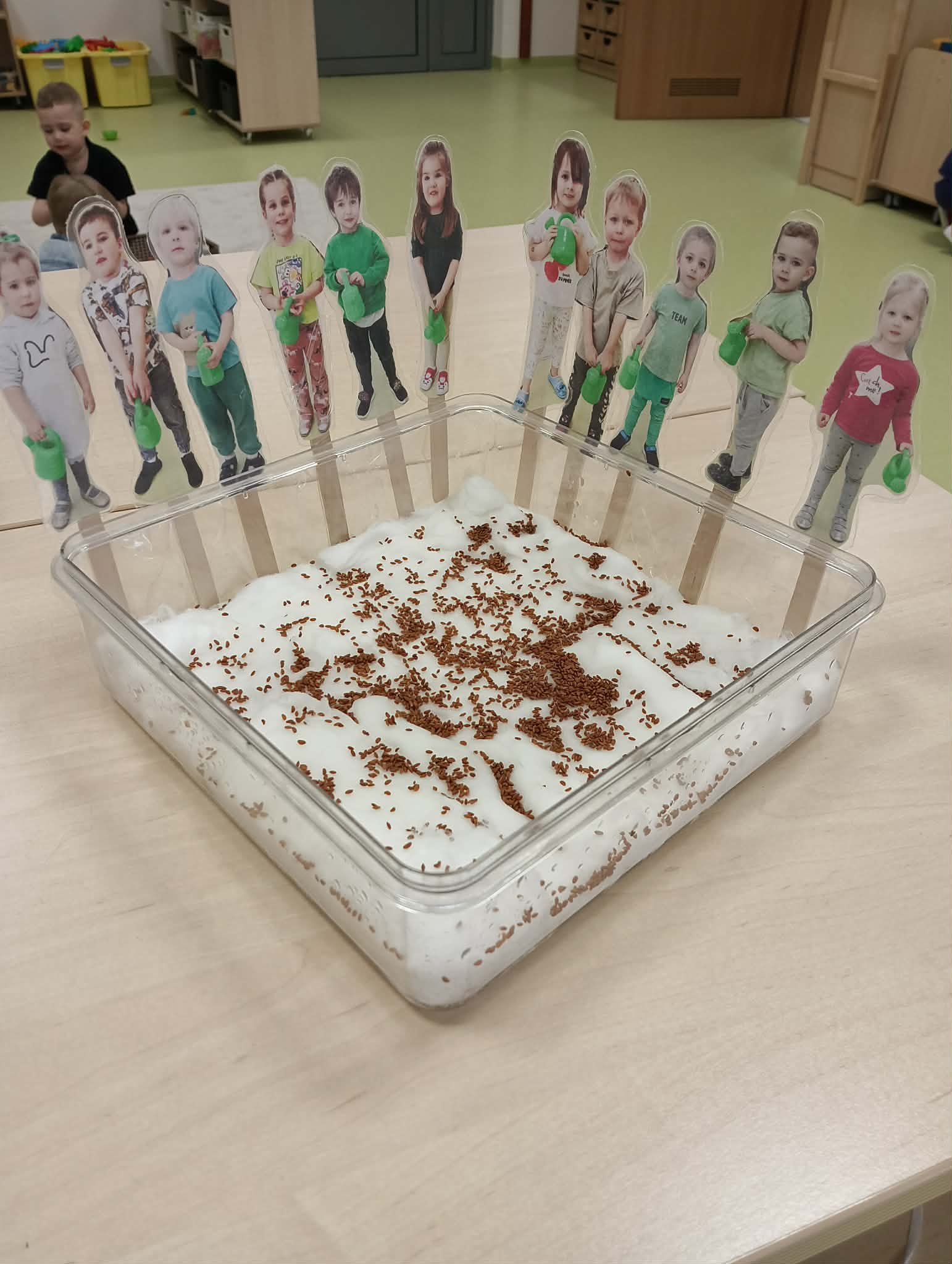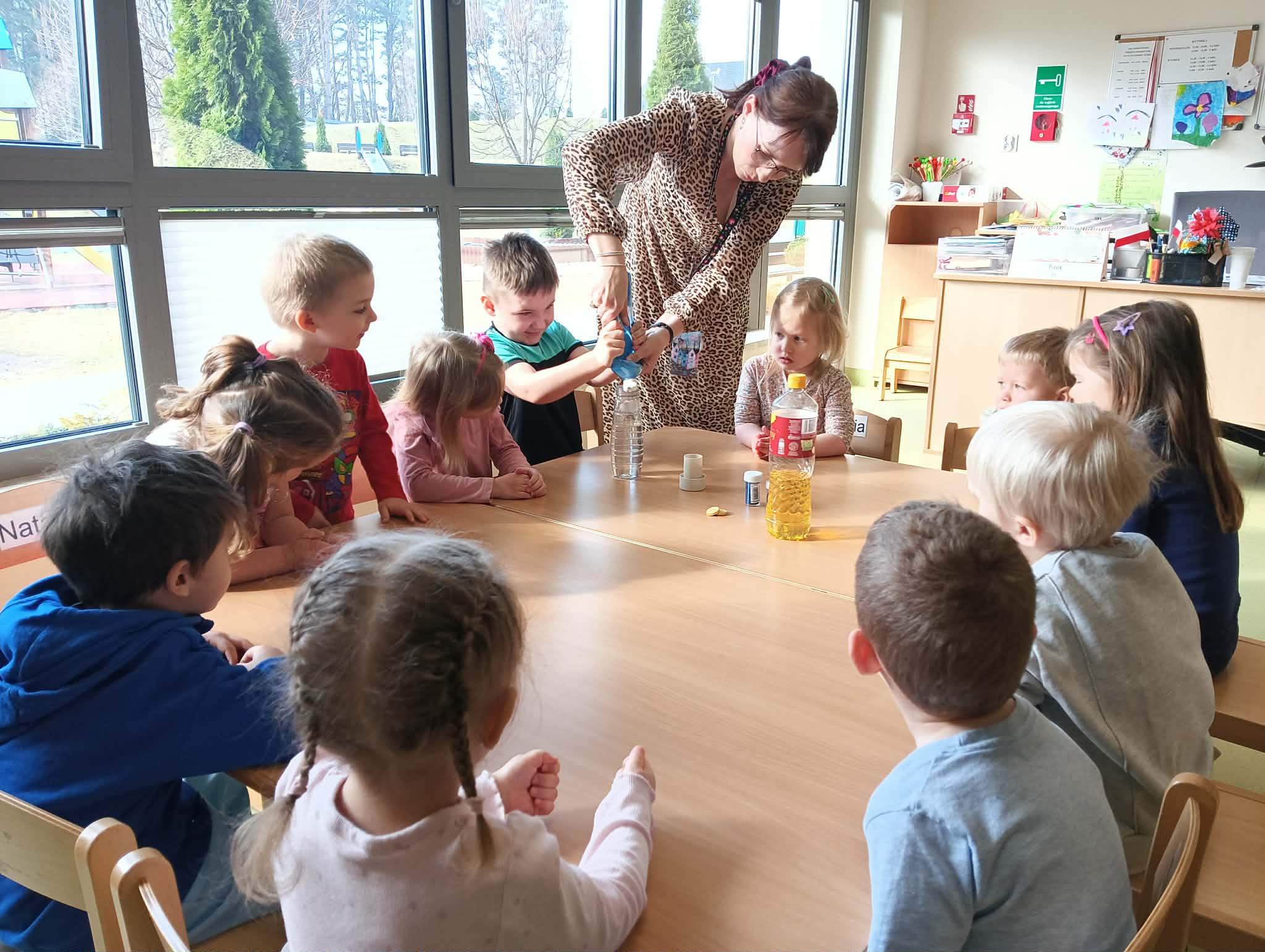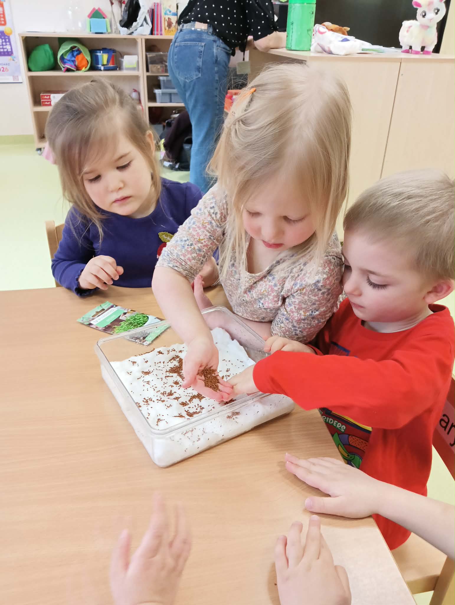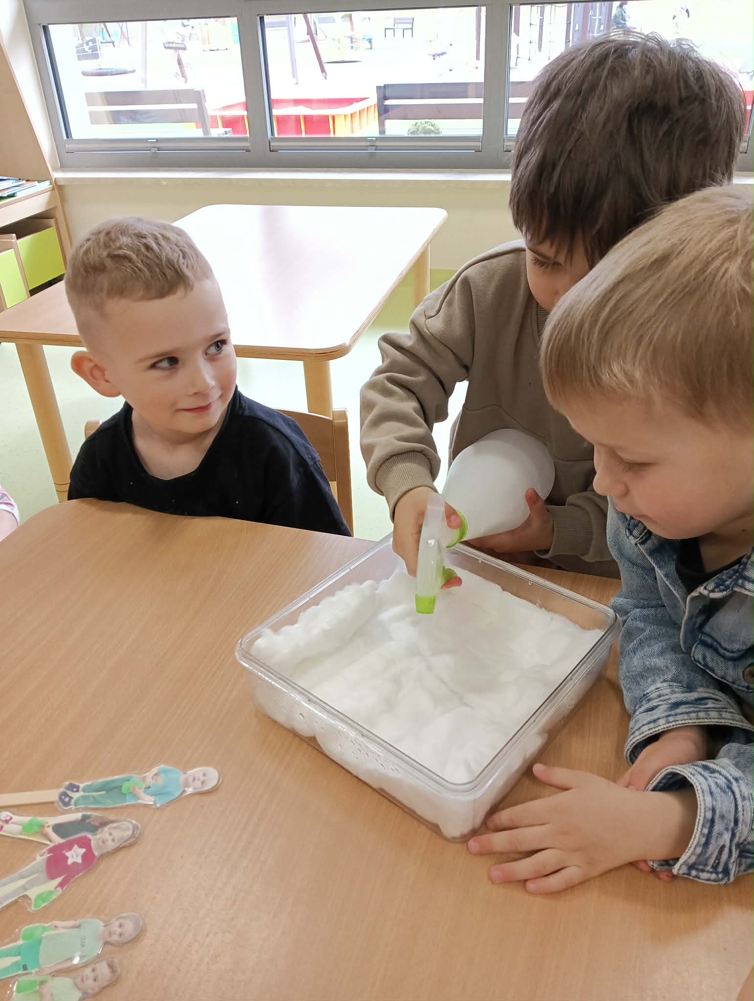 W ostatnim czasie nasza sala zamieniła się w prawdziwe laboratorium małych odkrywców! Dzieci miały okazję eksperymentować, poznawać świat wszystkimi zmysłami i świetnie się przy tym bawić. Rozpoczęliśmy od zabaw z kolorami i nastrojami – dzieci odkrywały, jak barwy mogą wyrażać emocje. Dużo radości przyniosło także tworzenie „gwałtownej pogody w butelce”, gdzie mali badacze obserwowali powstawanie burzy i mieszanie się składników. Ogromnym zainteresowaniem cieszyła się stacja sensoryczna „Kurnik”. Dzieci wcielały się w rolę opiekunów zwierząt – przytulały kury, zbierały jajka i dbały o porządek w zagrodzie, ucząc się przy tym odpowiedzialności i rozwijając wyobraźnię. Wiosenna taca sensoryczna „Pszczółki” pozwoliła dzieciom doświadczać różnorodnych faktur i materiałów. Podczas zabawy rozwijały małą motorykę, koordynację oraz wrażliwość sensoryczną. Nie zabrakło także pierwszych ogrodniczych doświadczeń – wspólnie zasadziliśmy rzeżuchę, którą teraz codziennie pielęgnujemy i obserwujemy jej wzrost. Z ciekawością przyglądamy się również cebuli umieszczonej w słoiku z wodą, sprawdzając, jak się zmienia i rośnie. To jest czas pełen odkryć, radości i nauki poprzez zabawę – dokładnie tak, jak lubimy najbardziej!