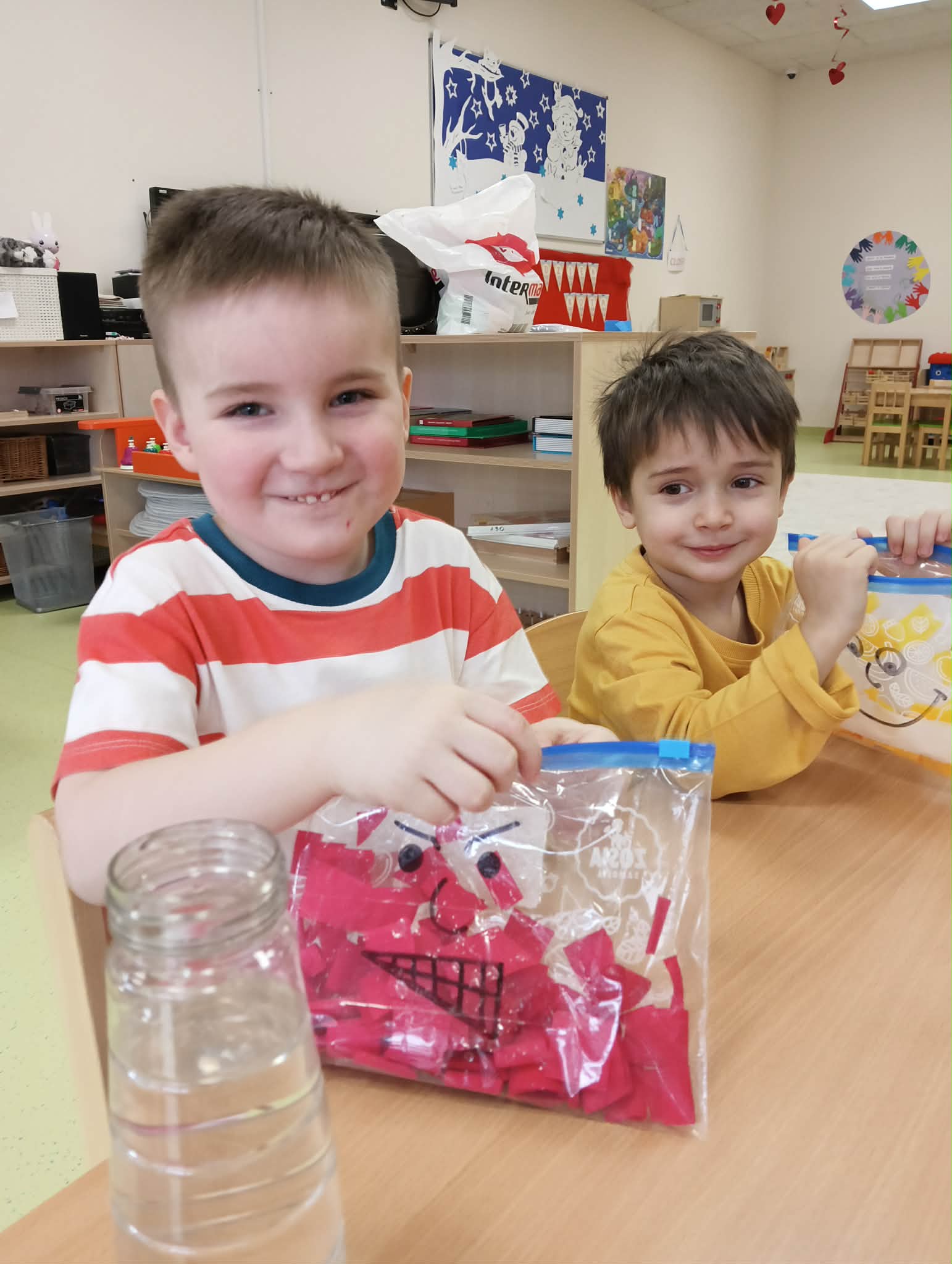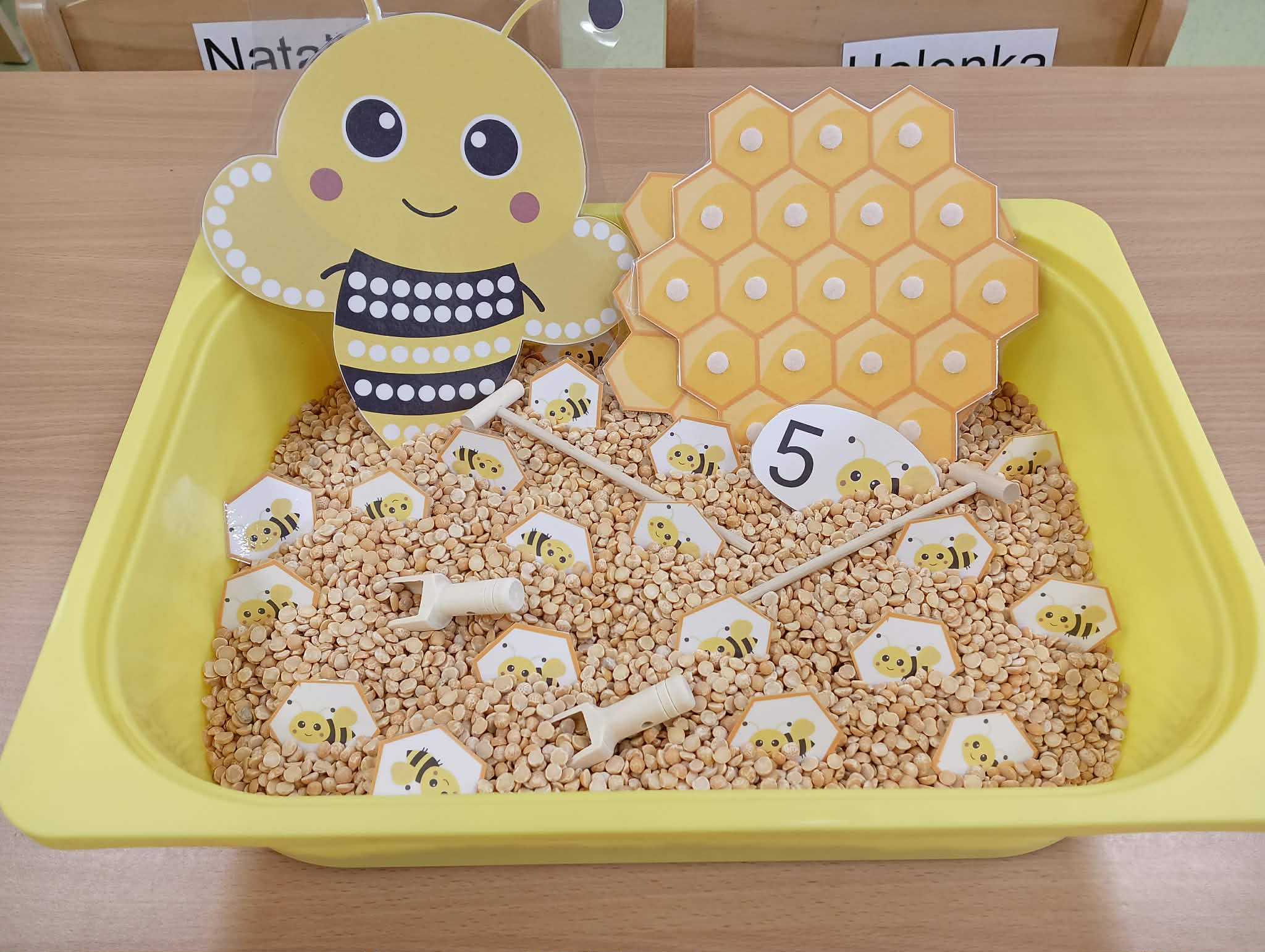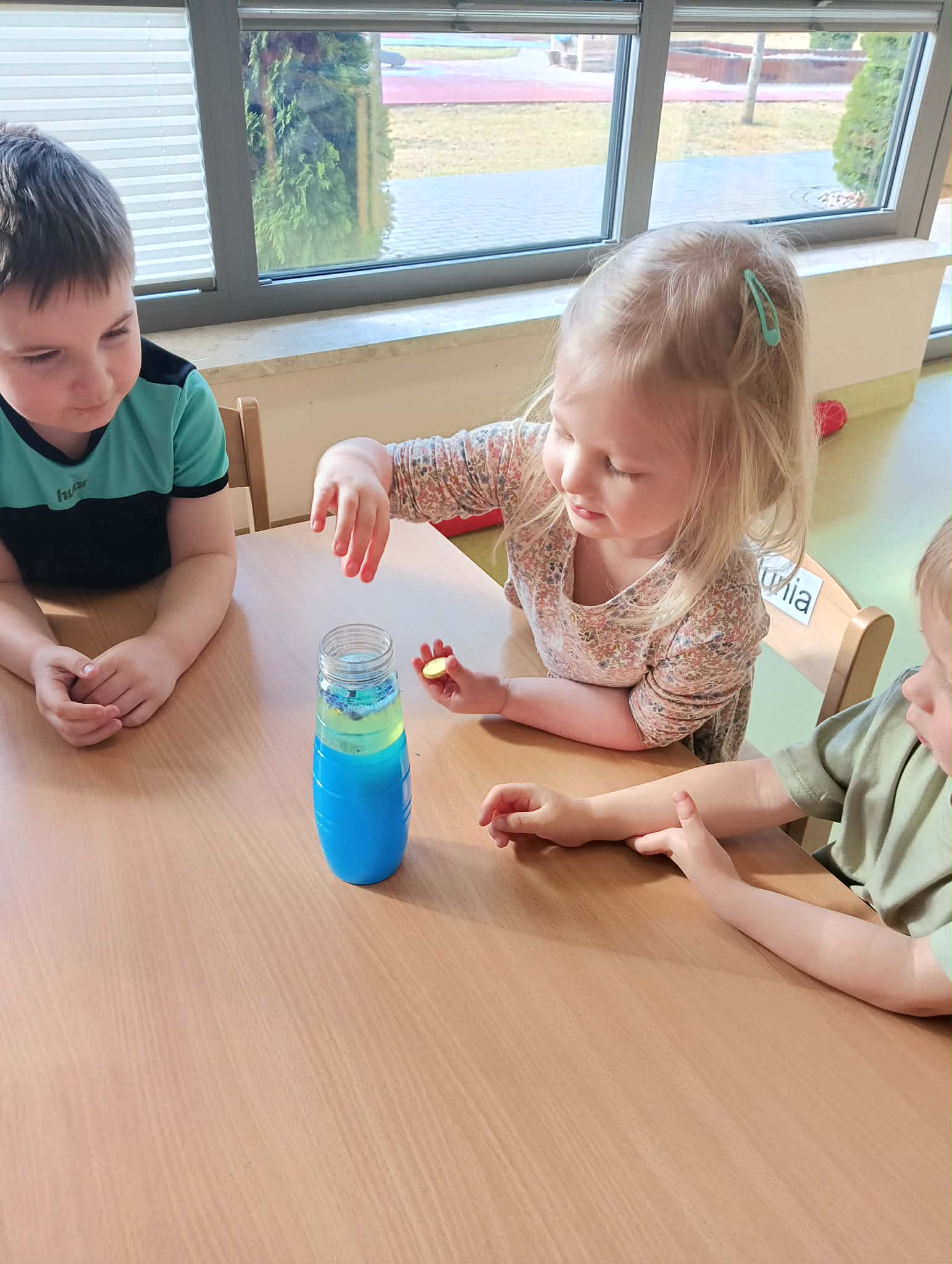 W ostatnim czasie nasza sala zamieniła się w prawdziwe laboratorium małych odkrywców! Dzieci miały okazję eksperymentować, poznawać świat wszystkimi zmysłami i świetnie się przy tym bawić. Rozpoczęliśmy od zabaw z kolorami i nastrojami – dzieci odkrywały, jak barwy mogą wyrażać emocje. Dużo radości przyniosło także tworzenie „gwałtownej pogody w butelce”, gdzie mali badacze obserwowali powstawanie burzy i mieszanie się składników. Ogromnym zainteresowaniem cieszyła się stacja sensoryczna „Kurnik”. Dzieci wcielały się w rolę opiekunów zwierząt – przytulały kury, zbierały jajka i dbały o porządek w zagrodzie, ucząc się przy tym odpowiedzialności i rozwijając wyobraźnię. Wiosenna taca sensoryczna „Pszczółki” pozwoliła dzieciom doświadczać różnorodnych faktur i materiałów. Podczas zabawy rozwijały małą motorykę, koordynację oraz wrażliwość sensoryczną. Nie zabrakło także pierwszych ogrodniczych doświadczeń – wspólnie zasadziliśmy rzeżuchę, którą teraz codziennie pielęgnujemy i obserwujemy jej wzrost. Z ciekawością przyglądamy się również cebuli umieszczonej w słoiku z wodą, sprawdzając, jak się zmienia i rośnie. To jest czas pełen odkryć, radości i nauki poprzez zabawę – dokładnie tak, jak lubimy najbardziej!