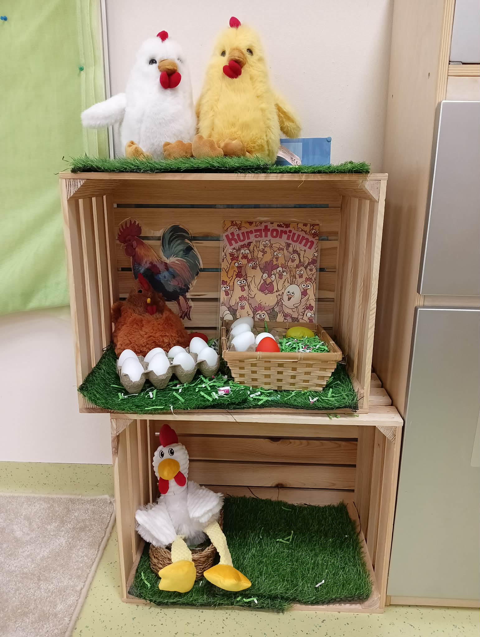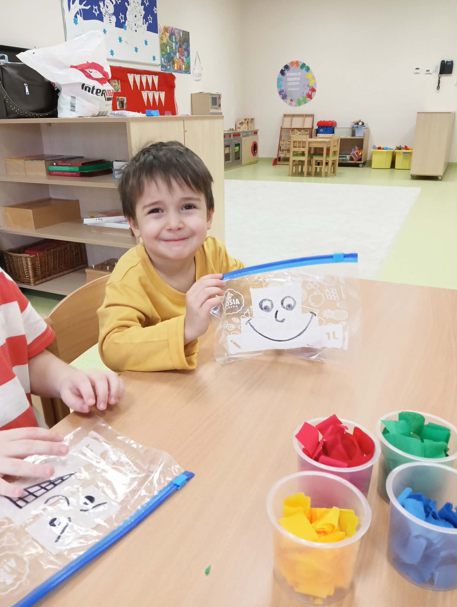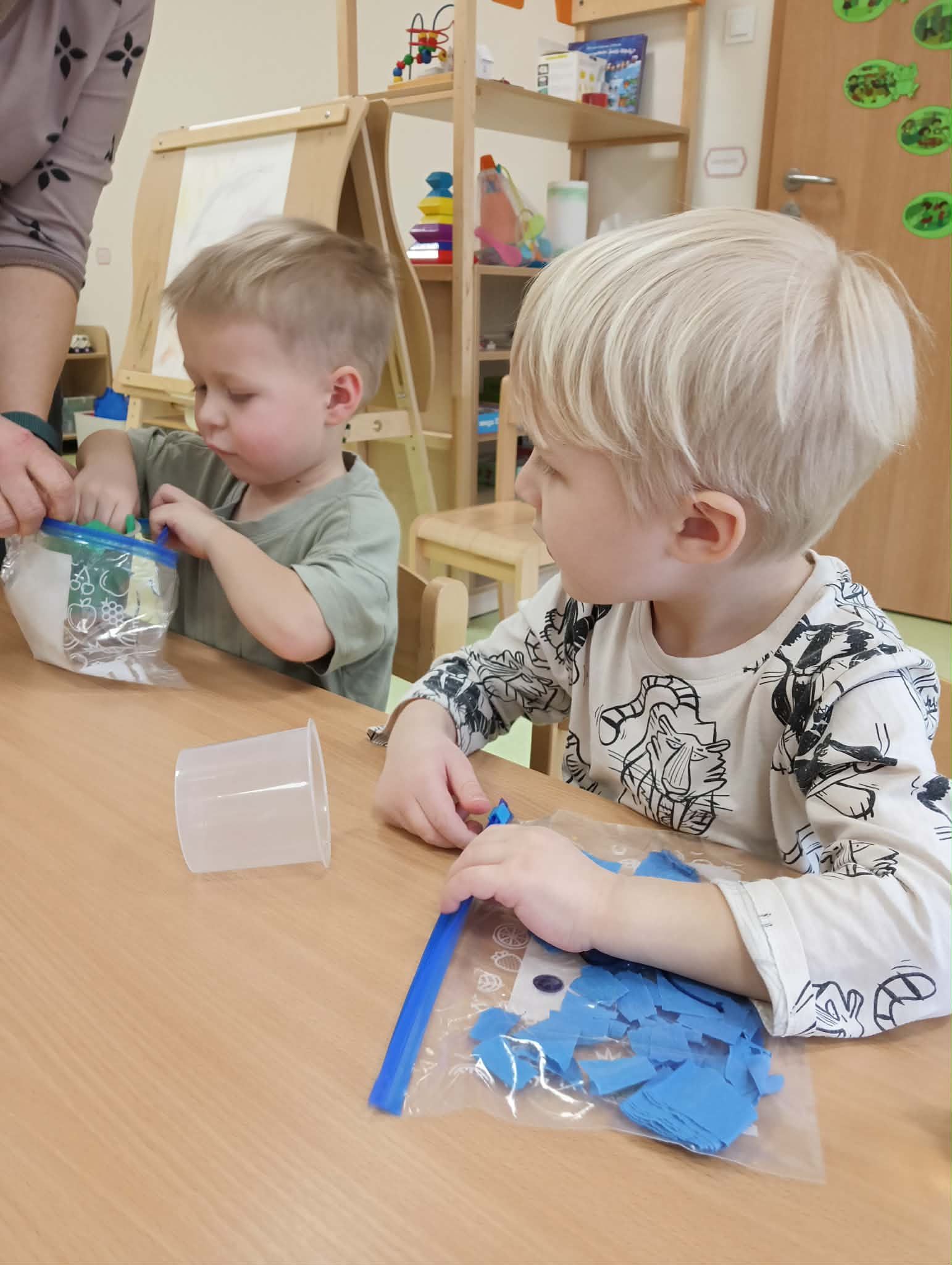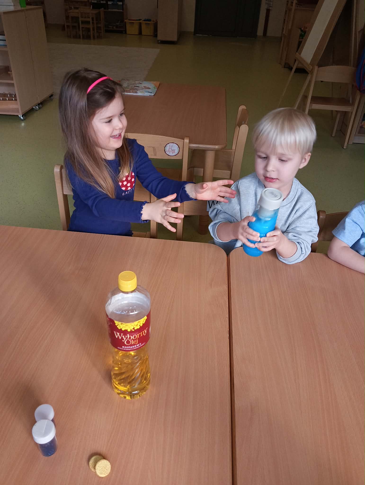W ostatnim czasie nasza sala zamieniła się w prawdziwe laboratorium małych odkrywców! Dzieci miały okazję eksperymentować, poznawać świat wszystkimi zmysłami i świetnie się przy tym bawić. Rozpoczęliśmy od zabaw z kolorami i nastrojami – dzieci odkrywały, jak barwy mogą wyrażać emocje. Dużo radości przyniosło także tworzenie „gwałtownej pogody w butelce”, gdzie mali badacze obserwowali powstawanie burzy i mieszanie się składników. Ogromnym zainteresowaniem cieszyła się stacja sensoryczna „Kurnik”. Dzieci wcielały się w rolę opiekunów zwierząt – przytulały kury, zbierały jajka i dbały o porządek w zagrodzie, ucząc się przy tym odpowiedzialności i rozwijając wyobraźnię. Wiosenna taca sensoryczna „Pszczółki” pozwoliła dzieciom doświadczać różnorodnych faktur i materiałów. Podczas zabawy rozwijały małą motorykę, koordynację oraz wrażliwość sensoryczną. Nie zabrakło także pierwszych ogrodniczych doświadczeń – wspólnie zasadziliśmy rzeżuchę, którą teraz codziennie pielęgnujemy i obserwujemy jej wzrost. Z ciekawością przyglądamy się również cebuli umieszczonej w słoiku z wodą, sprawdzając, jak się zmienia i rośnie. To jest czas pełen odkryć, radości i nauki poprzez zabawę – dokładnie tak, jak lubimy najbardziej!