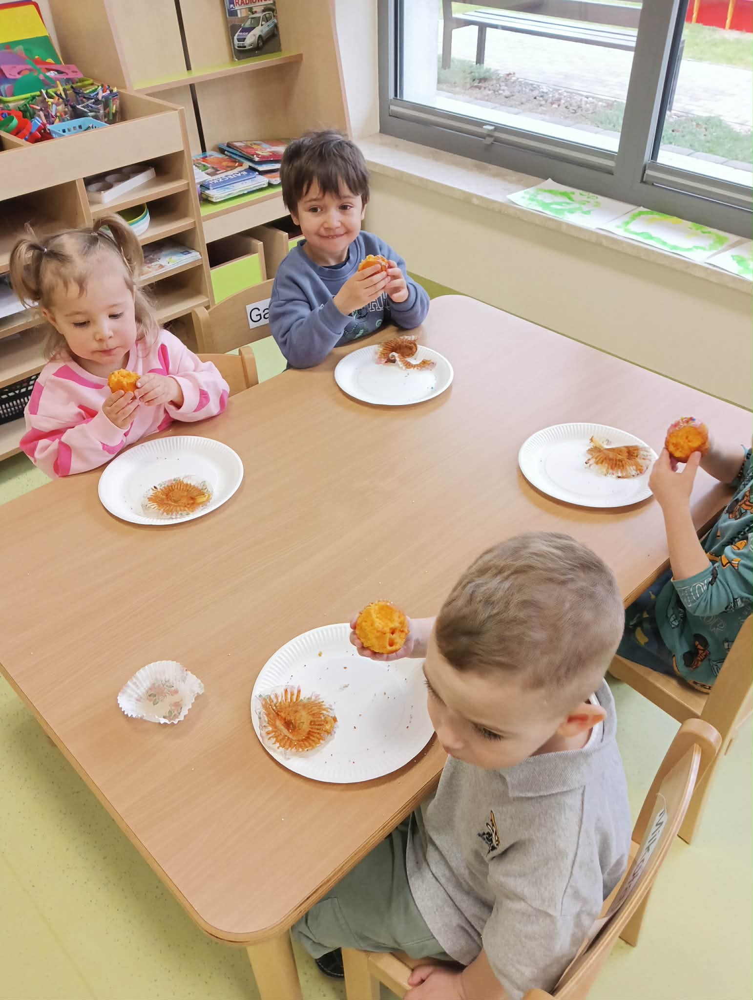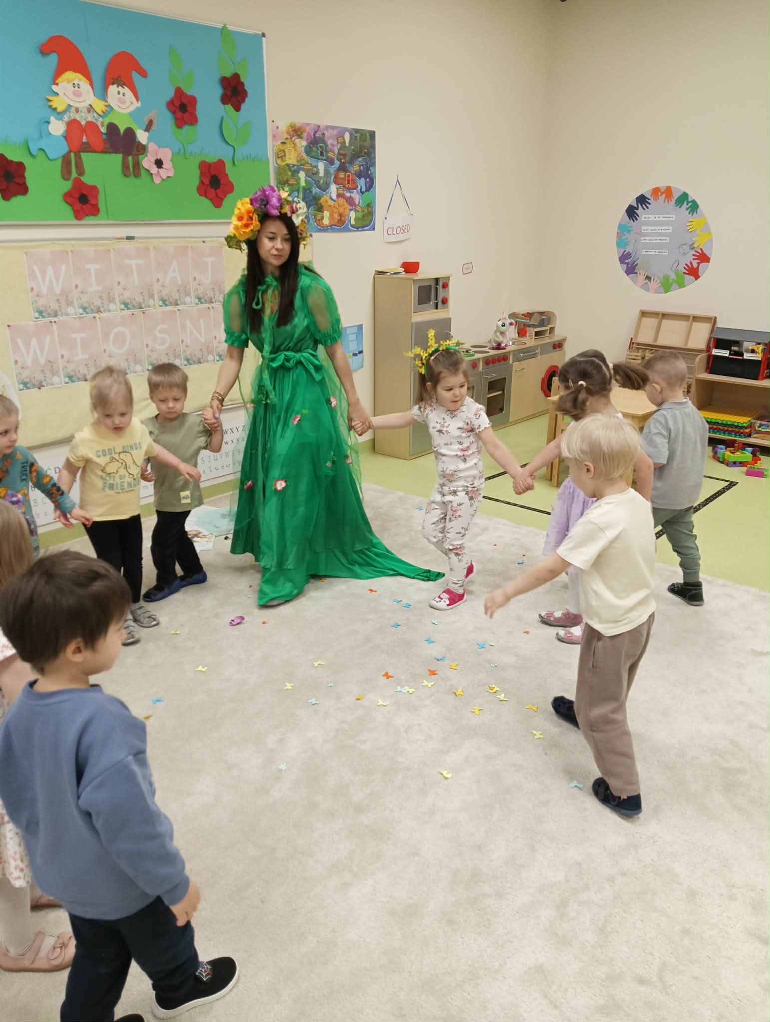 Do przedszkola zawitała wyjątkowa Pani Wiosna – jedna z mam, która zachwyciła dzieci piękną, kolorową suknią i wiankiem na głowie. Z uśmiechem poprowadziła dla przedszkolaków wesołe zabawy, przygotowała ciekawą pracę plastyczną oraz słodką niespodziankę w postaci pysznych babeczek. To był pełen radości i wiosennej energii dzień, który na długo pozostanie w naszej pamięci!