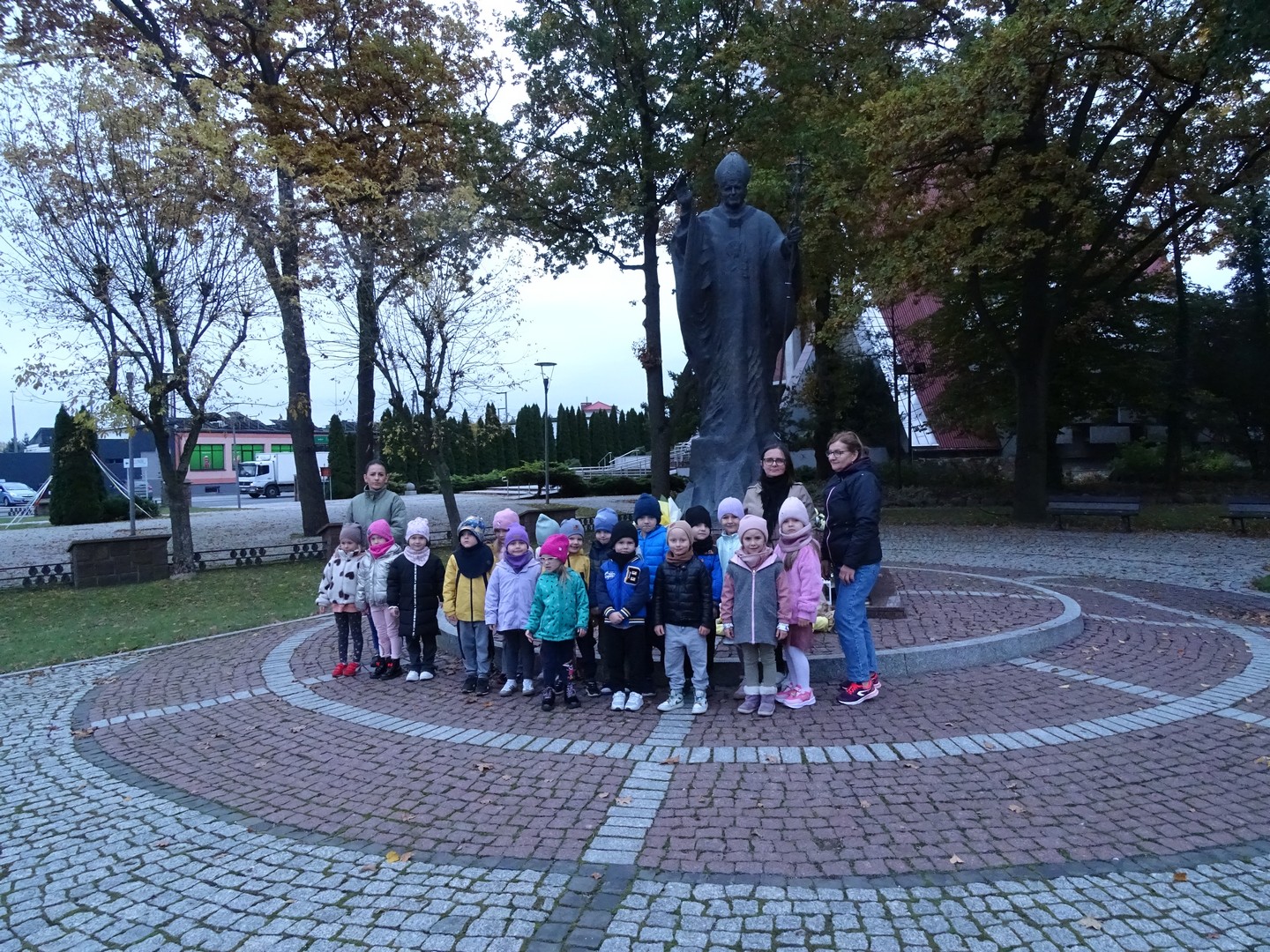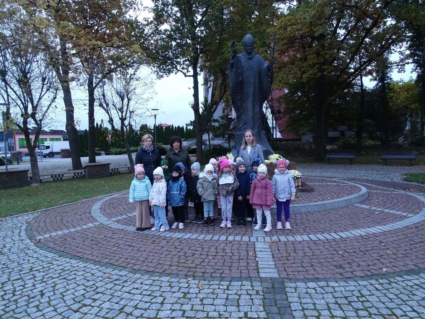 Dnia 16 października br. , w dniu papieskim, przedszkolaki z grup „Jeżyki” i „Słoneczka” odwiedziły pomnik Jana Pawła II, aby uczcić pamięć naszego Wielkiego Papieża. Dzieci z ogromnym zaangażowaniem zapaliły symboliczny znicz, oddając hołd świętemu Janowi Pawłowi II, który przez swoje życie inspirował pokolenia Polaków i ludzi na całym świecie. To wzruszające wydarzenie było dla naszych przedszkolaków okazją do poznania historii i wartości, które Papież promował, a także do wyrażenia swojej pamięci i szacunku. Jesteśmy dumni, że mogliśmy wspólnie uczcić ten ważny dzień, kładąc nacisk na wartości miłości, pokoju i tolerancji, które Papież tak mocno podkreślał w swoim życiu.