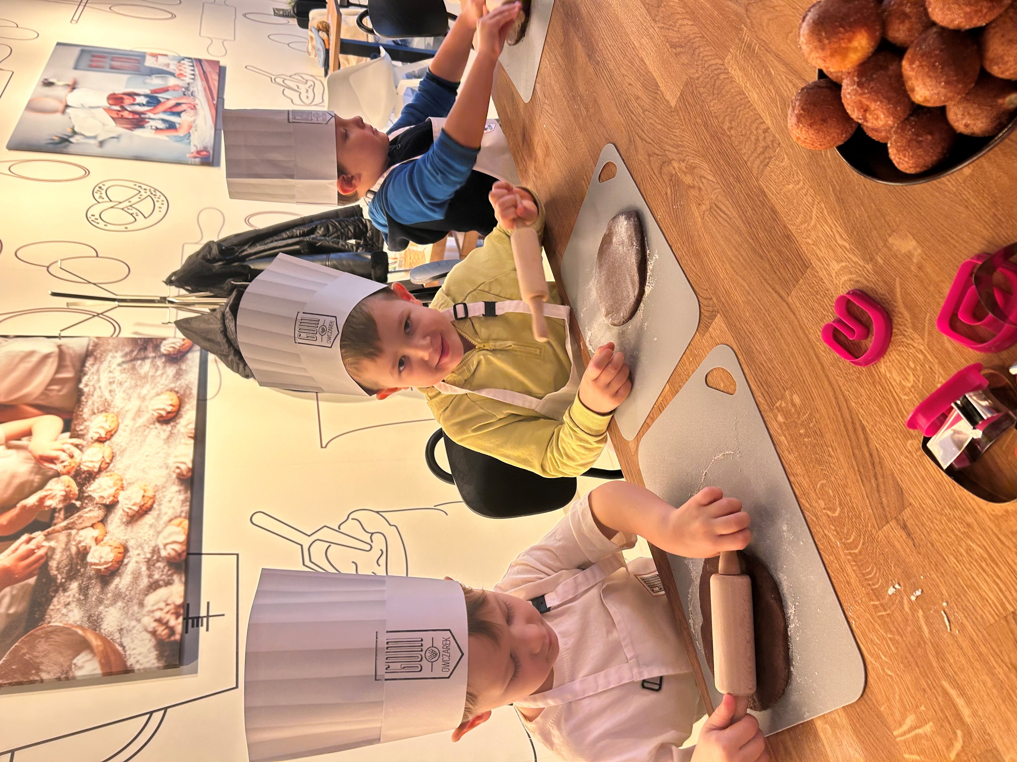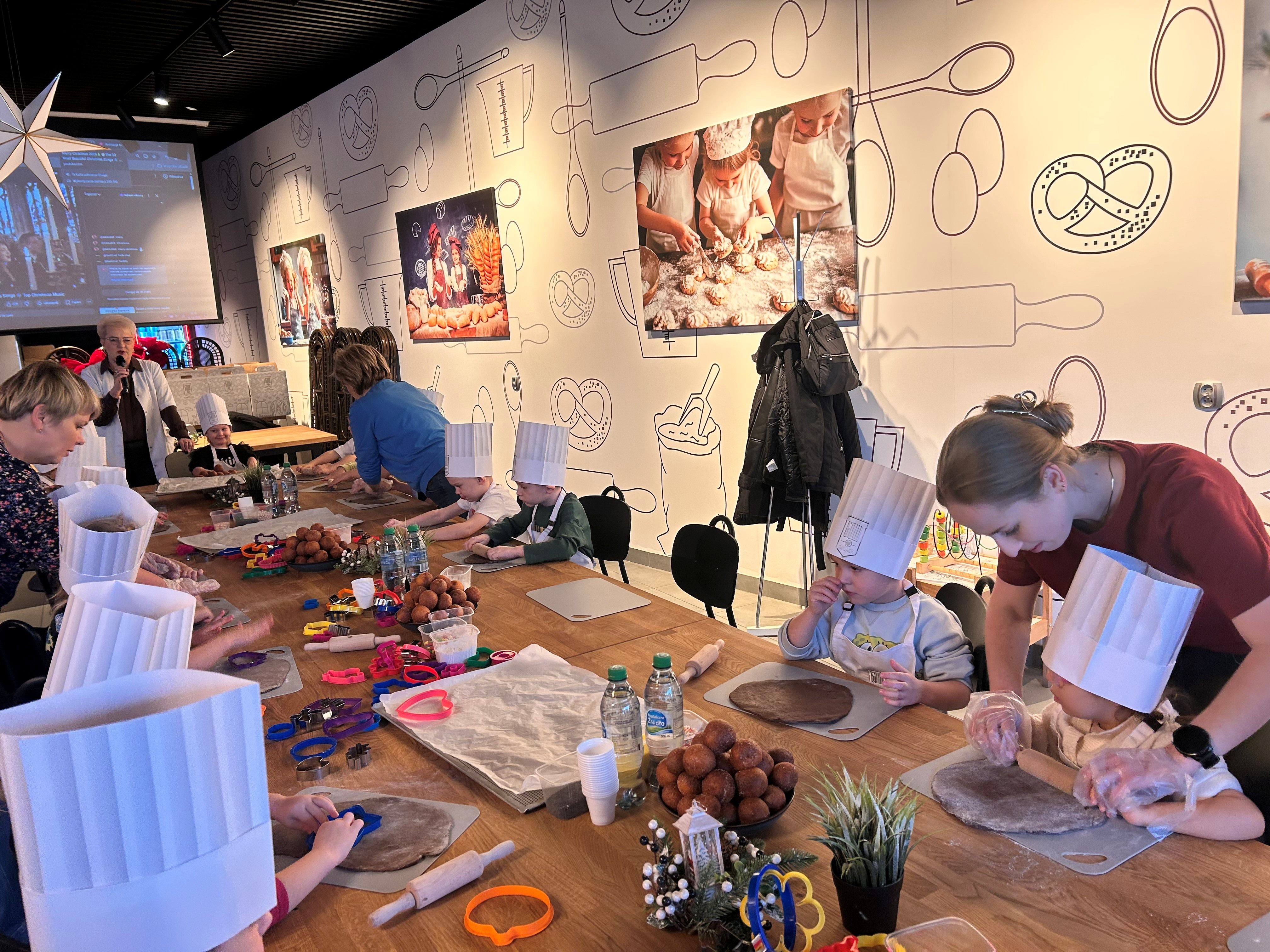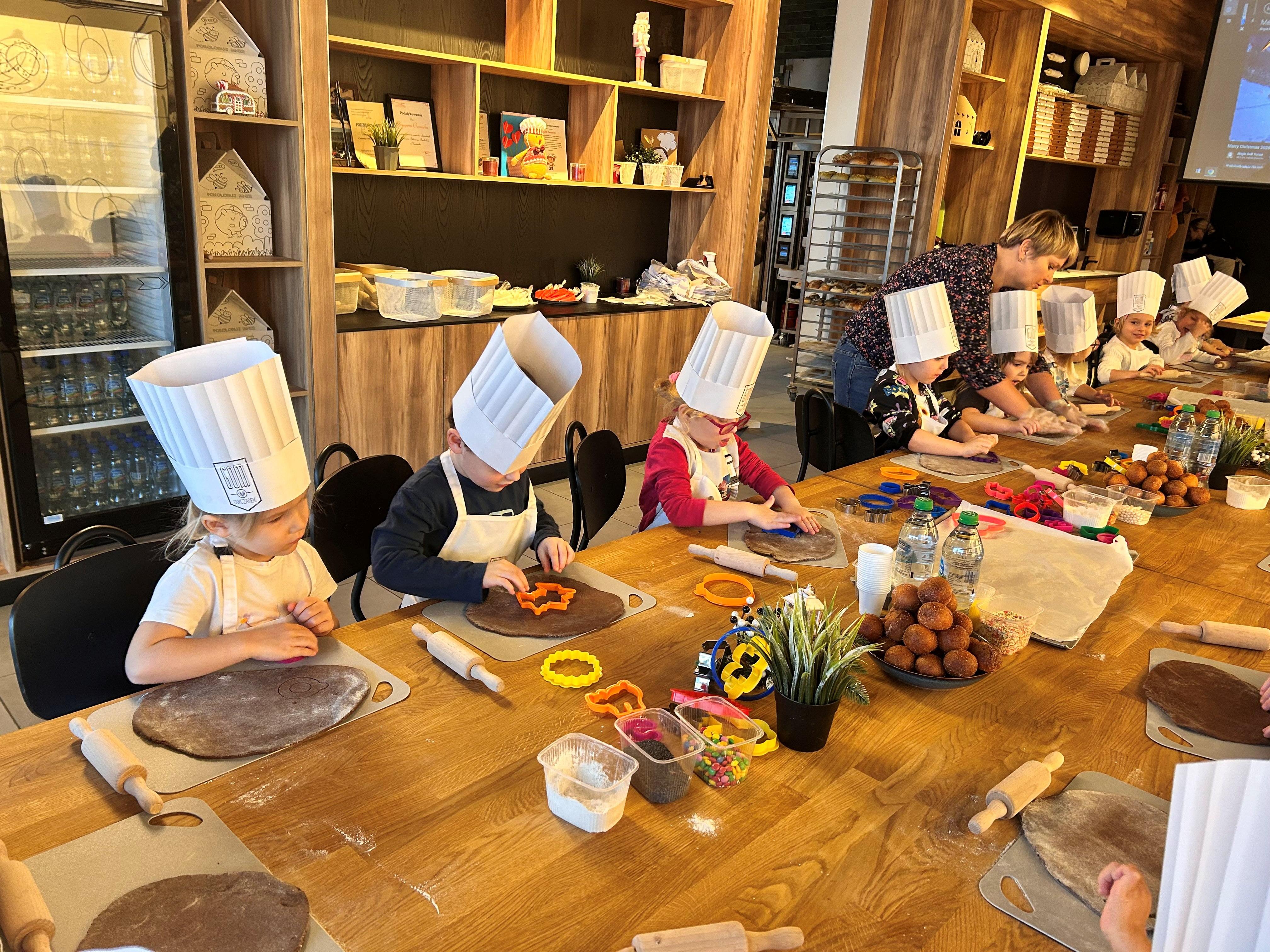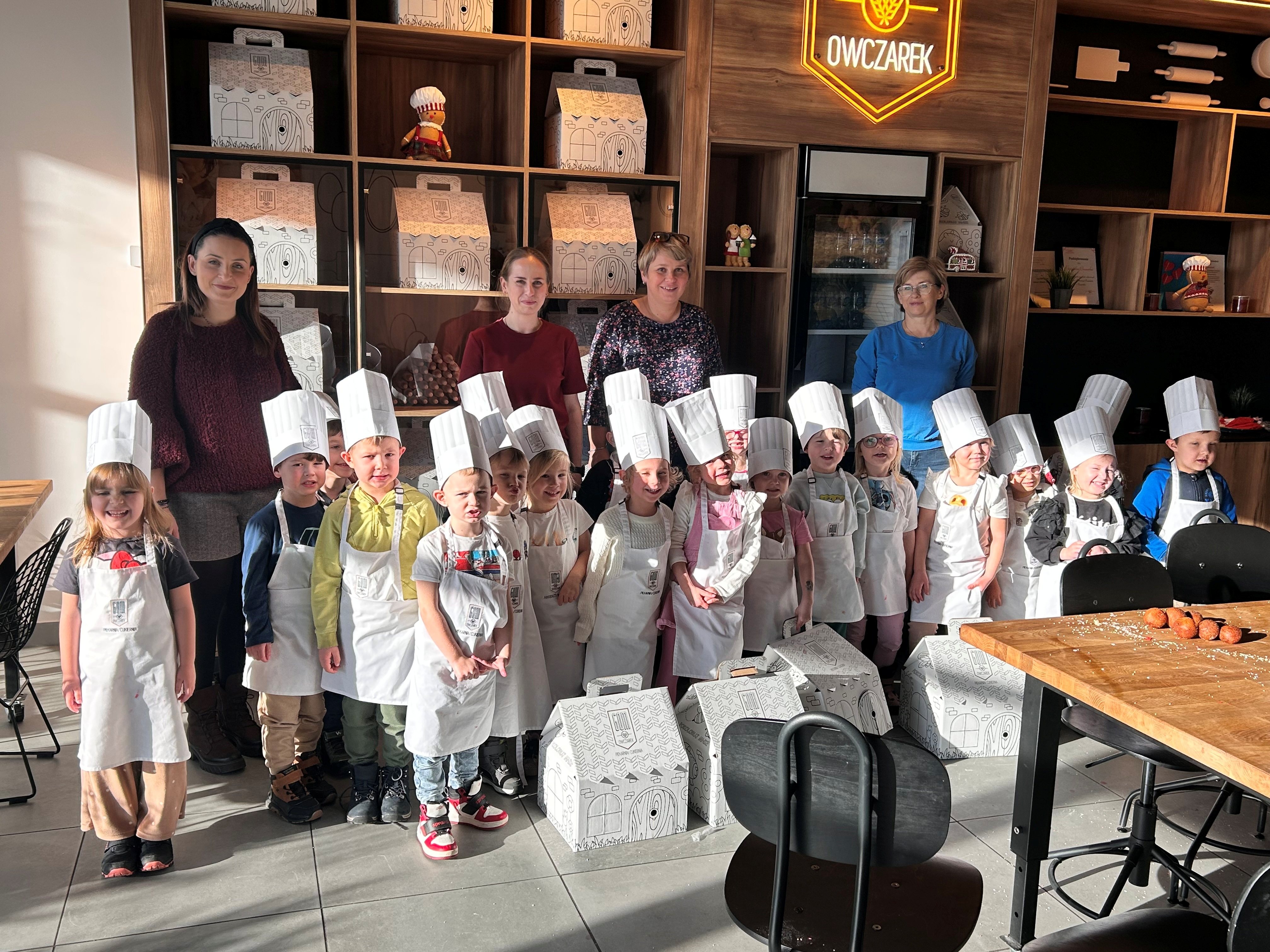 Wycieczka do piekarni sprawiła dzieciom mnóstwo radości. Przedszkolaki szybko odkryły, że wałkowania ciasta to nie lada wyczyn ! Dzieci dzielnie wałkowały, ugniatały a następnie wycinały pierniczki w przeróżnych kształtach. Potem przyszła pora na zdobienie - brokatu, lukru było więcej na stołach , buziach i ubraniach niż na pierniczkach, ale za to zabawa była świetna. Nie zabrakło również wypieku kajzerek. Gdy w piekarni unosił się zapach pieczenia bułeczek i pierników przyszedł czas na poczęstunek. Na stołach pojawiły się przepyszne pączki oraz pachnąca pizza ! Przedszkolaki wróciły do domu z pełnymi brzuszkami, wspaniałymi prezentami i ogromnymi uśmiechami.
