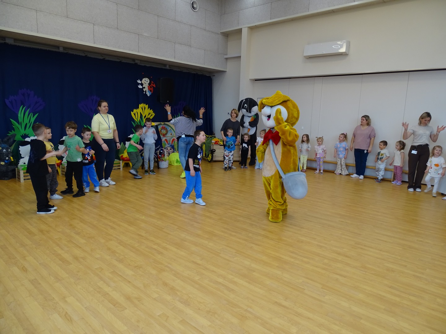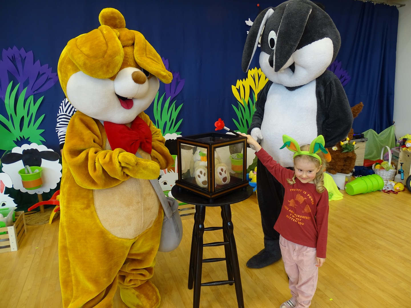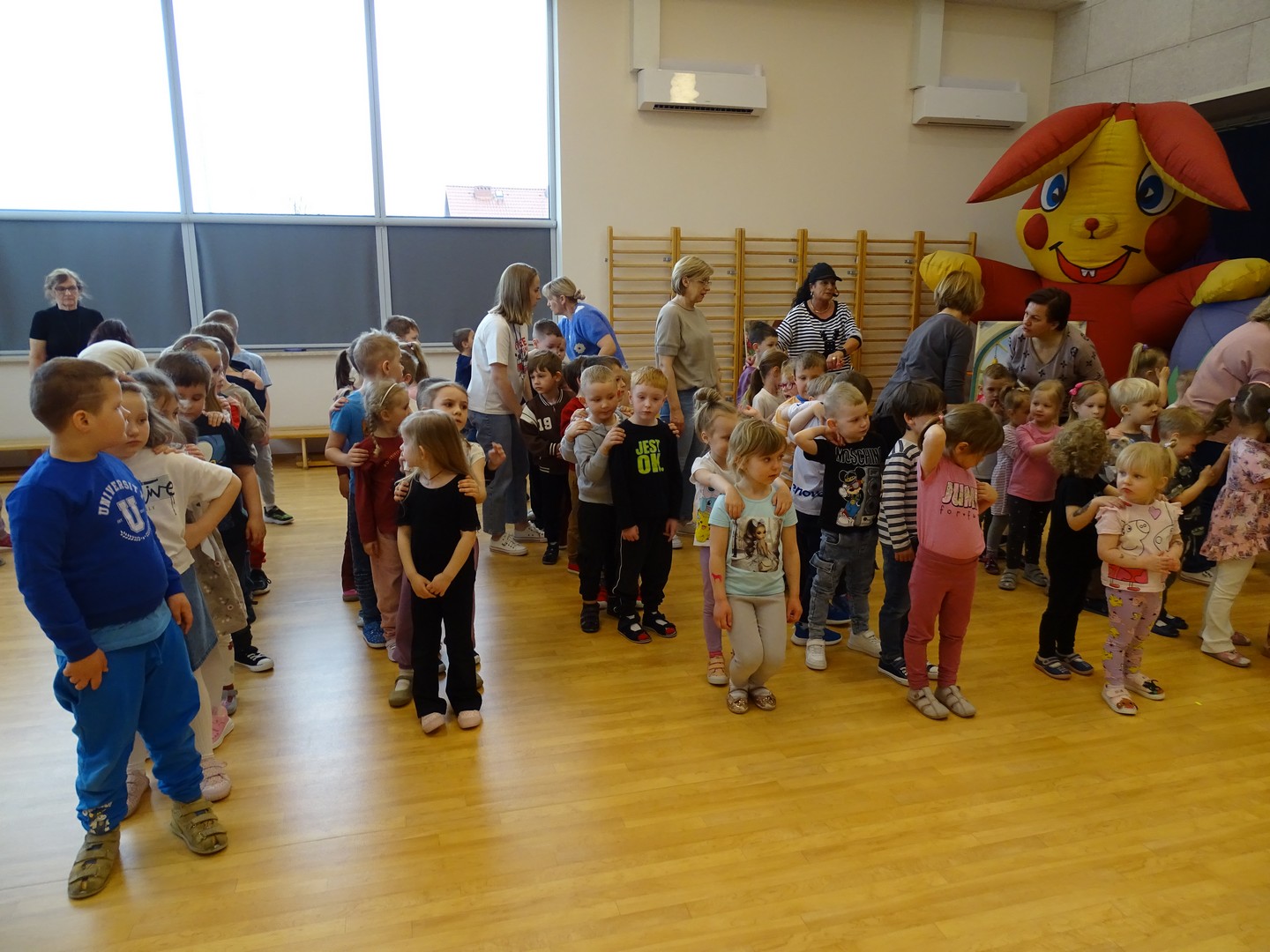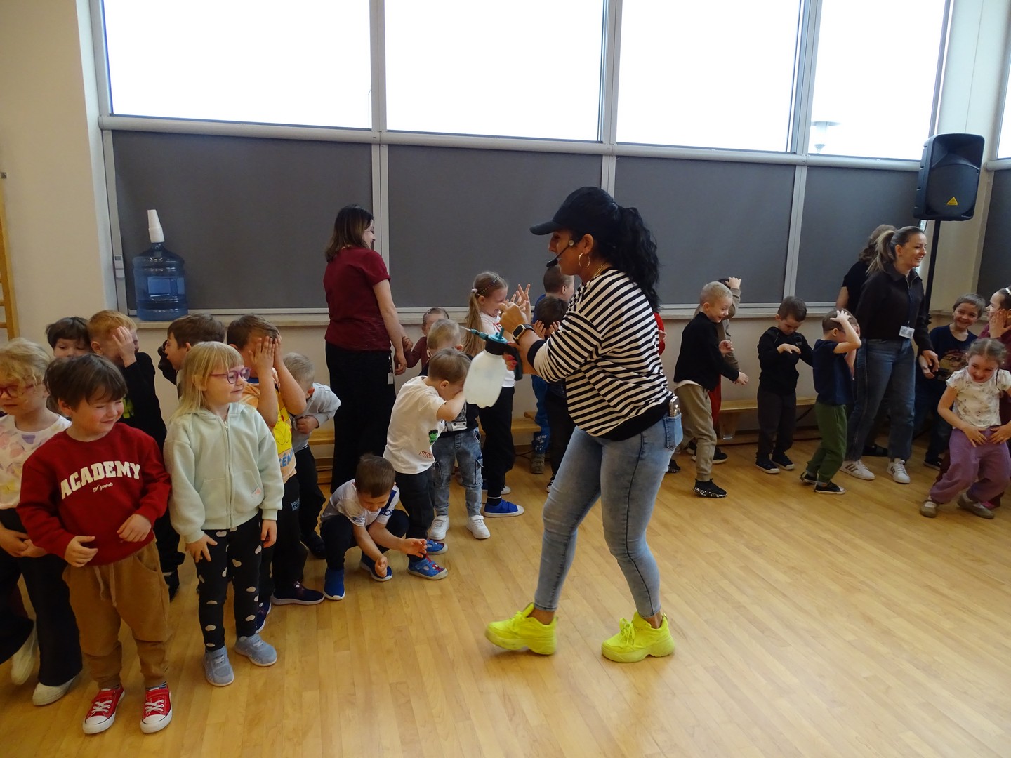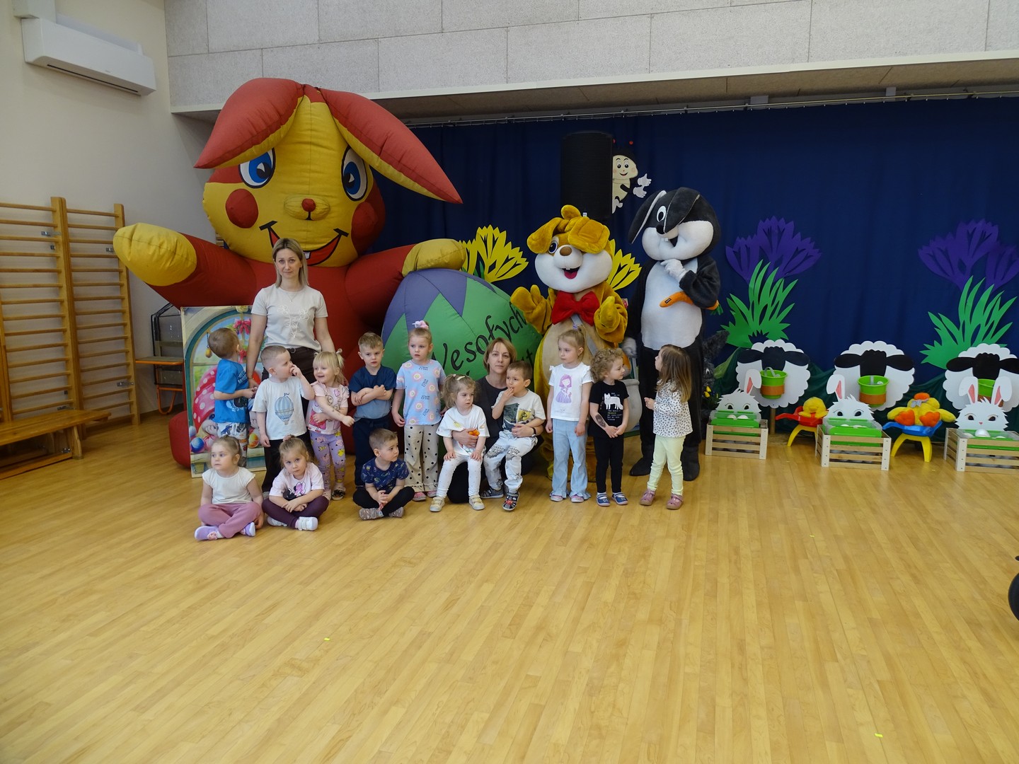 31 marca 2026r. w naszym przedszkolu odbyły się zabawy z zajączkiem prowadzone przez animatorów Rytmix. Była to interaktywna aktywność muzyczno-ruchowa, idealna na Wielkanoc, łącząca śpiew, taniec i liczenie. Dzieci naśladowały skoki zajączka, szukały ukrytych pisanek i marchewek oraz rytmicznie poruszały się do muzyki.