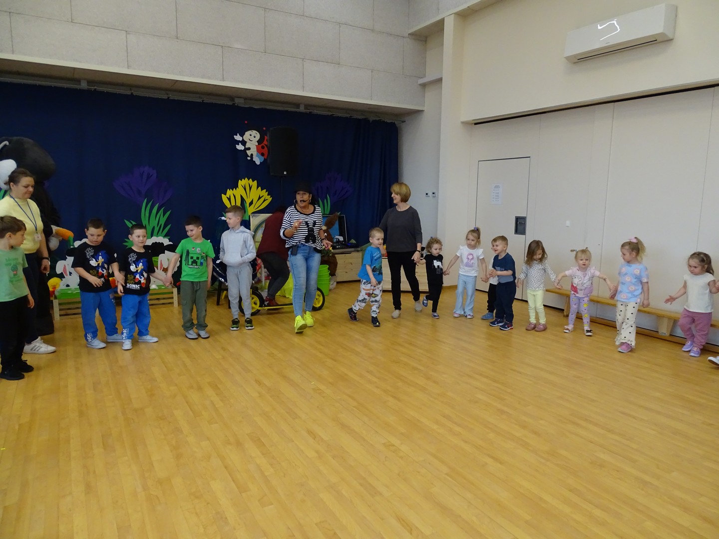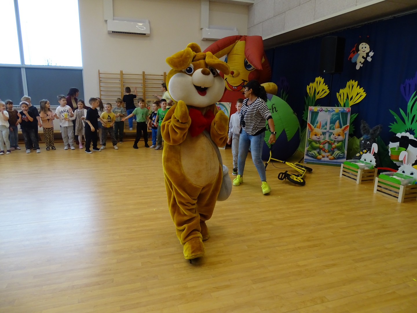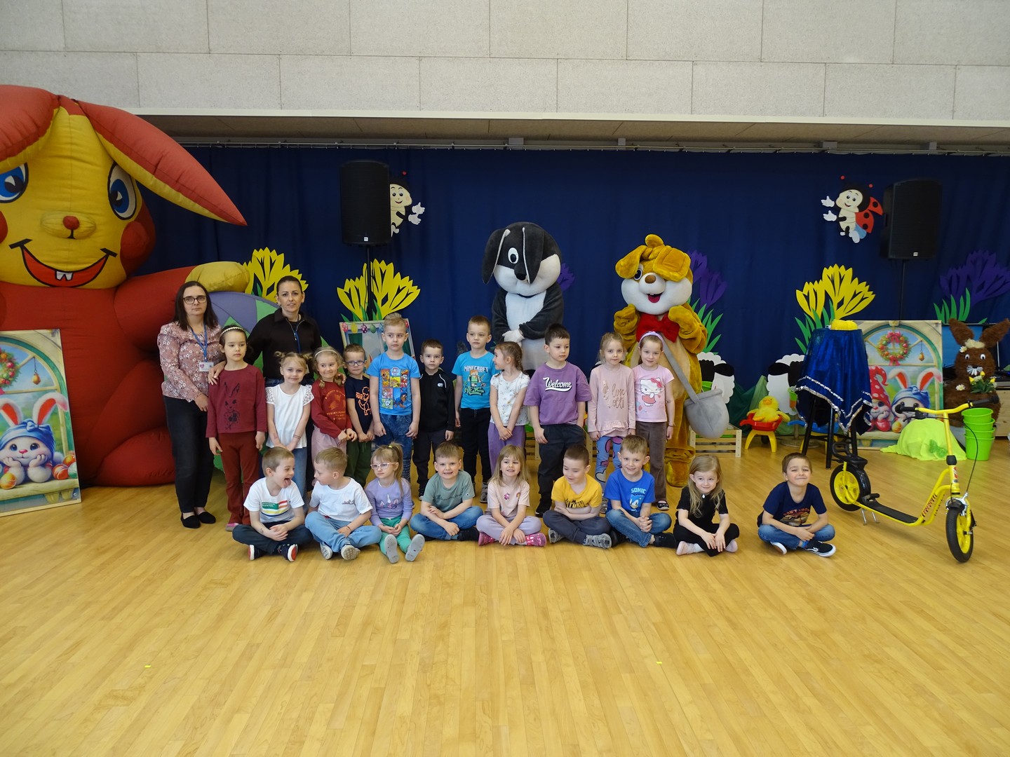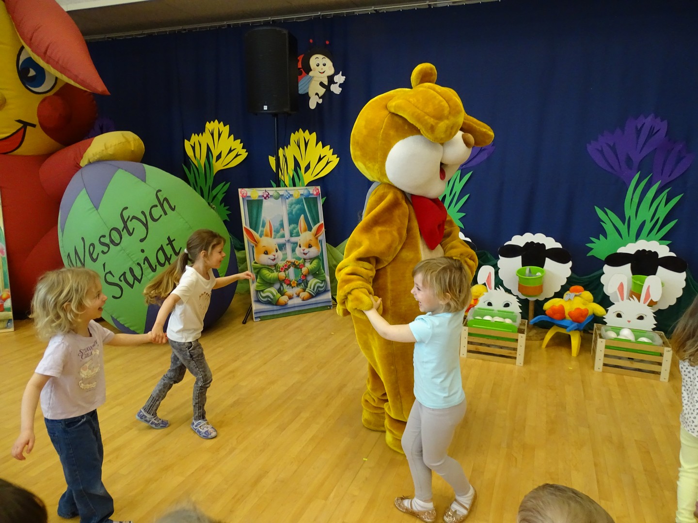 31 marca 2026r. w naszym przedszkolu odbyły się zabawy z zajączkiem prowadzone przez animatorów Rytmix. Była to interaktywna aktywność muzyczno-ruchowa, idealna na Wielkanoc, łącząca śpiew, taniec i liczenie. Dzieci naśladowały skoki zajączka, szukały ukrytych pisanek i marchewek oraz rytmicznie poruszały się do muzyki.