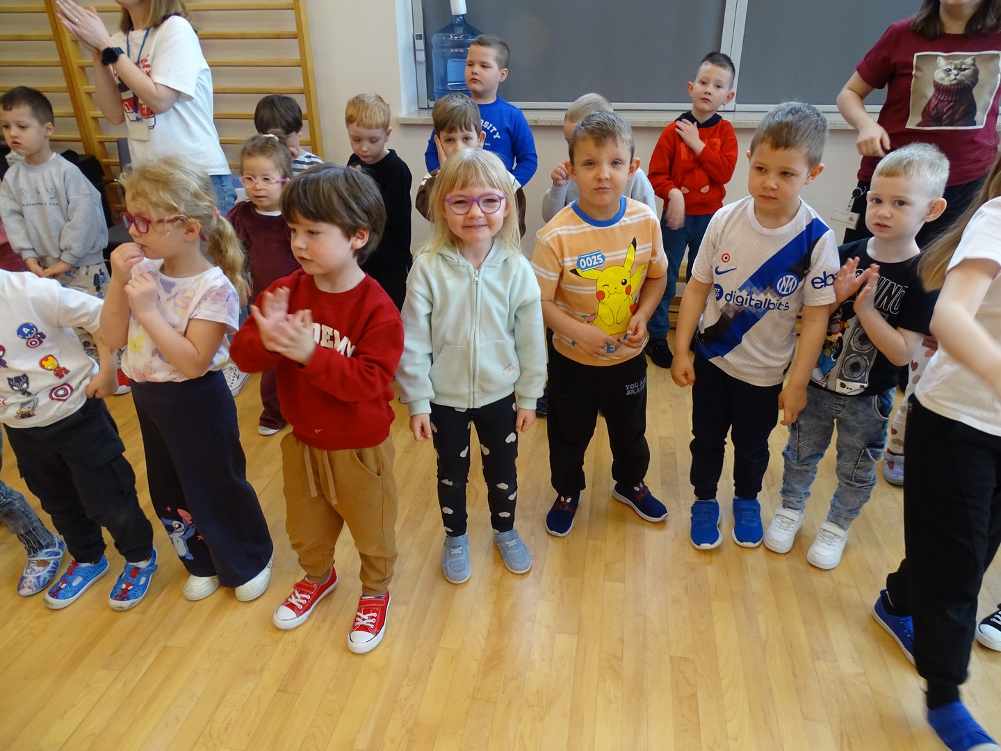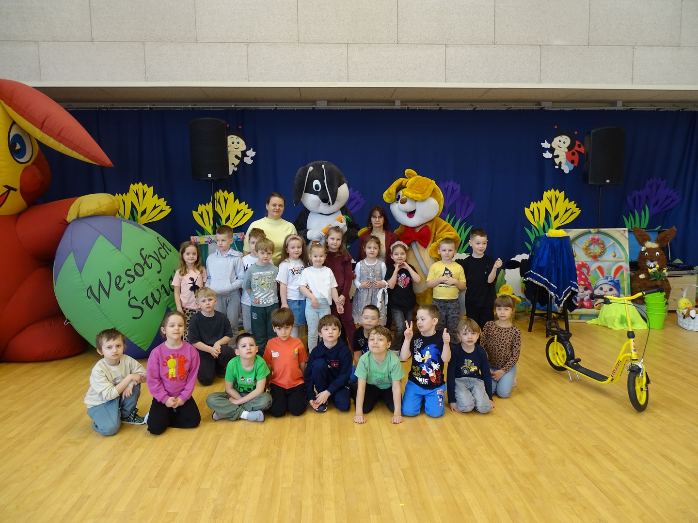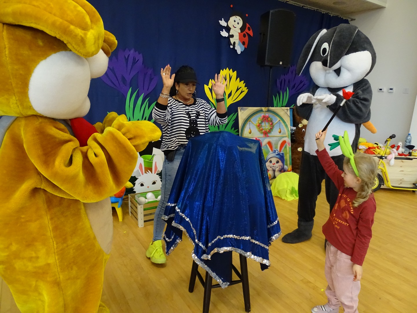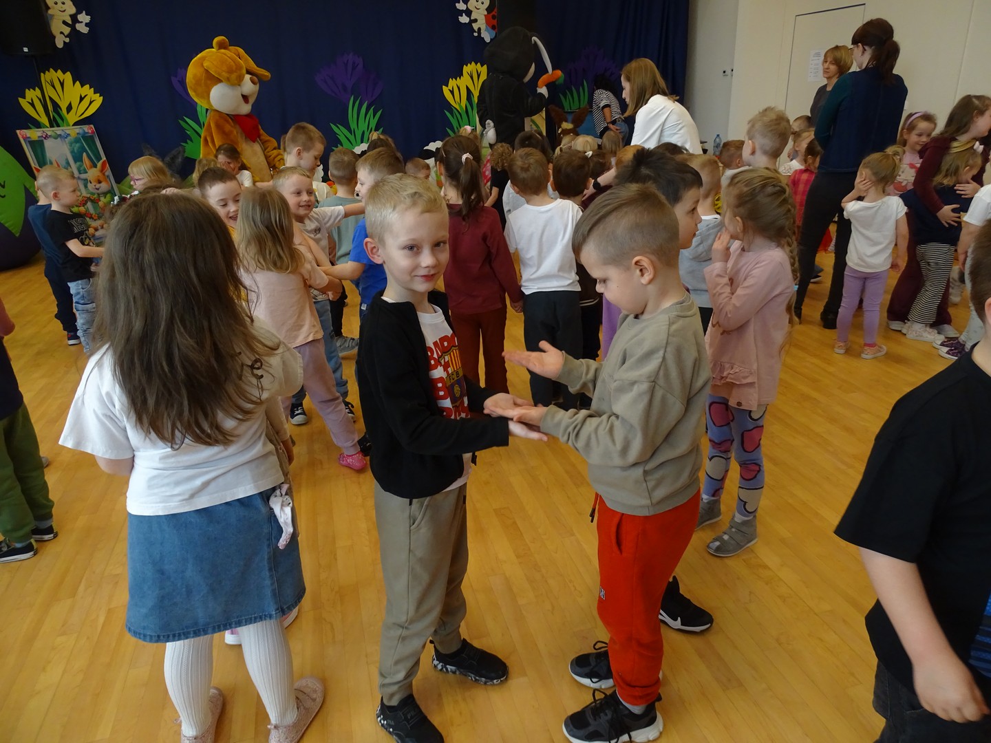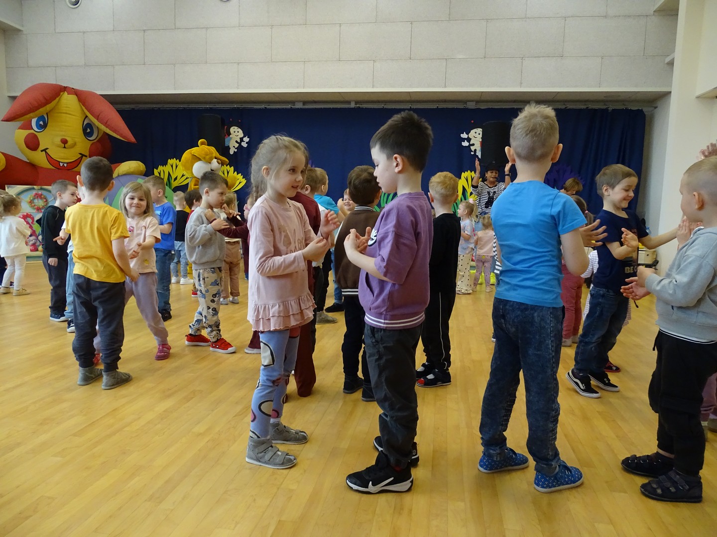 31 marca 2026r. w naszym przedszkolu odbyły się zabawy z zajączkiem prowadzone przez animatorów Rytmix. Była to interaktywna aktywność muzyczno-ruchowa, idealna na Wielkanoc, łącząca śpiew, taniec i liczenie. Dzieci naśladowały skoki zajączka, szukały ukrytych pisanek i marchewek oraz rytmicznie poruszały się do muzyki.