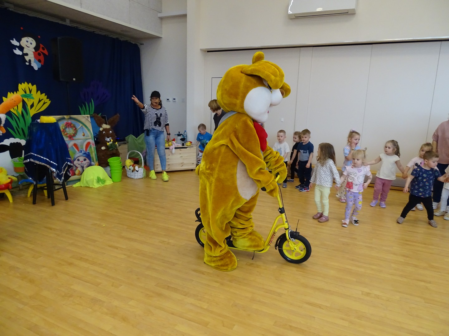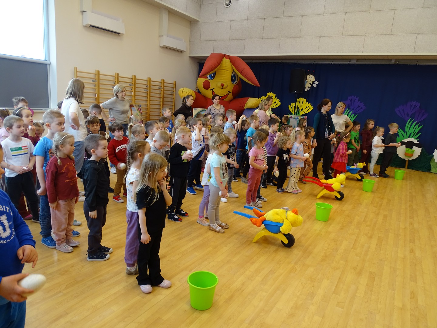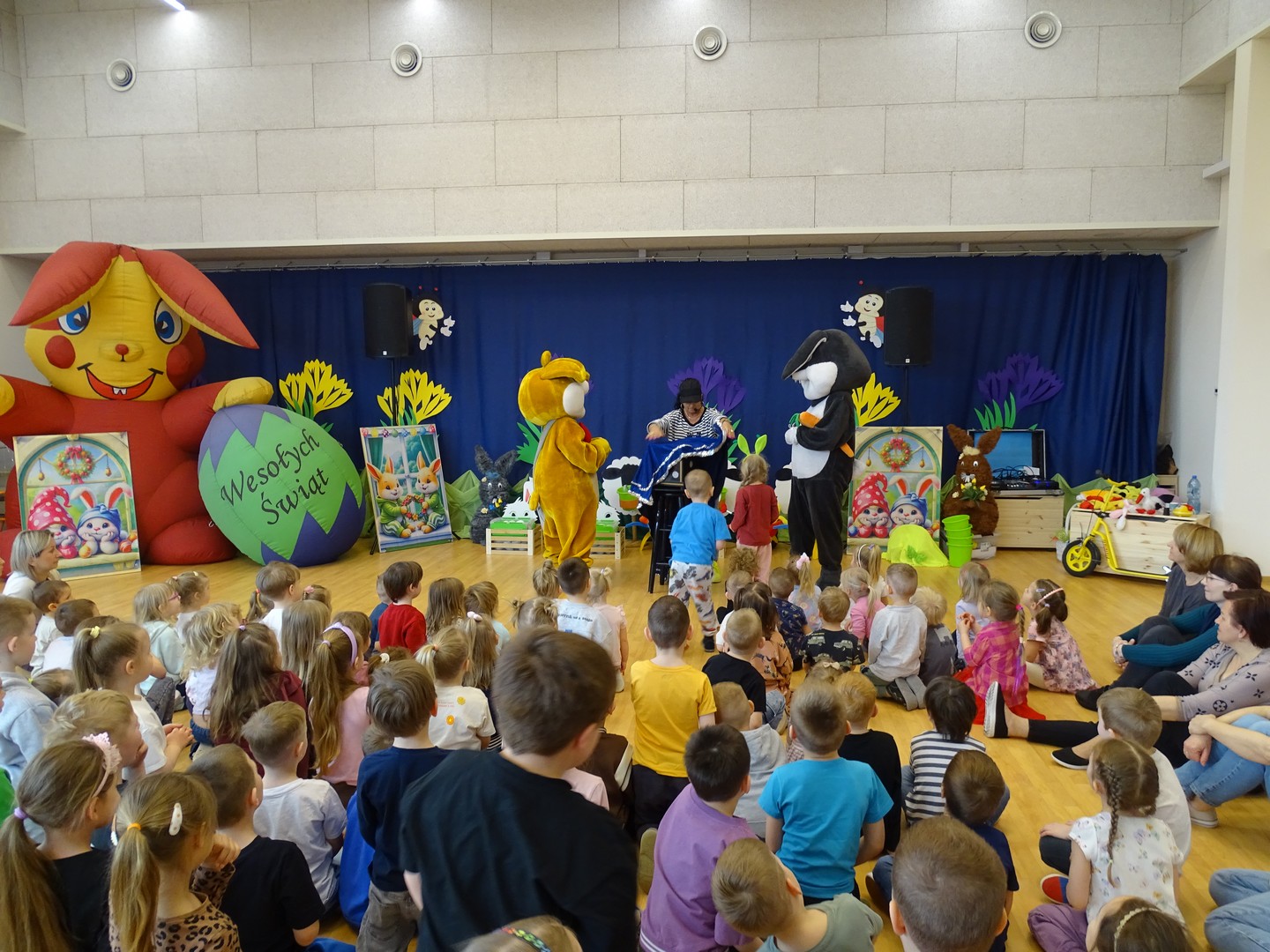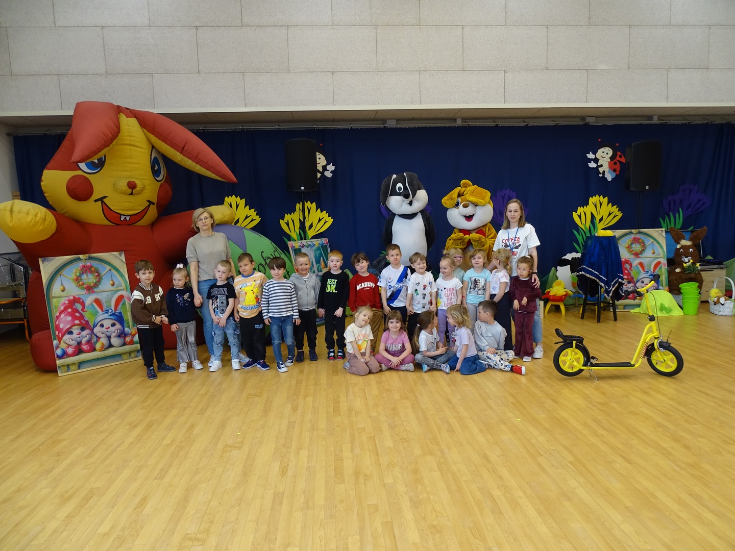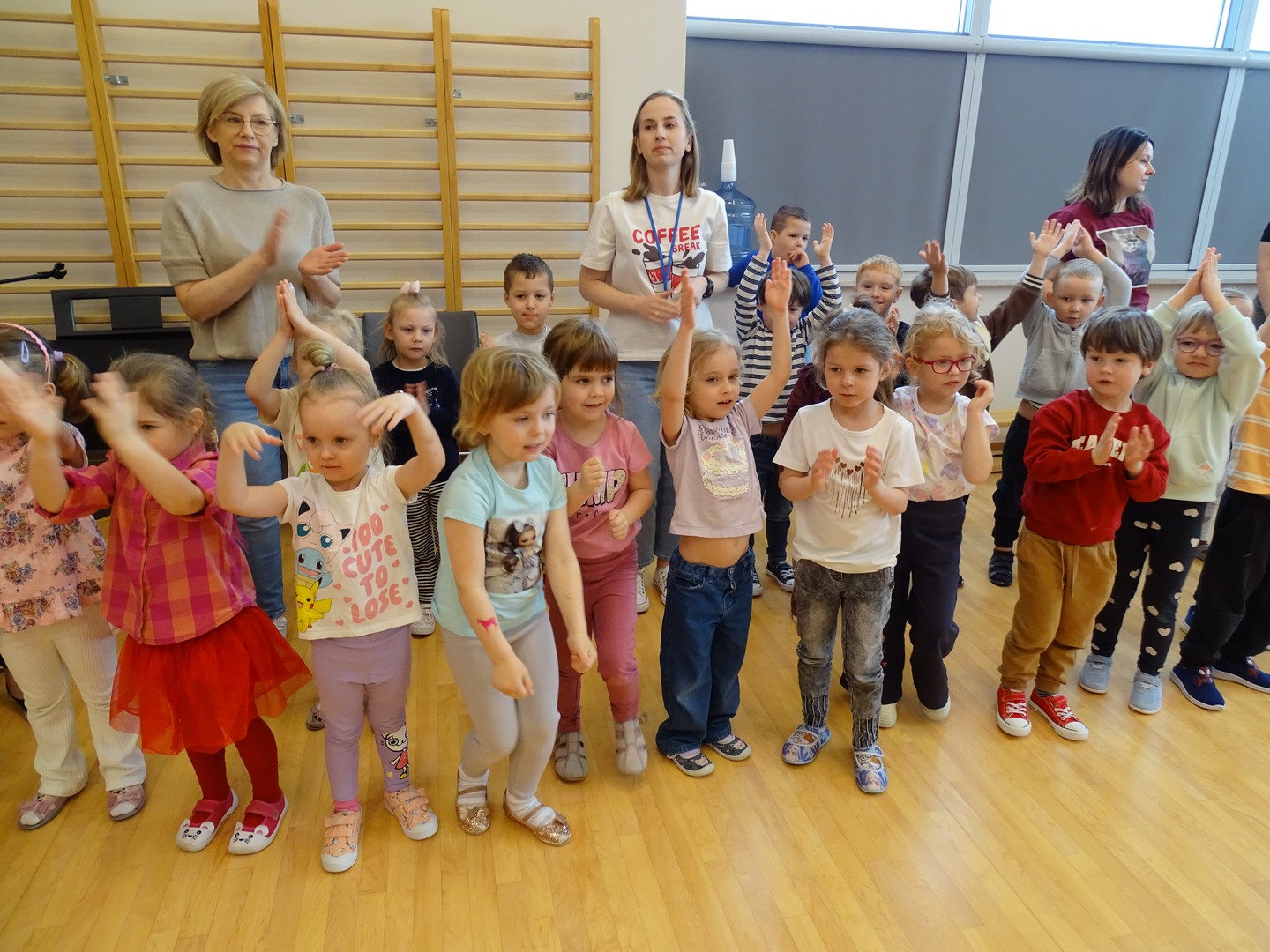 31 marca 2026r. w naszym przedszkolu odbyły się zabawy z zajączkiem prowadzone przez animatorów Rytmix. Była to interaktywna aktywność muzyczno-ruchowa, idealna na Wielkanoc, łącząca śpiew, taniec i liczenie. Dzieci naśladowały skoki zajączka, szukały ukrytych pisanek i marchewek oraz rytmicznie poruszały się do muzyki.