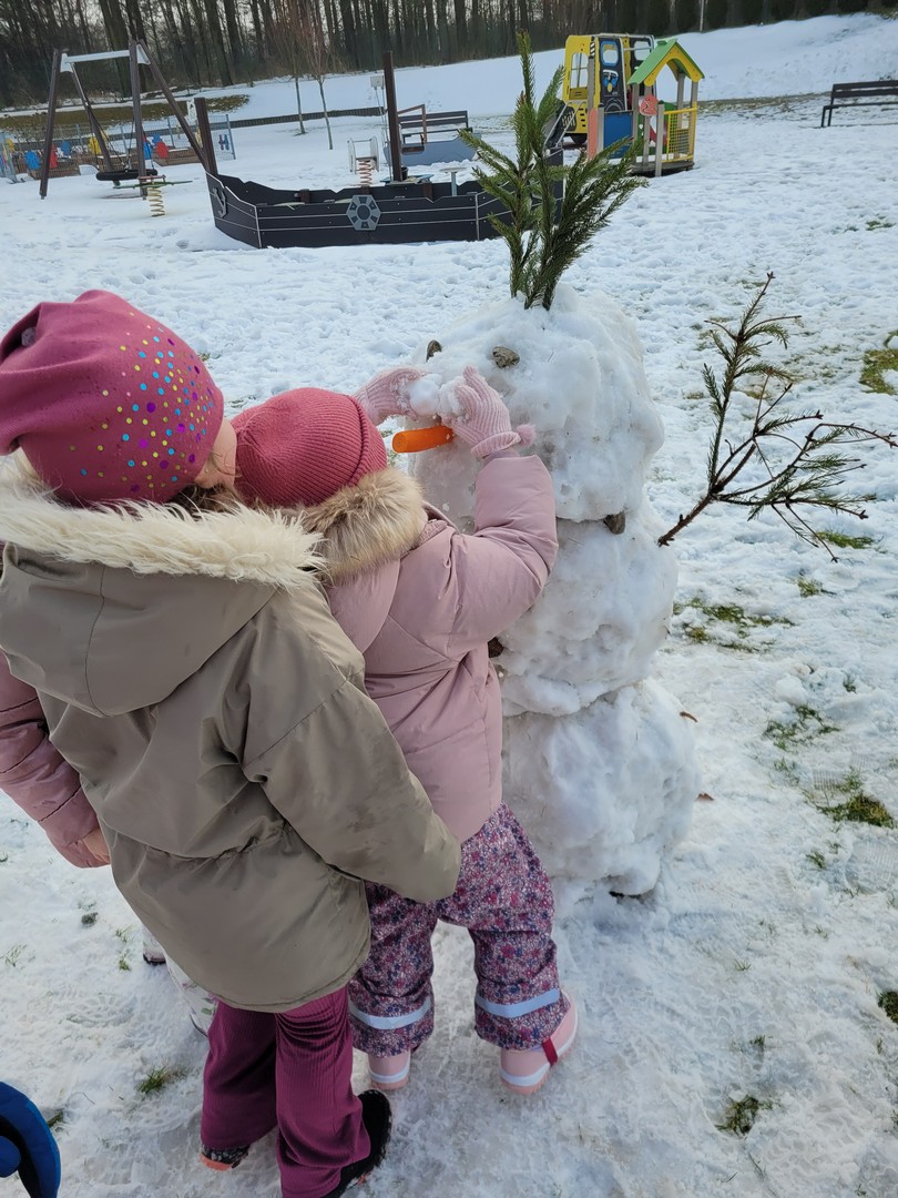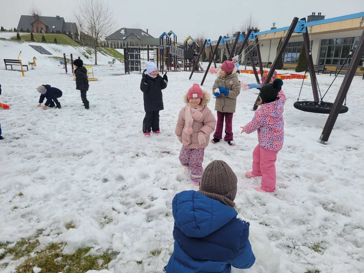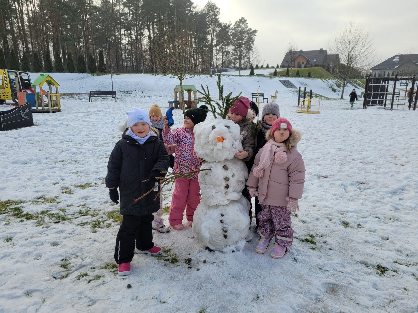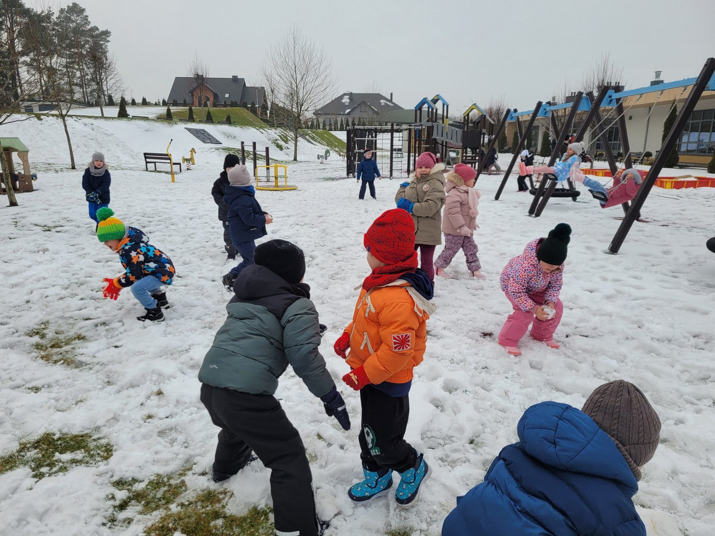 Dzieci z grupy „Sówki” wybrały się na przedszkolny plac zabaw, aby uzupełnić karmę w karmnikach dla ptaszków oraz zawiesić dla nich słoninkę. W ten sposób „Sówki” uczą się empatii i tego, jak ważna jest pomoc leśnym ptakom w czasie zimy i mrozu. Po dobrym uczynku przyszedł czas na zimowe zabawy – były harce na śniegu, rzucanie śnieżkami oraz oczywiście lepienie bałwana. To była naprawdę super zabawa.