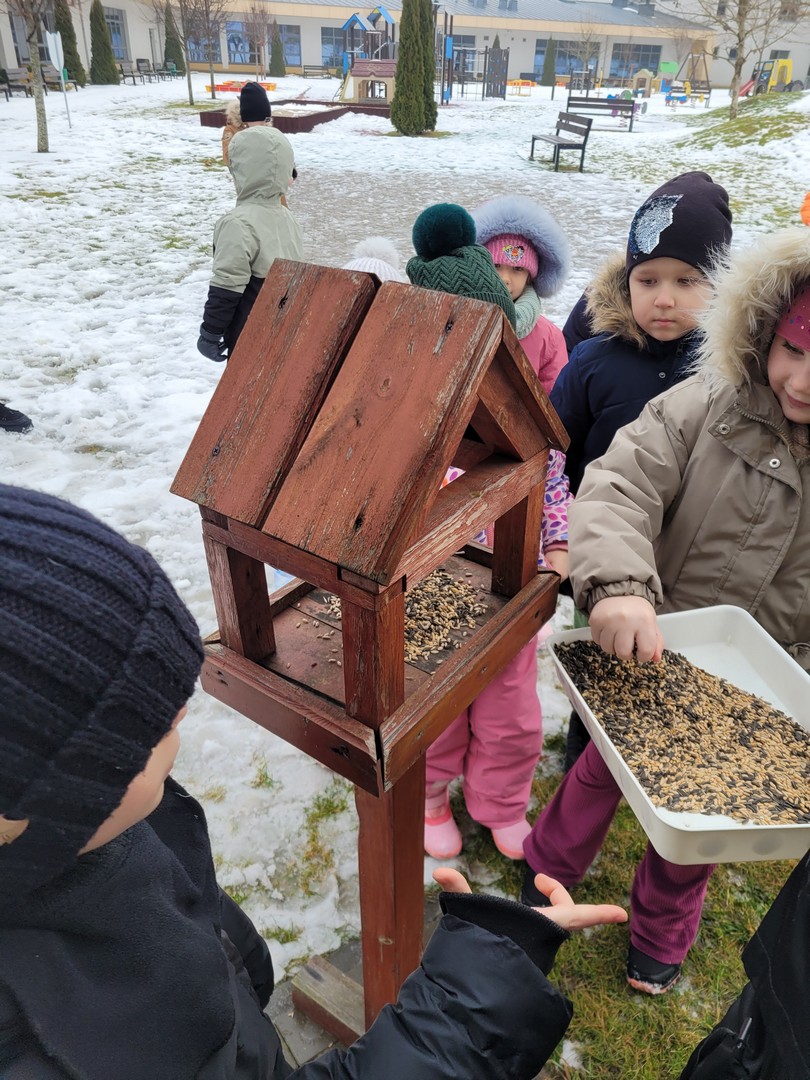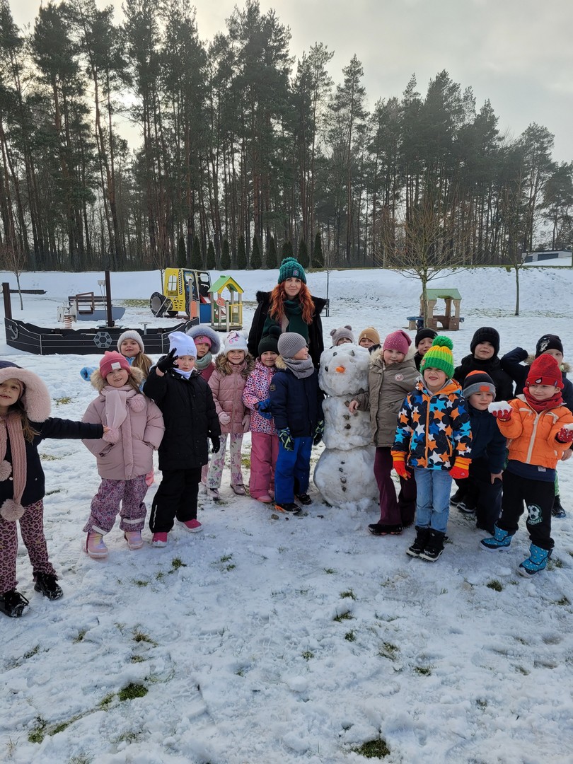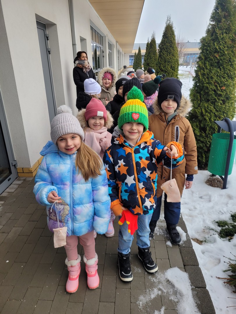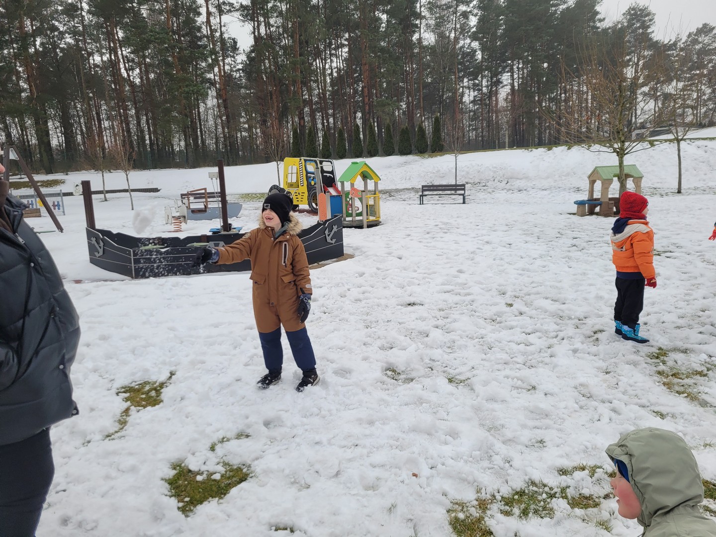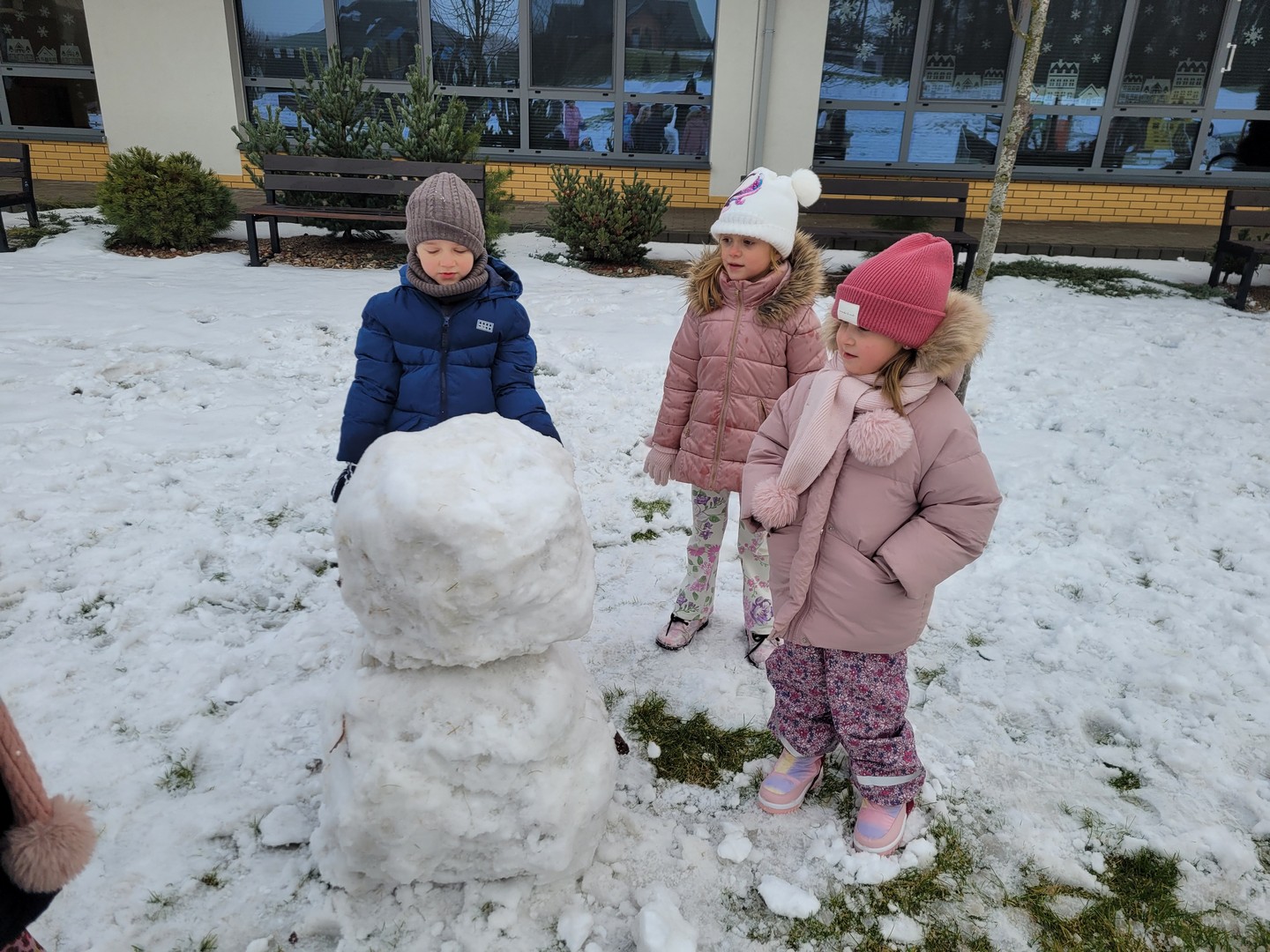 Dzieci z grupy „Sówki” wybrały się na przedszkolny plac zabaw, aby uzupełnić karmę w karmnikach dla ptaszków oraz zawiesić dla nich słoninkę. W ten sposób „Sówki” uczą się empatii i tego, jak ważna jest pomoc leśnym ptakom w czasie zimy i mrozu. Po dobrym uczynku przyszedł czas na zimowe zabawy – były harce na śniegu, rzucanie śnieżkami oraz oczywiście lepienie bałwana. To była naprawdę super zabawa.