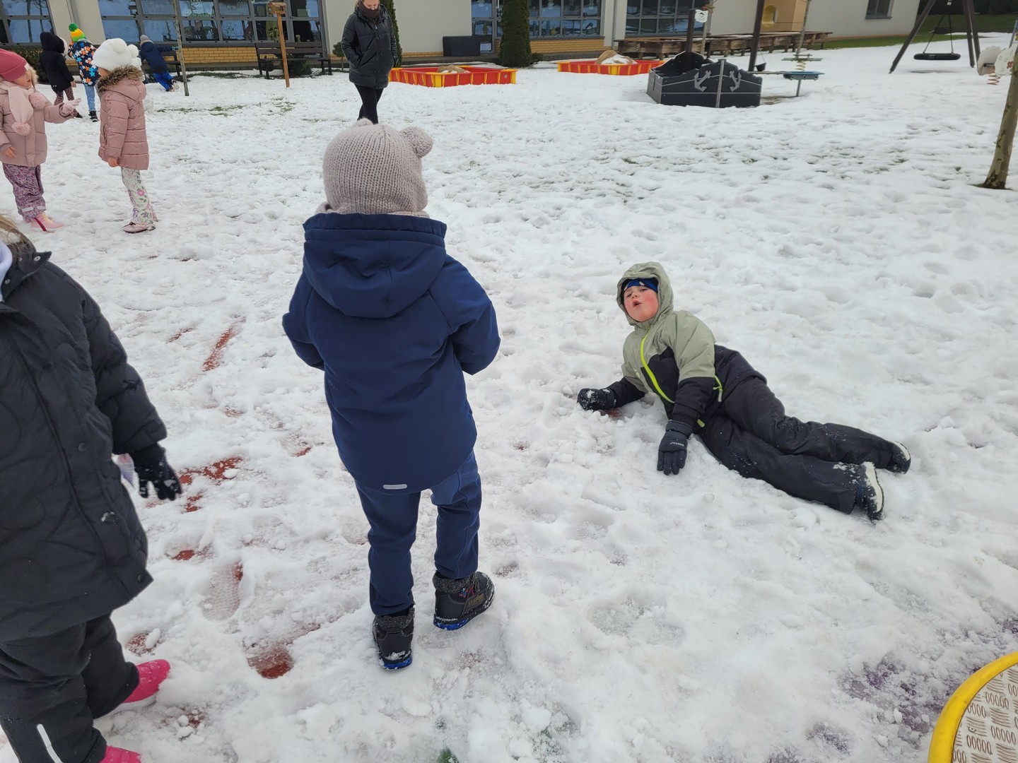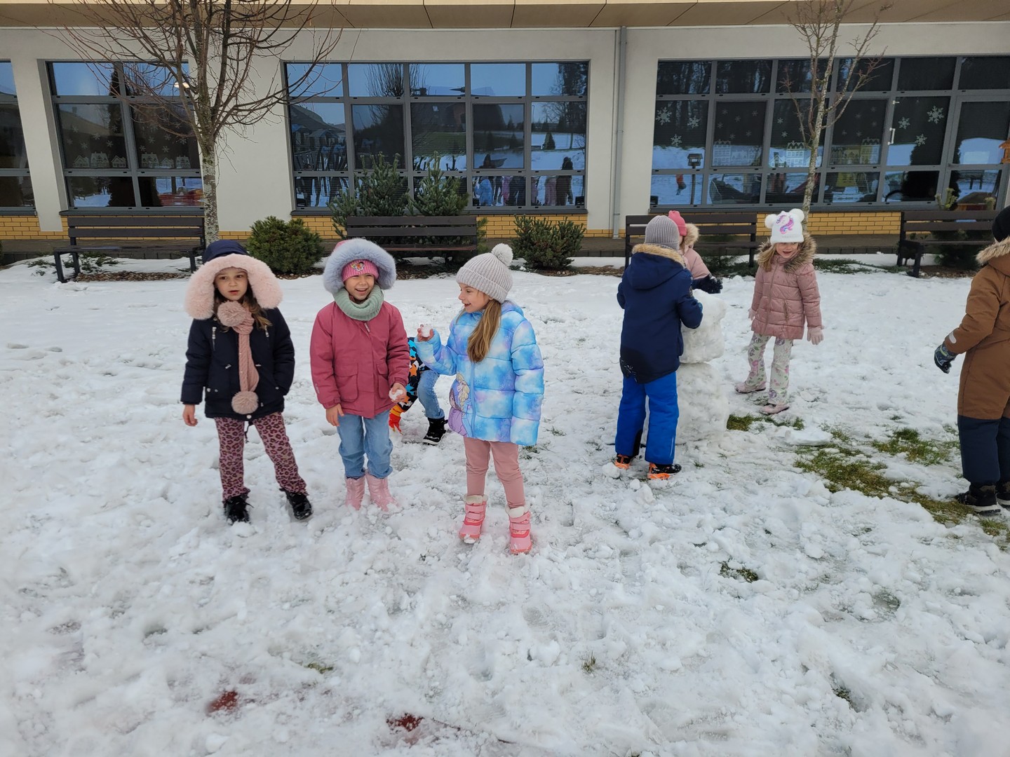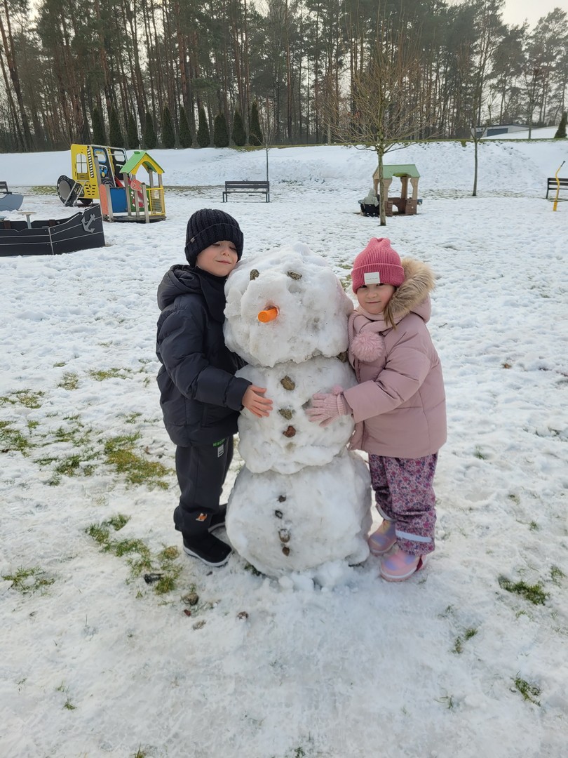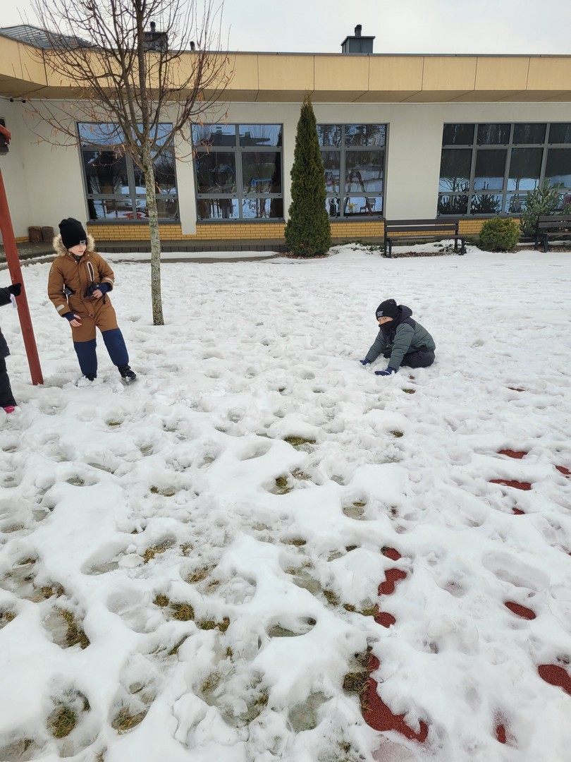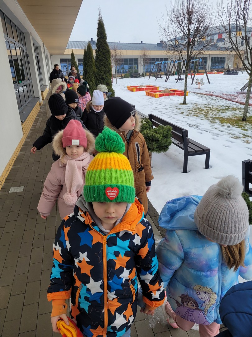 Dzieci z grupy „Sówki” wybrały się na przedszkolny plac zabaw, aby uzupełnić karmę w karmnikach dla ptaszków oraz zawiesić dla nich słoninkę. W ten sposób „Sówki” uczą się empatii i tego, jak ważna jest pomoc leśnym ptakom w czasie zimy i mrozu. Po dobrym uczynku przyszedł czas na zimowe zabawy – były harce na śniegu, rzucanie śnieżkami oraz oczywiście lepienie bałwana. To była naprawdę super zabawa.